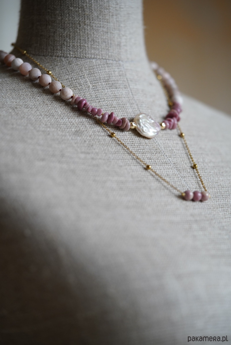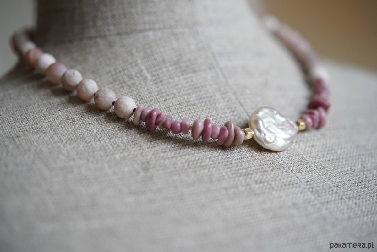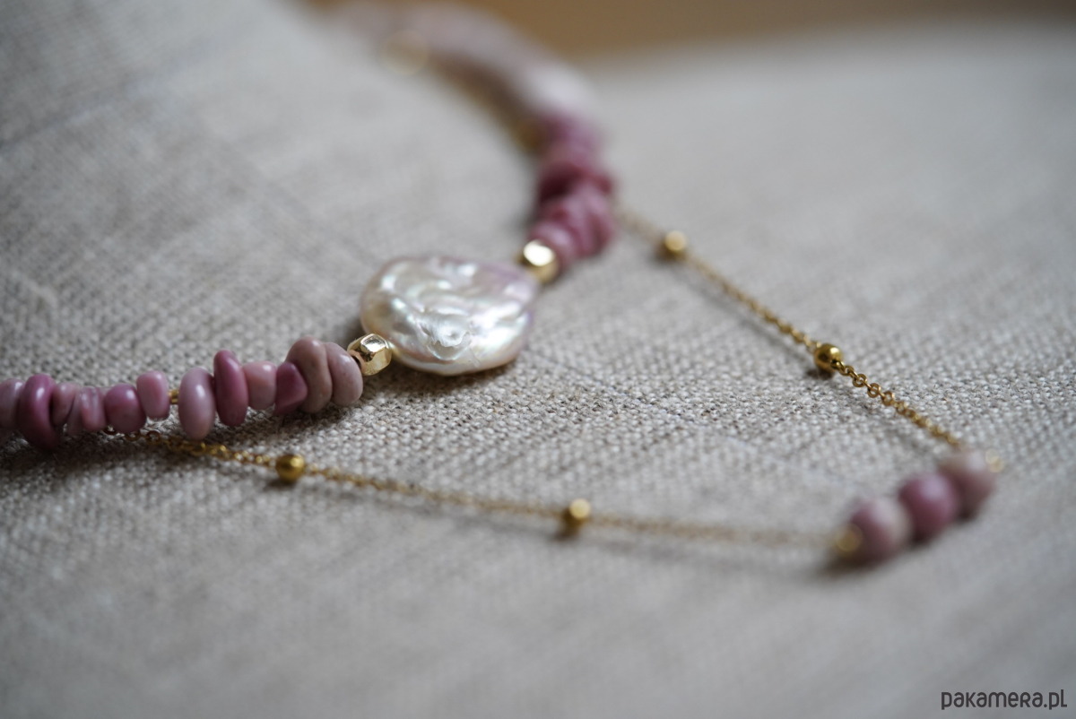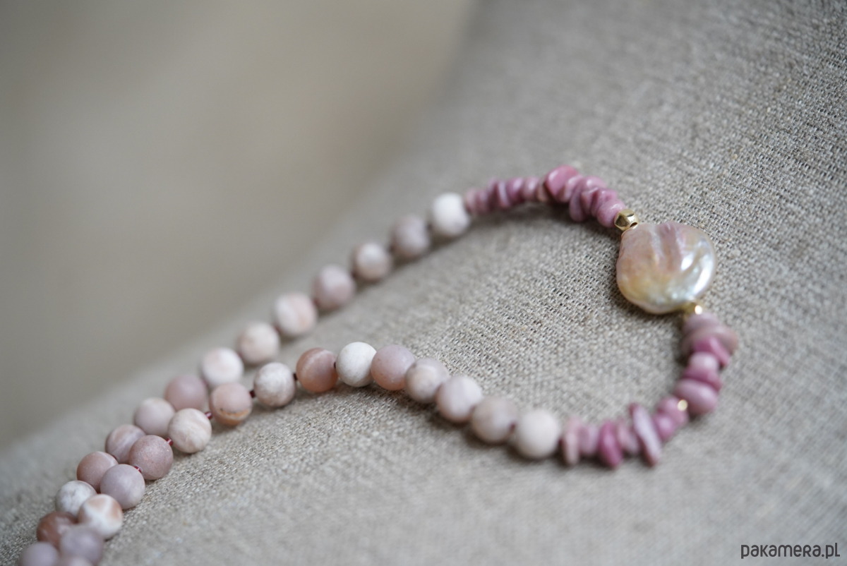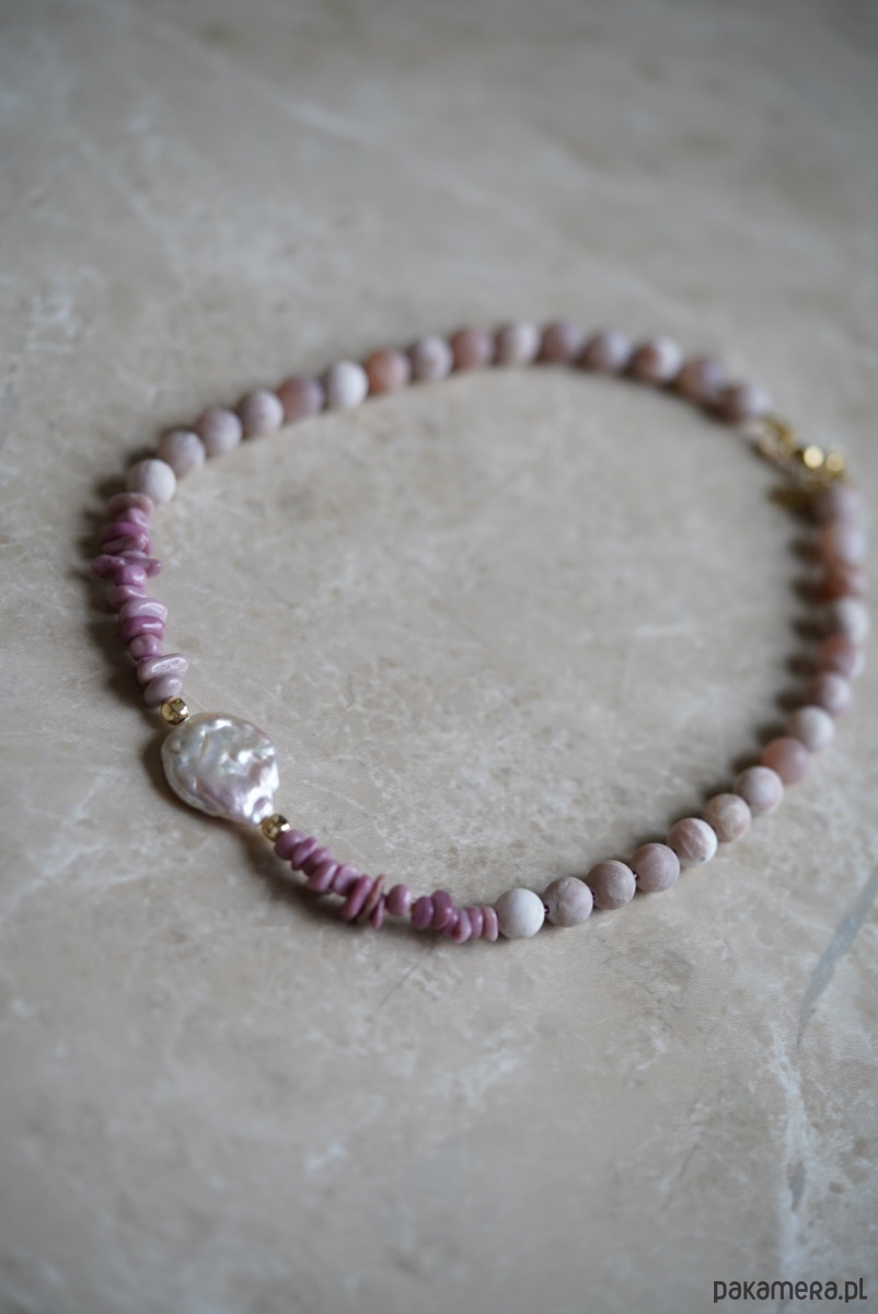 Autorsko komponowany naszyjnik, który łączy w sobie naturalne piękno różowego rodonitu , kamienia słonecznego z elegancją pozłacanego srebra próby 925, a w roli głównej występuje naturalna, nieregularna perła .