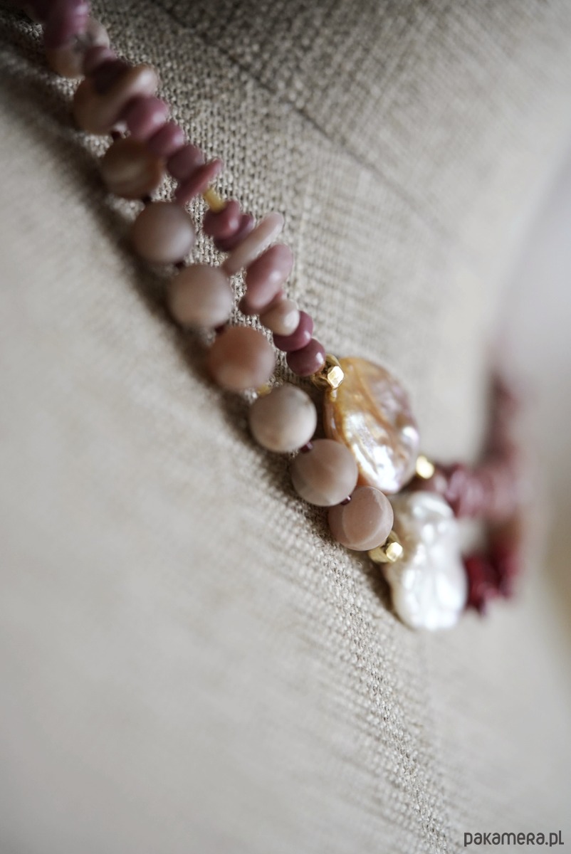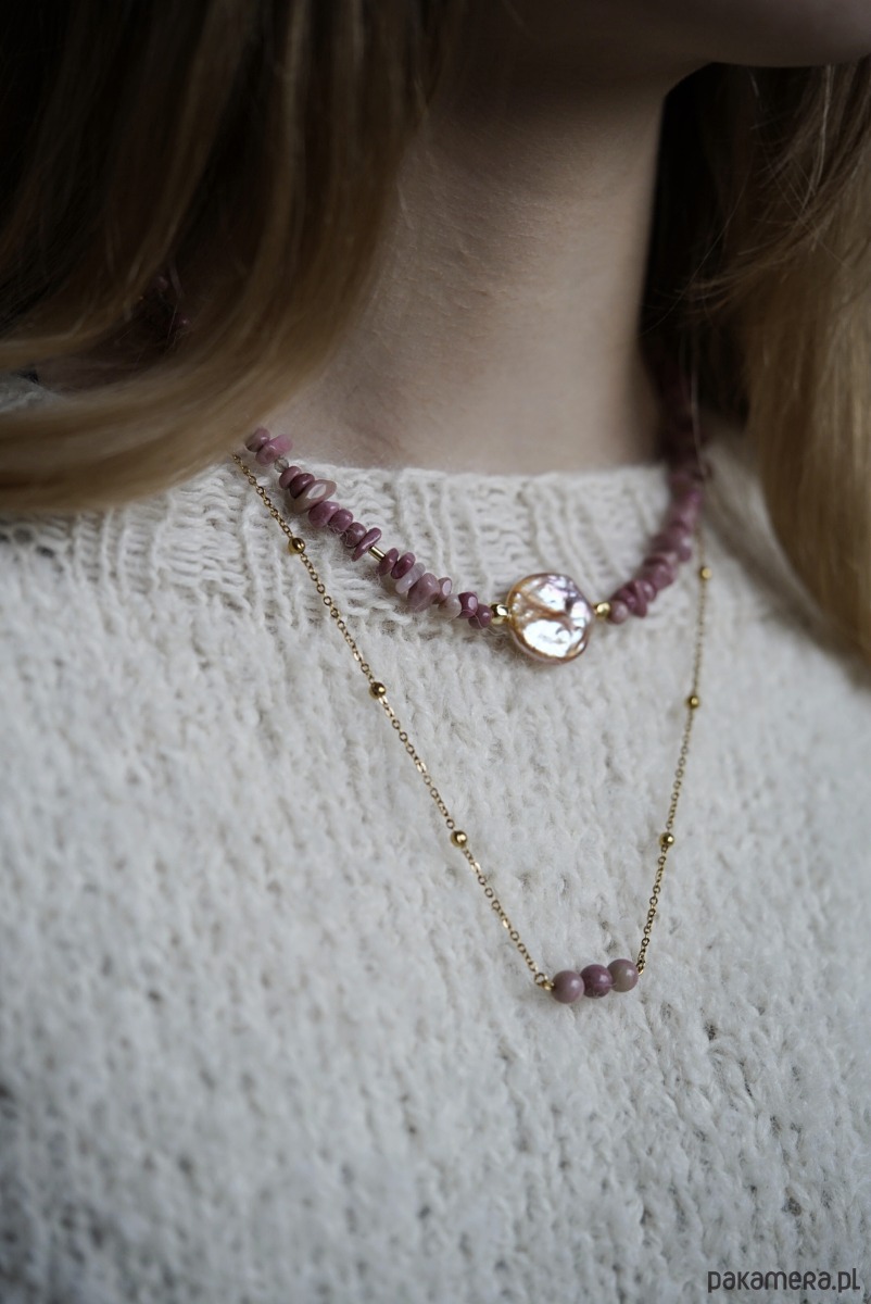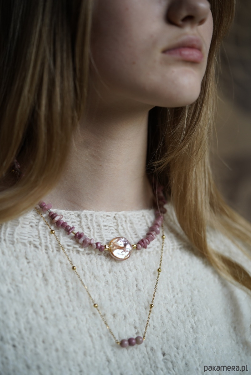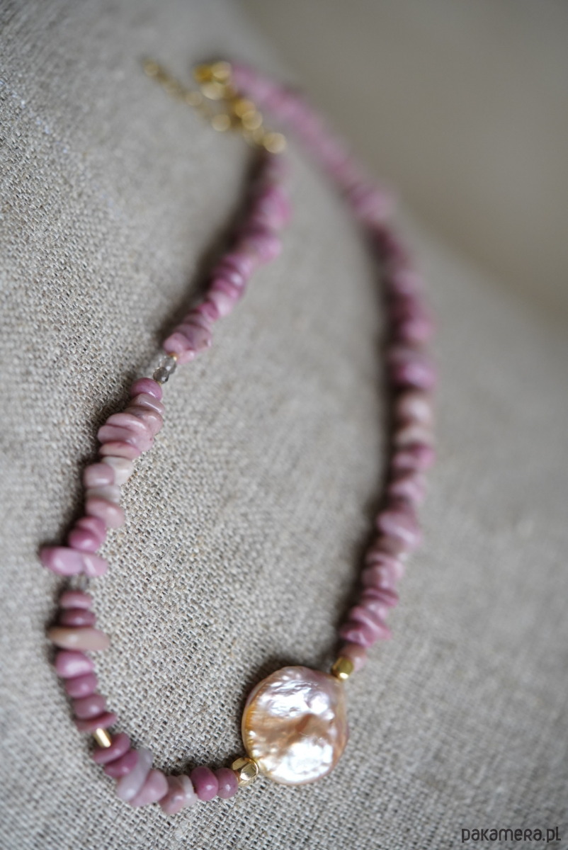 Autorsko komponowany naszyjnik, który łączy w sobie naturalne piękno różowego rodonitu z elegancją pozłacanego srebra próby 925, a w roli głównej występuje naturalna, nieregularna perła .