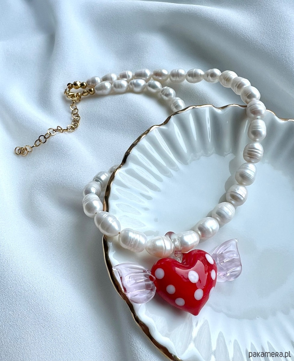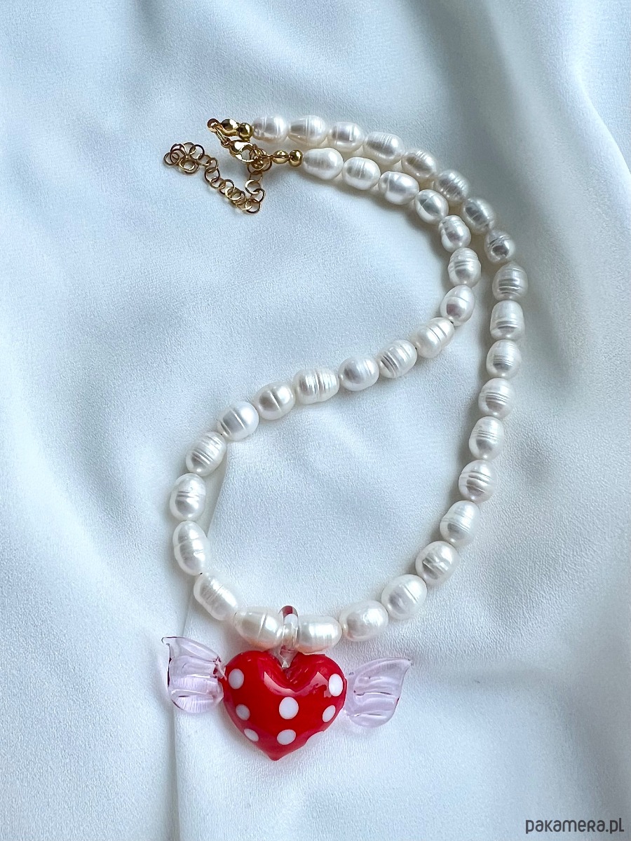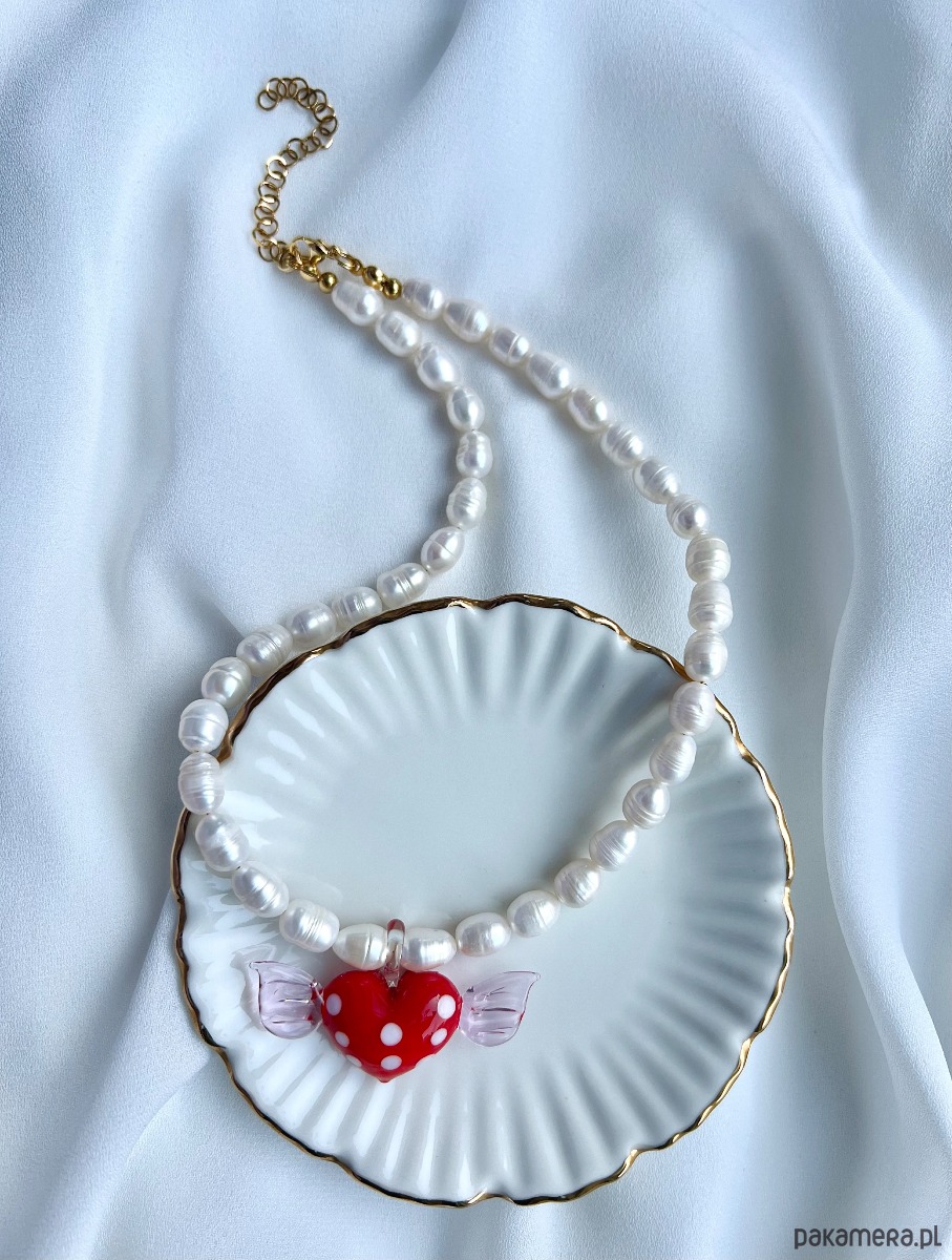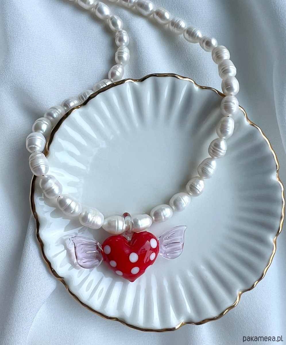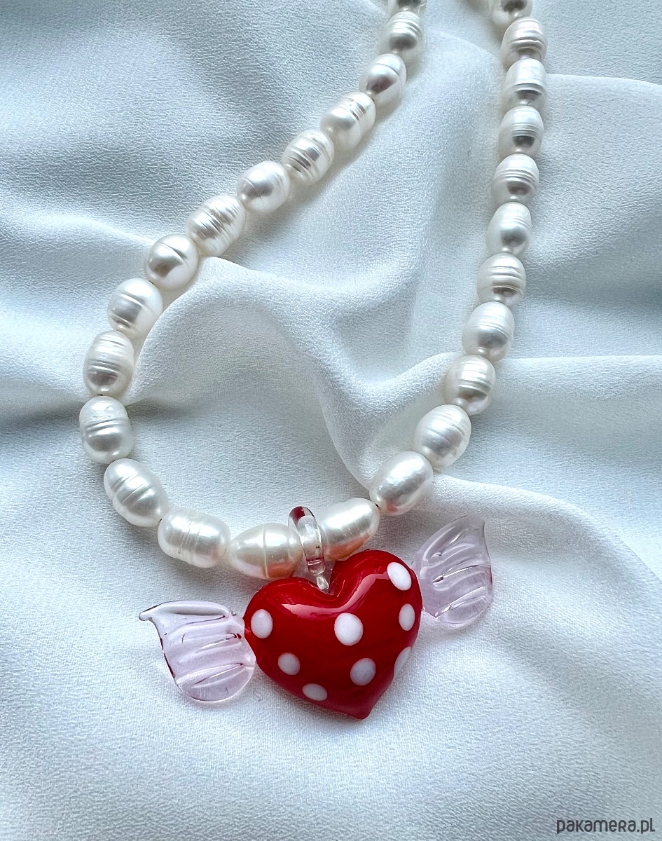 Wykonany jest z pereł naturalnych hodowlanych oraz stali. Całość dopełnia piękna zawieszka - skrzydlate serduszko w groszki wykonane ze szkła.