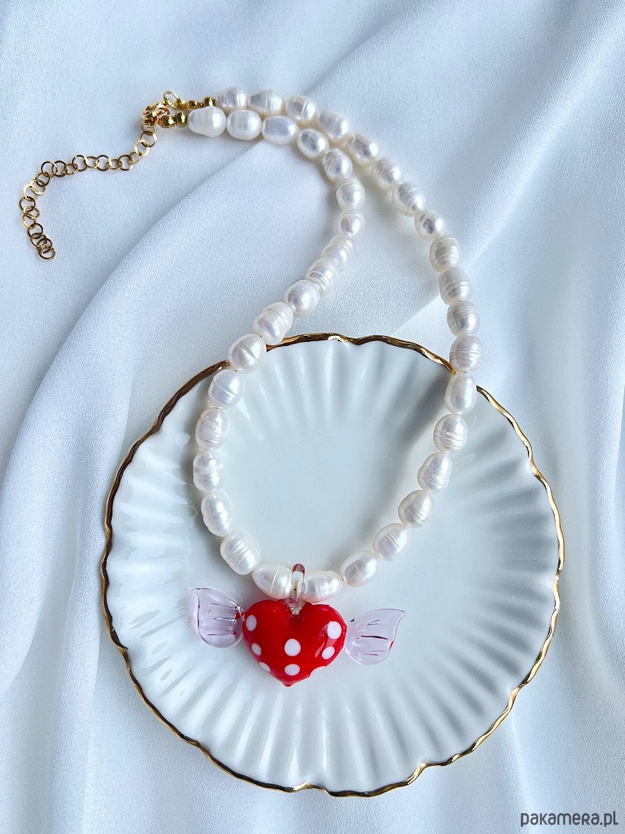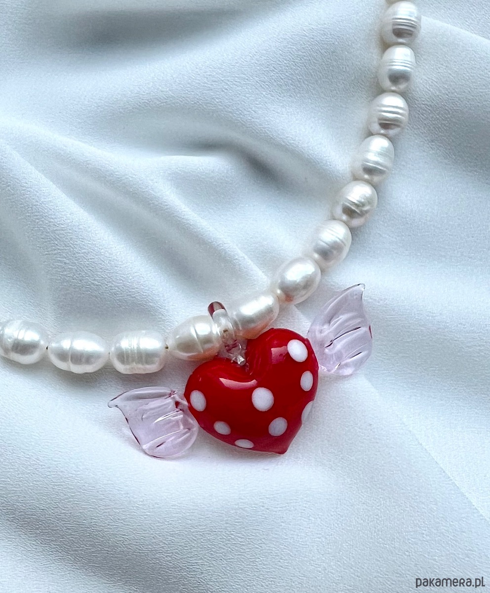 Wykonany jest z pereł naturalnych hodowlanych oraz stali. Całość dopełnia piękna zawieszka - skrzydlate serduszko w groszki wykonane ze szkła.