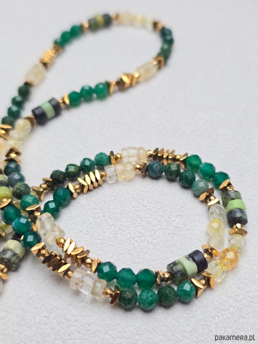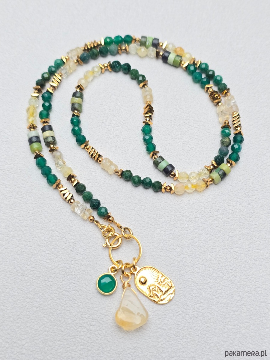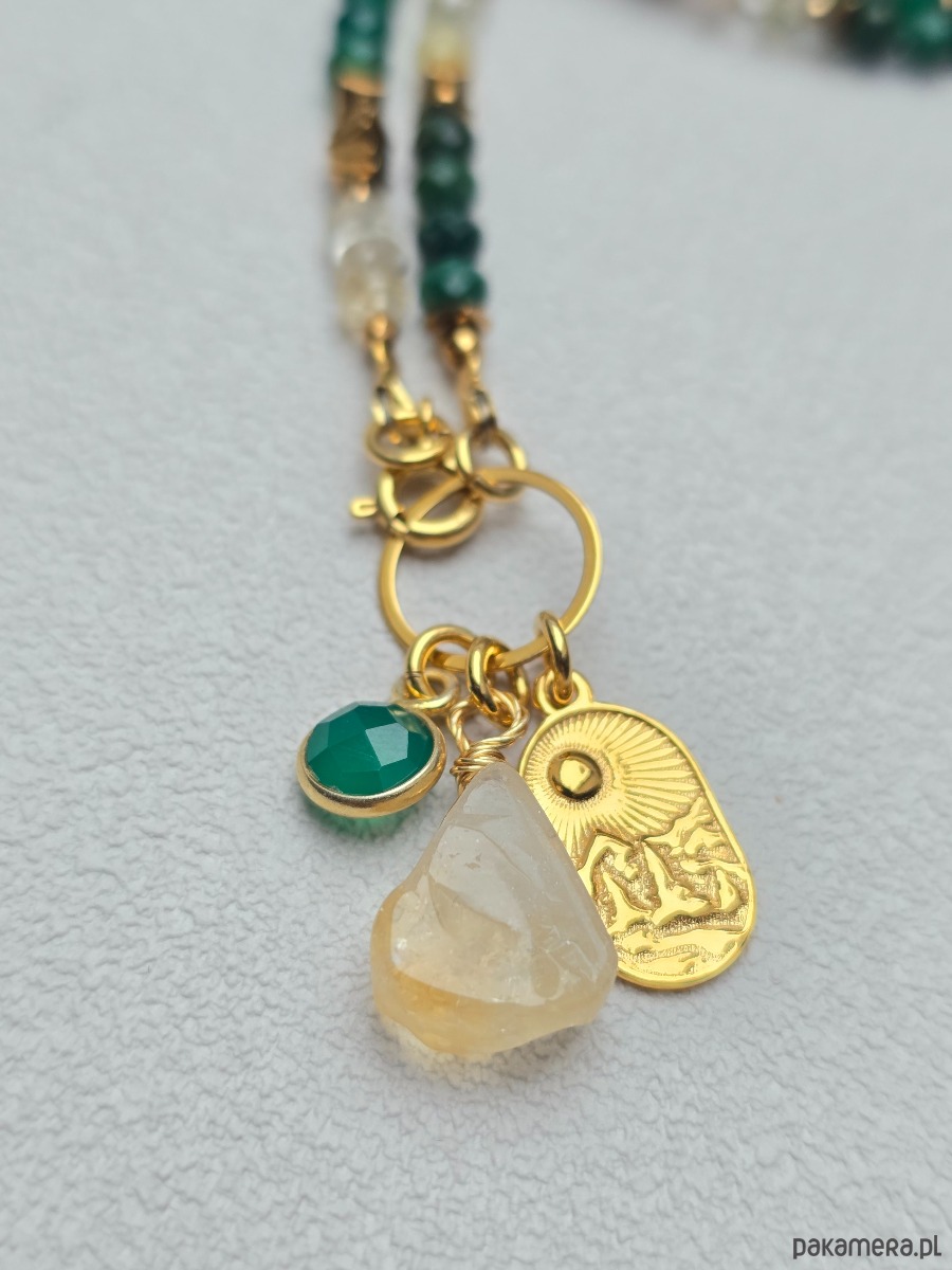 Wykorzystane kamienie: nefryt, zielony onyks, cytryn, jaspis, złocony hematyt.