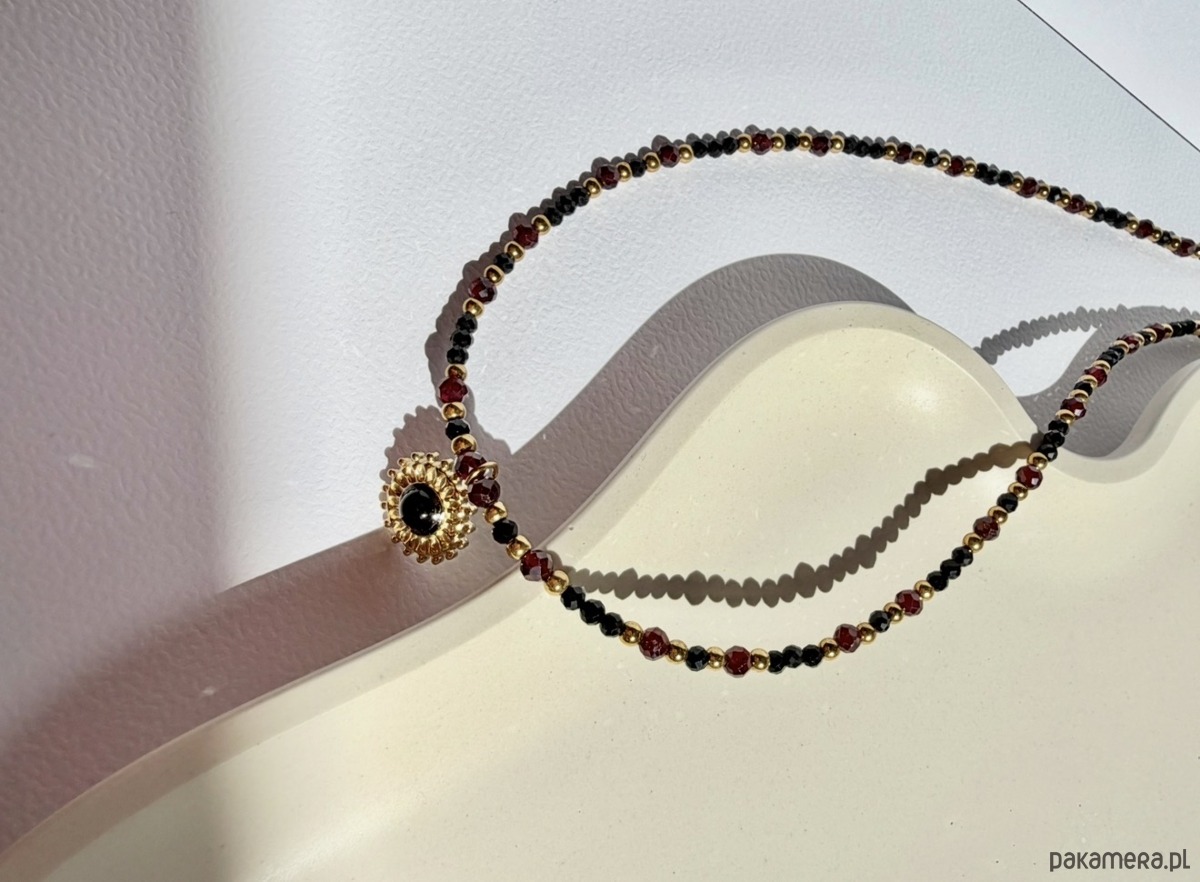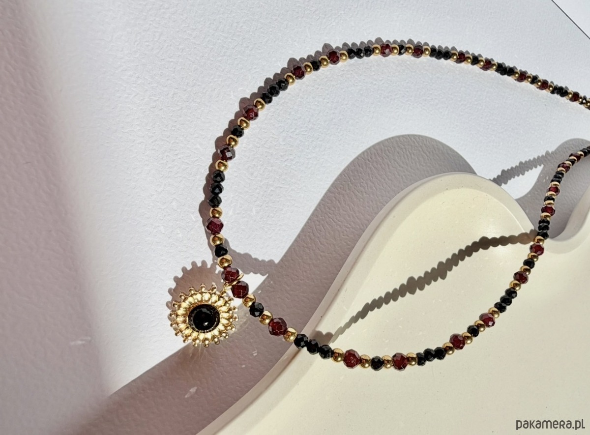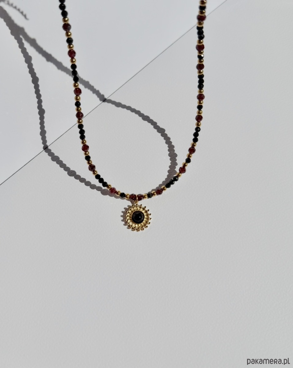 Naszyjnik z turmalinem, granatem, onyksem i hematytem.