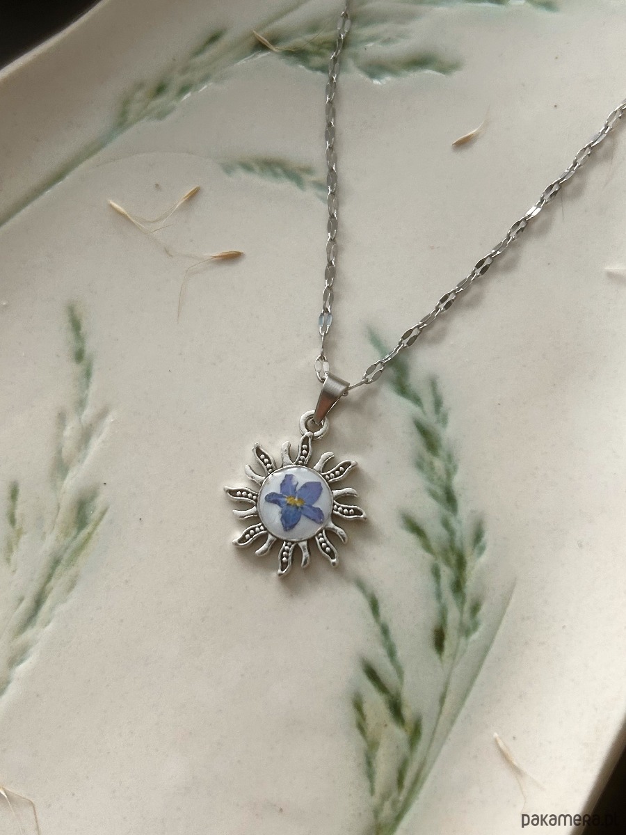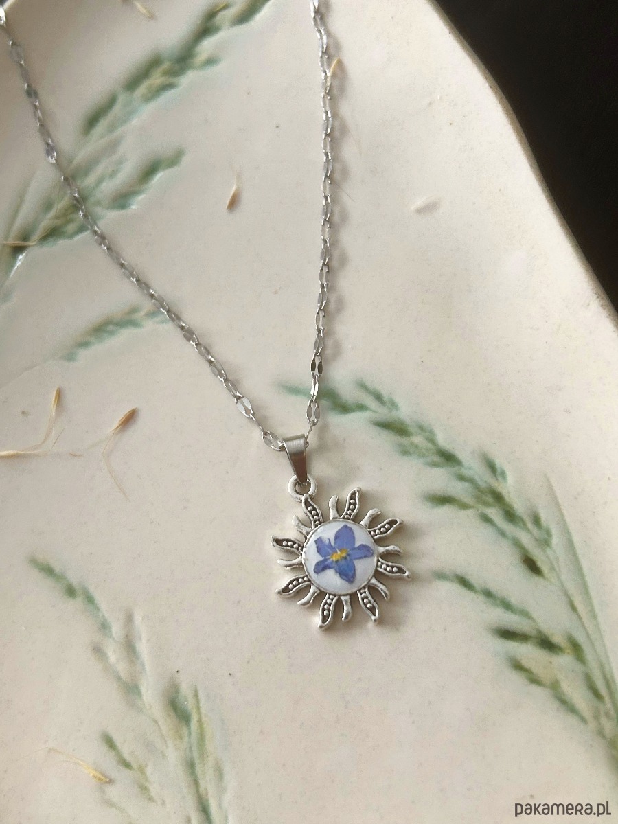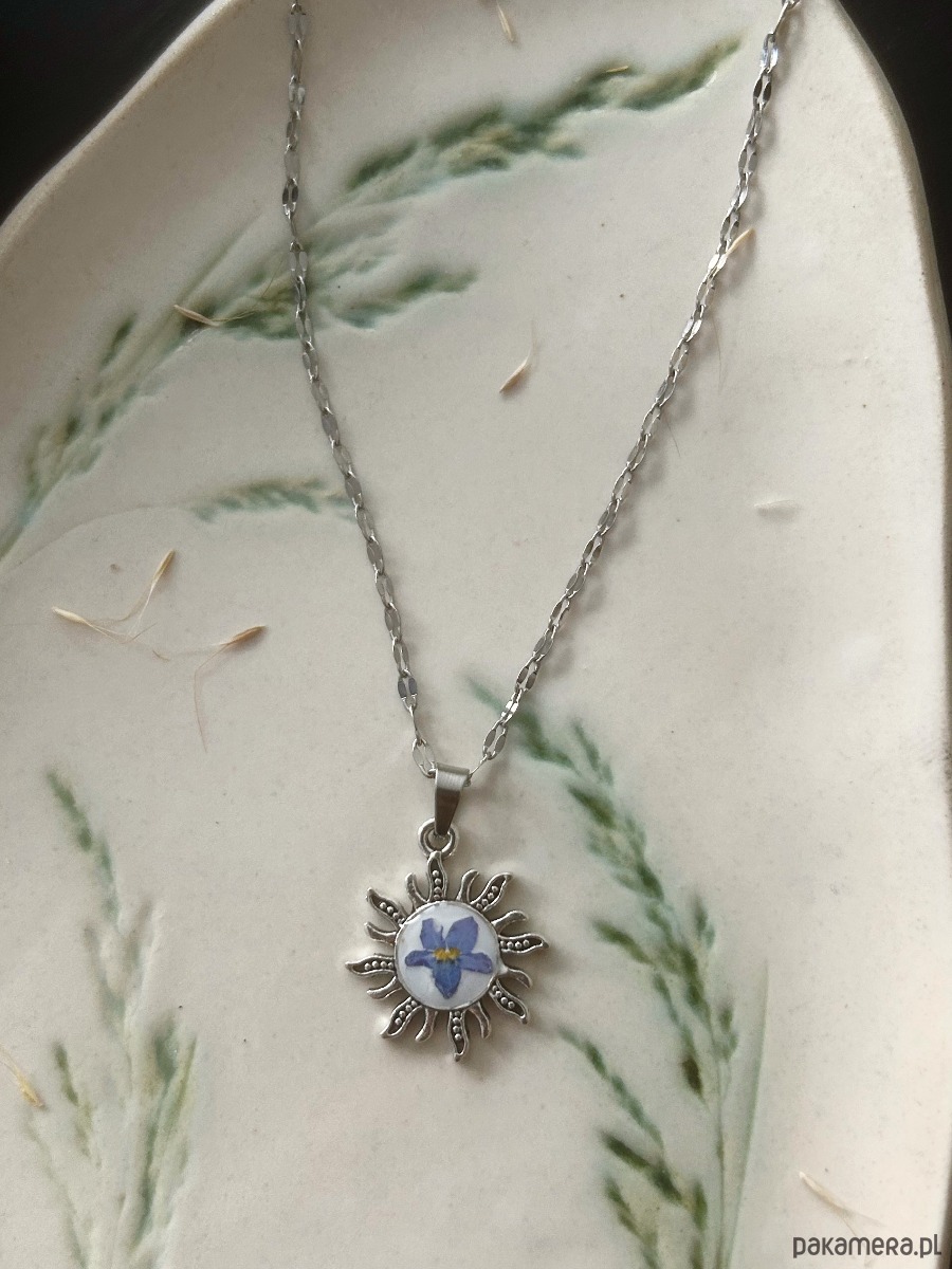 Naszyjnik z zawieszka w kształcie słońca , w którego centrum znajduje się niezapominajka zatopiona w żywicy.