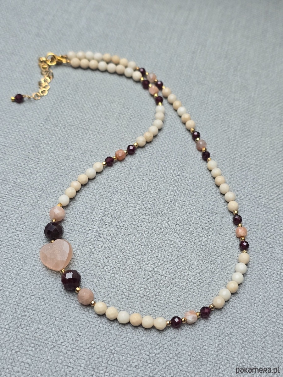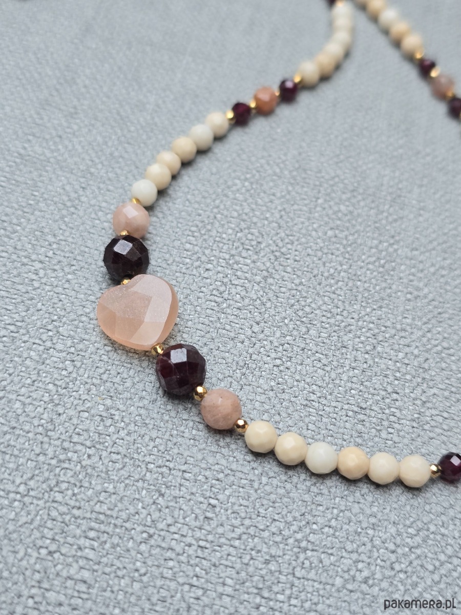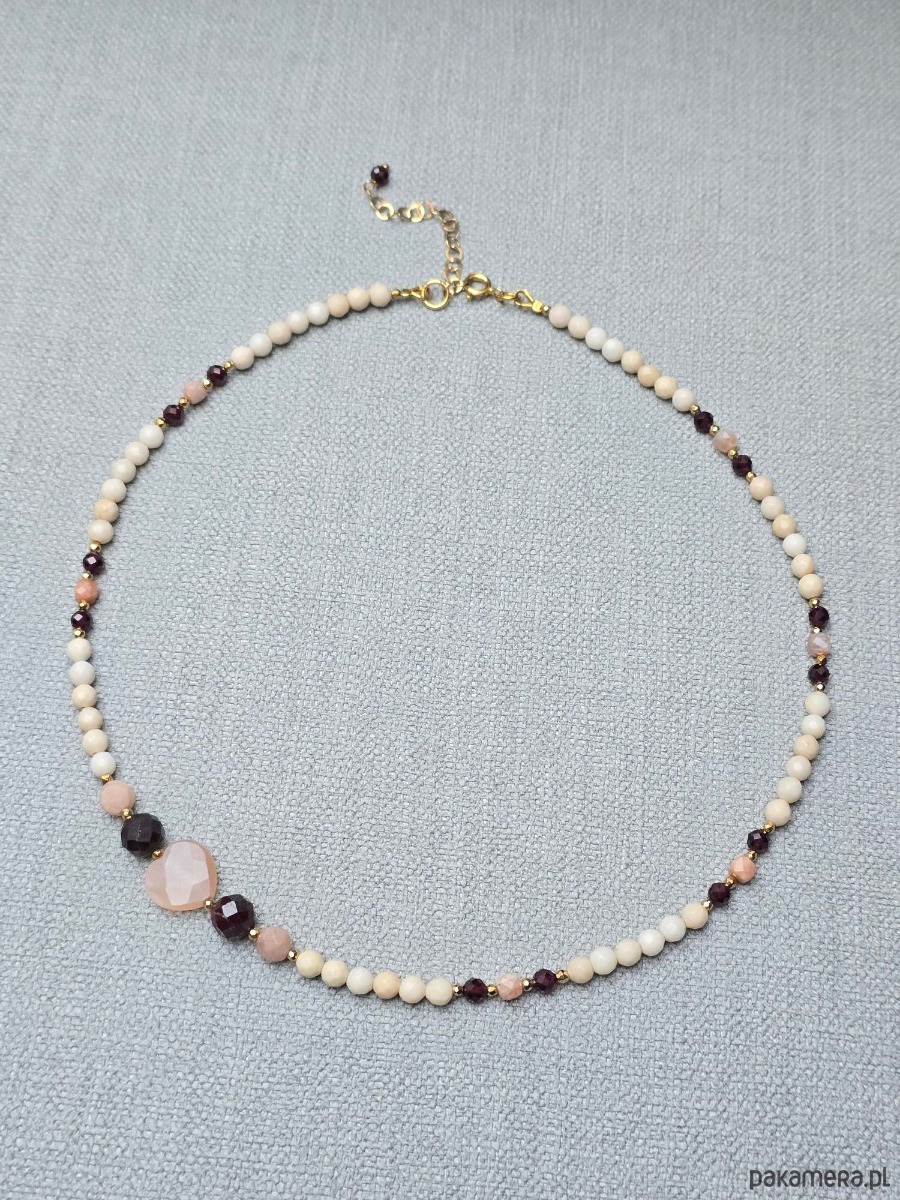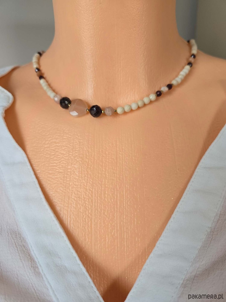 Krótszy naszyjnik wykonany z kamienia rzecznego, granatu i kamienia słonecznego.