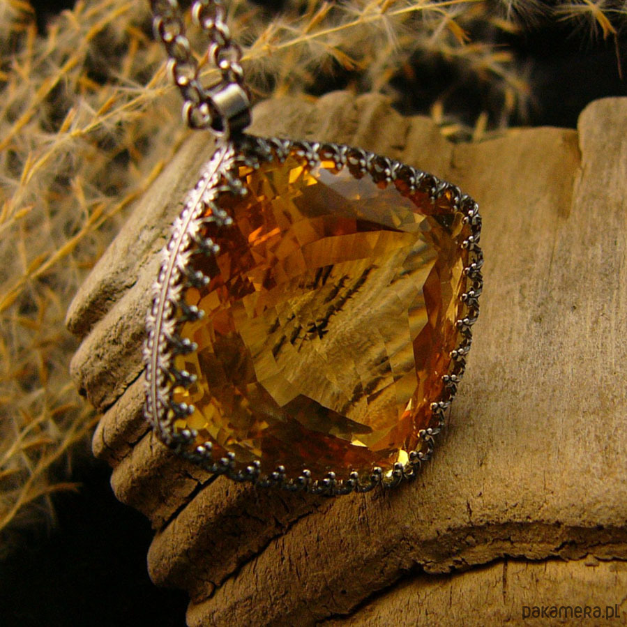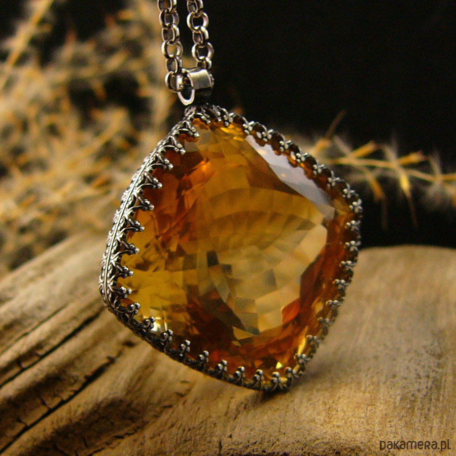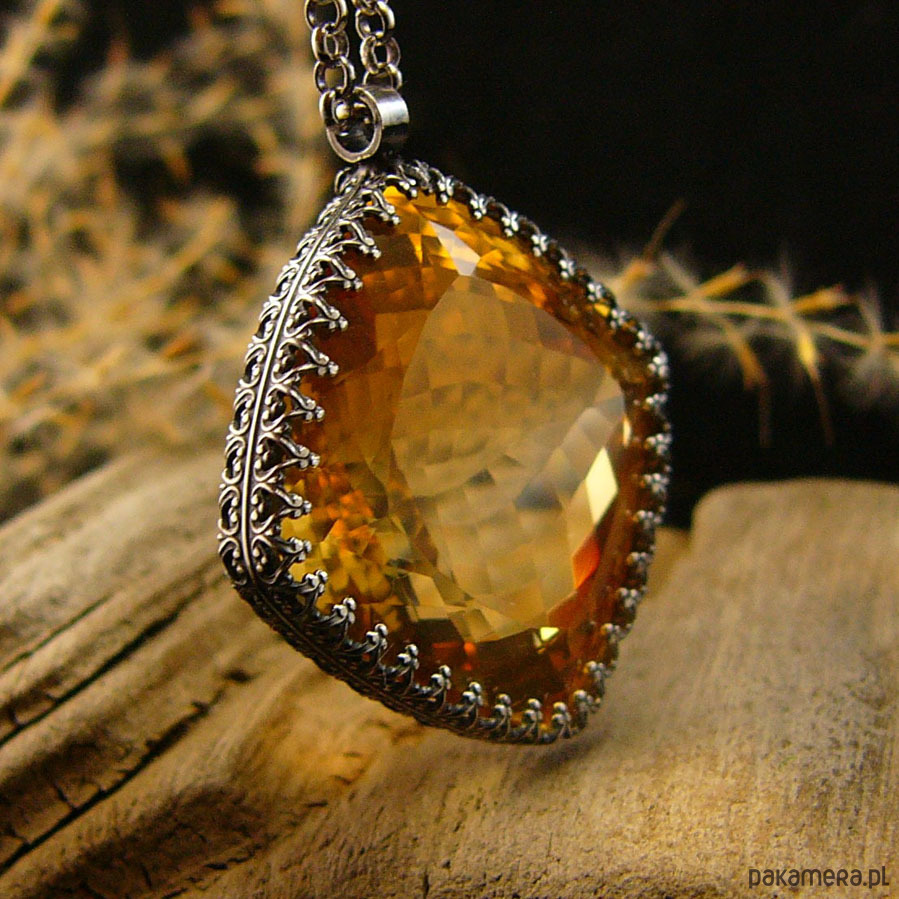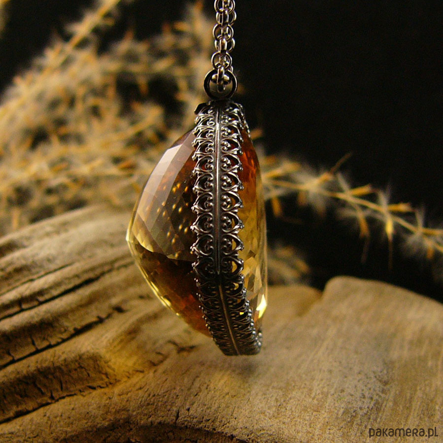 Naszyjnik którego sercem jest przepięknej urody ogromny Cytryn o niesamowitym szlifie otulony w srebrne koronki. Wisior jest dwustronny. Całość wykonana ręcznie na srebrze próby 925, oksydowana przetarta i wypolerowana na wysoki połysk. Długość całkowita wisiora 3,4 cm, szerokość 3 cm. Łańcuszek o długości 70 cm w tym 5 cm regulacji. Cytryn jest kamieniem bogactwa materialnego do tego łagodzi gniew i zachowuje równowagę yin-yang. Jest również kamieniem dobrego samopoczucia. Naszyjnik jest Unikatem.