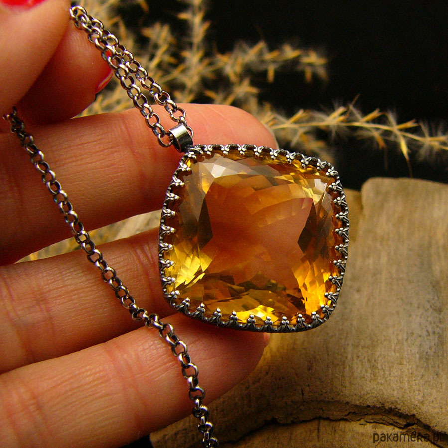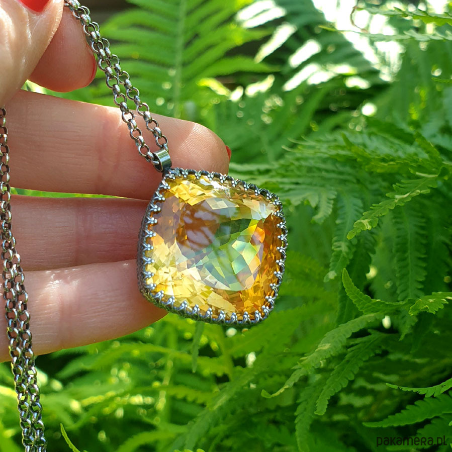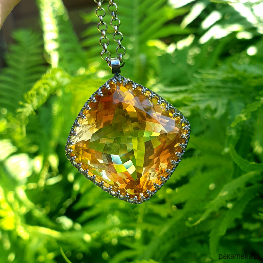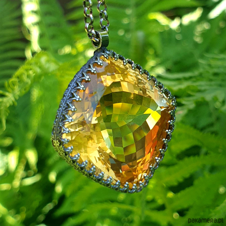 Naszyjnik którego sercem jest przepięknej urody ogromny Cytryn o niesamowitym szlifie otulony w srebrne koronki. Wisior jest dwustronny. Całość wykonana ręcznie na srebrze próby 925, oksydowana przetarta i wypolerowana na wysoki połysk. Długość całkowita wisiora 3,4 cm, szerokość 3 cm. Łańcuszek o długości 70 cm w tym 5 cm regulacji. Cytryn jest kamieniem bogactwa materialnego do tego łagodzi gniew i zachowuje równowagę yin-yang. Jest również kamieniem dobrego samopoczucia. Naszyjnik jest Unikatem.