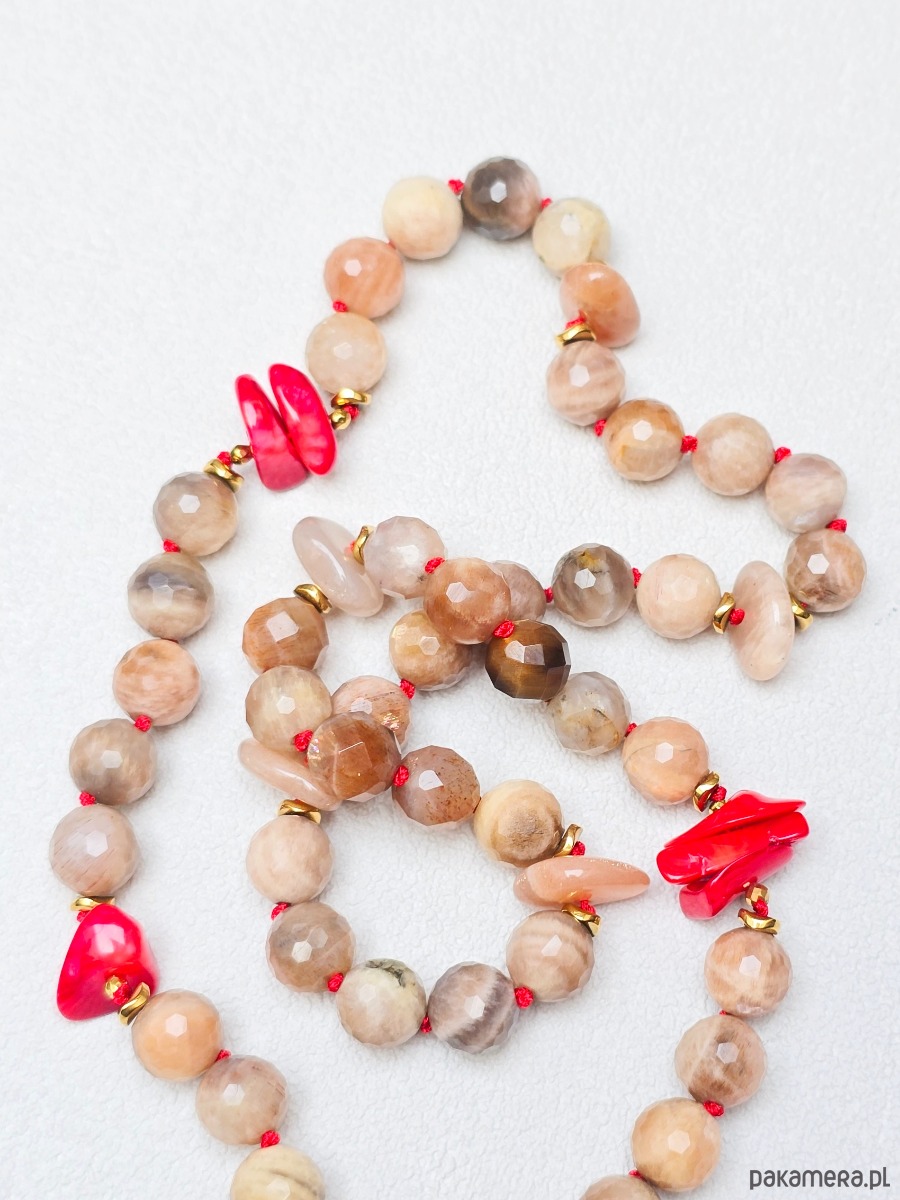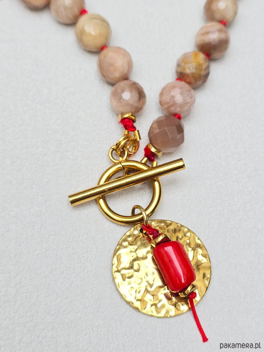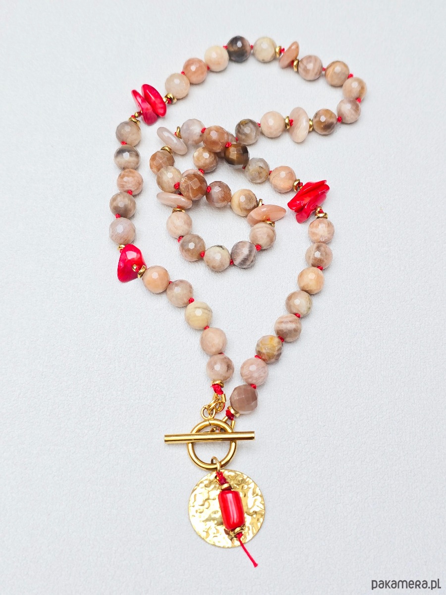 Wykonany z dysków i fasetowanych, okrągłych kamieni słonecznych oraz nieregularnego czerwonego korala. Zapinany z przodu na zapięcie typu toggle, do którego doczepiona jest okrągła młotkowana zawieszka z koralowym akcentem.