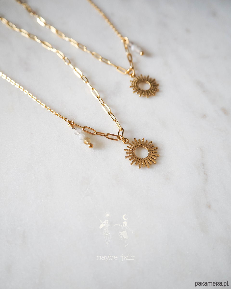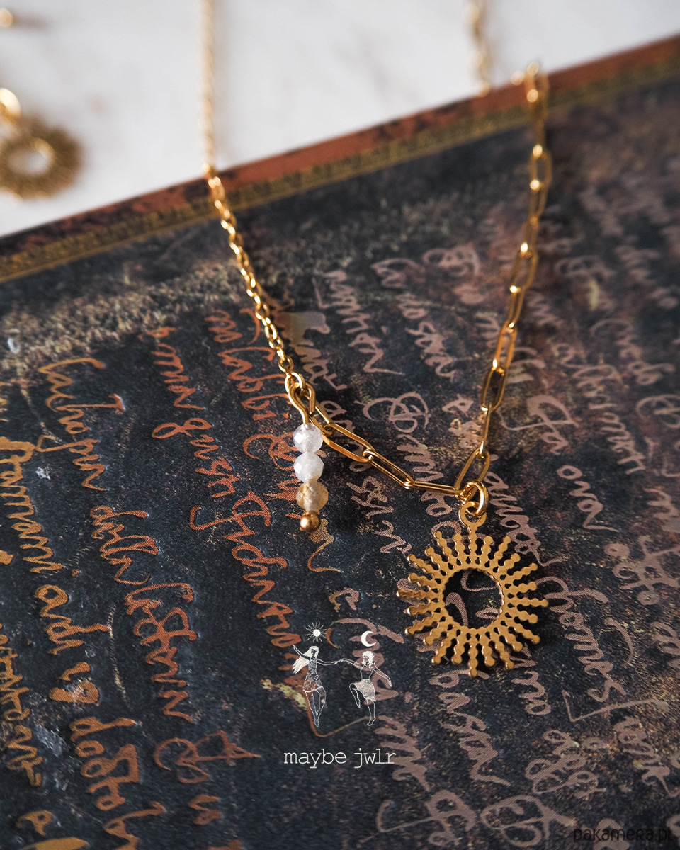 Na przodzie gra pierwsze skrzypce ręcznie wykonana zawieszka z labradorytem. Jego księżycowa, niebieska poświata dodaje subtelnej magii każdej stylizacji. Obok niego — drobne słoneczko, symbol ciepła, radości i dobrej energii. Nosząc je, masz przy sobie mały amulet na lepszy dzień.