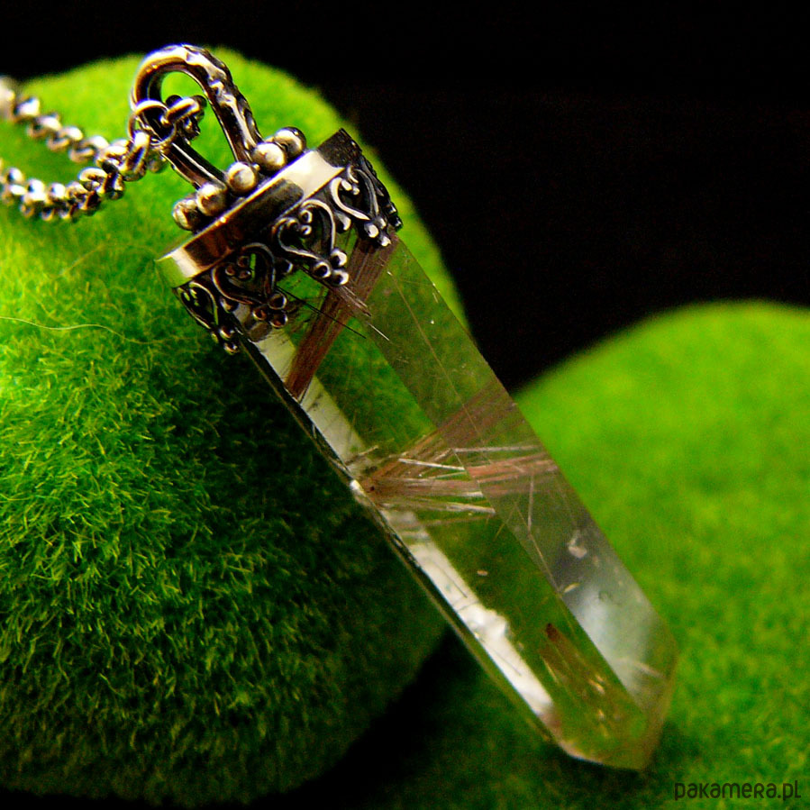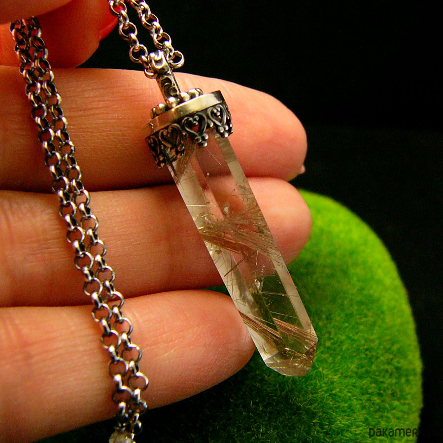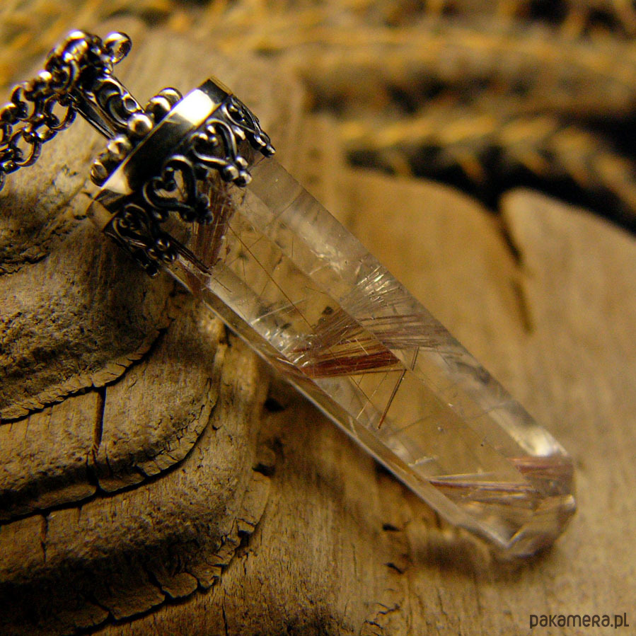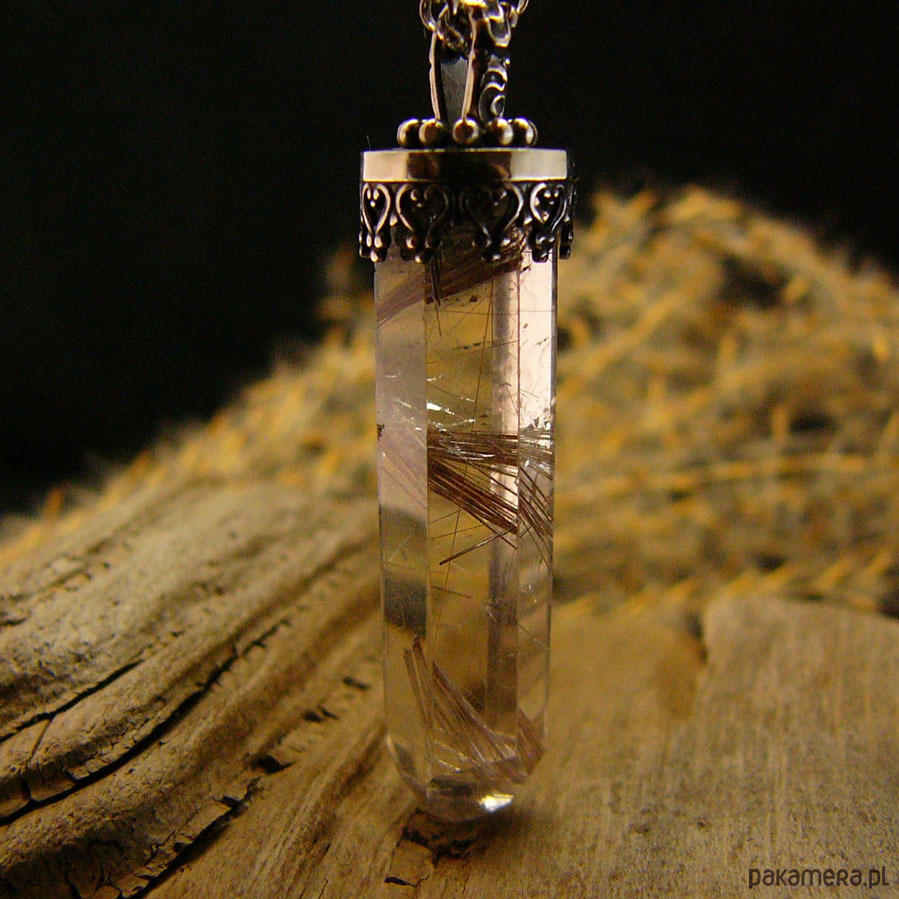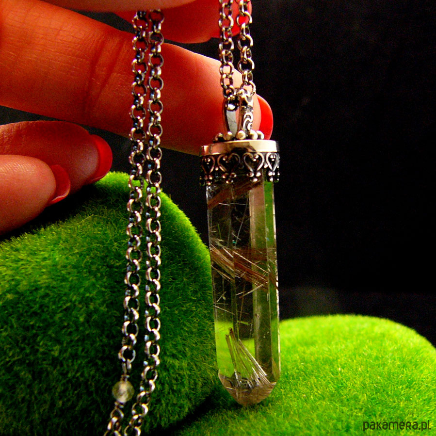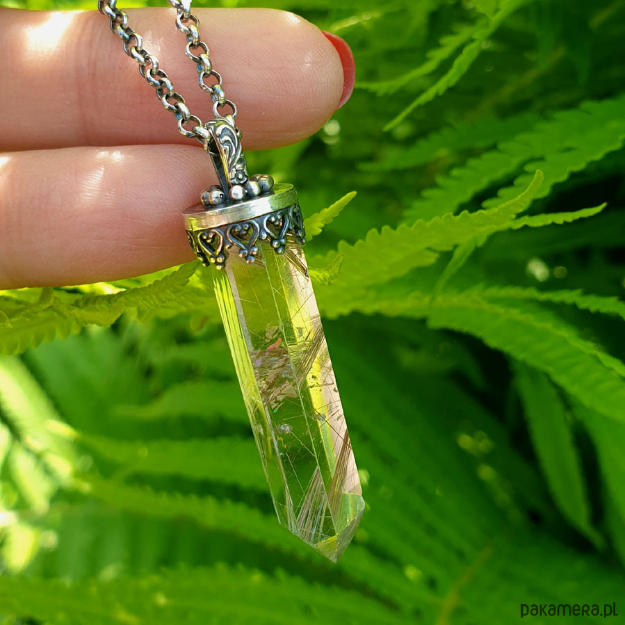 Naszyjnik z przepięknym soplem Kwarcu ze złocistymi wrostkami Rutylu – ta odmiana Kwarcu zwana jest ,,Włosami Wenus,, złociste pasma wewnątrz kamienia sprawiają wrażenie zatopionych opiłków złota. Każdy okaz jest unikatowy, gdyż ma inny układ włókien złocistego Moje projekty wykonuję ręcznie ze srebra próby 925. Koronkową oprawę oksydowałam przetarłam i wypolerowałam na wysoki połysk, aby nadać przestrzenności. Długość całkowita prawie 5 centymetrów 4,4 cm szerokość 1 cm. Łańcuszek o długości 70 cm w tym 5 cm regulacji. Naszyjnik jest dwustronny. Zdjęcia wykonane na manekinie o rzeczywistych ludzkich rozmiarach. Biżuteria z tej kolekcji to unikatowe projekty. Polecam Nehesi