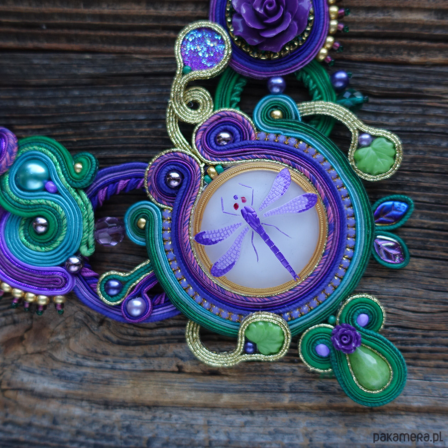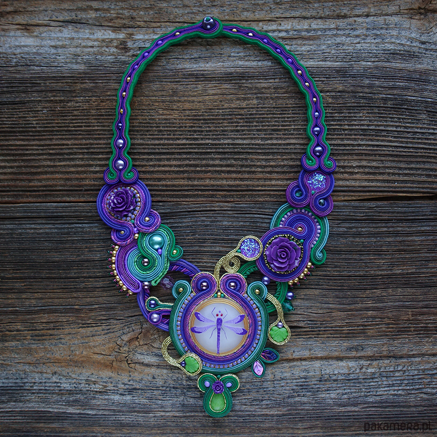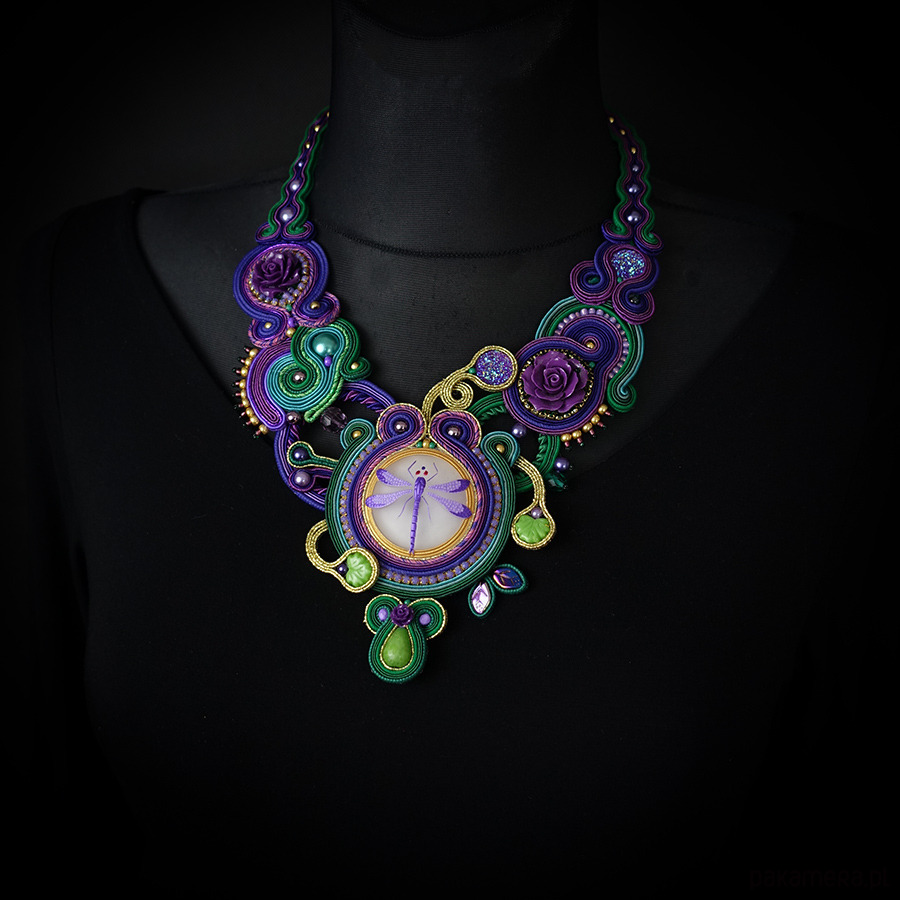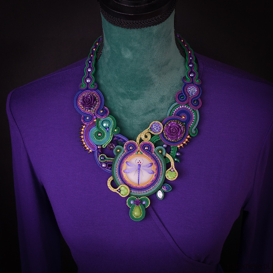 Ręcznie wykonany, bardzo pracochłonny naszyjnik w technice haftu soutache. To biżuteria, od której trudno oderwać wzrok – każdy egzemplarz jest absolutnie niepowtarzalny, nie tworzę dwóch takich samych.