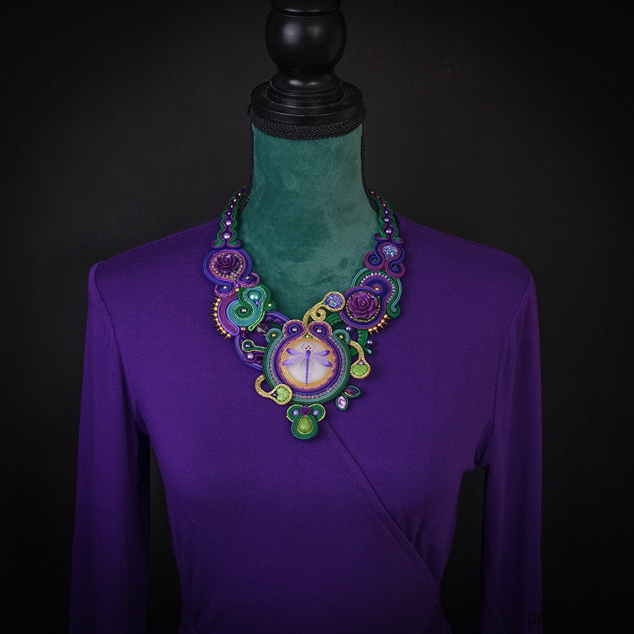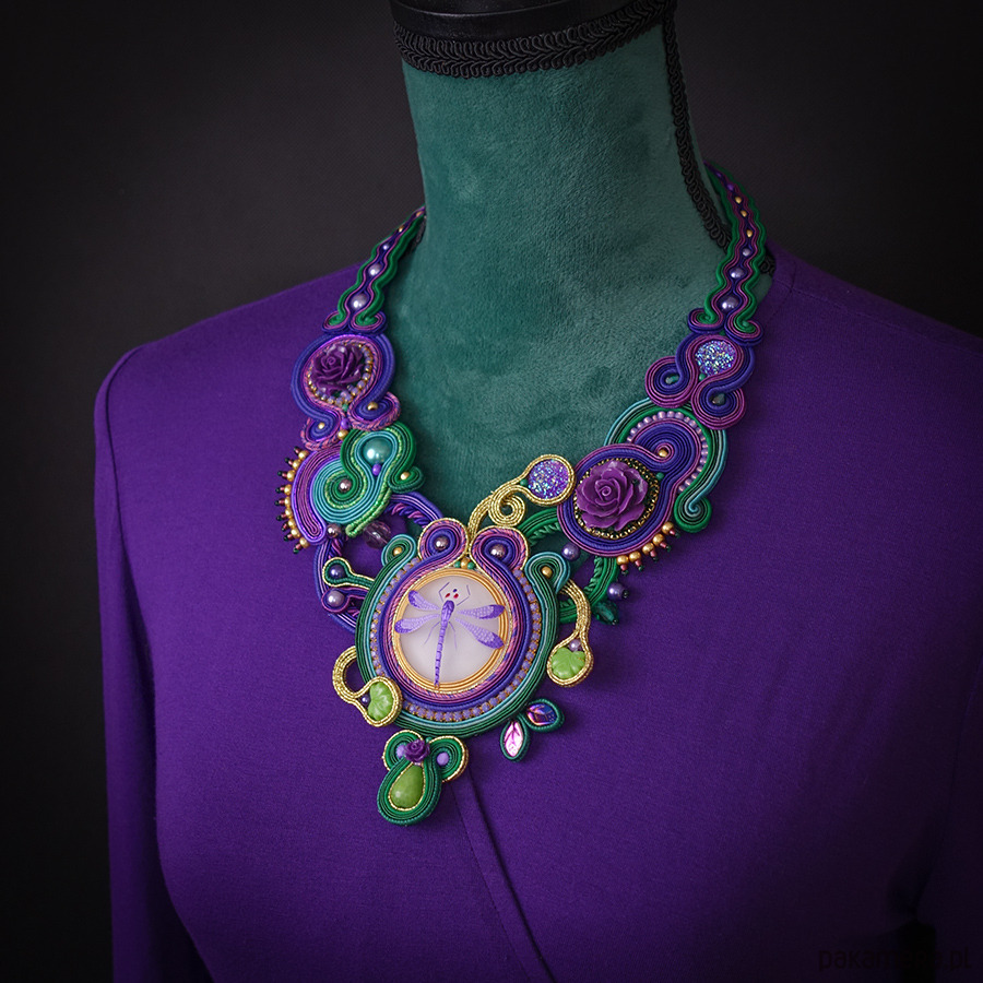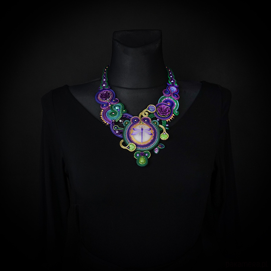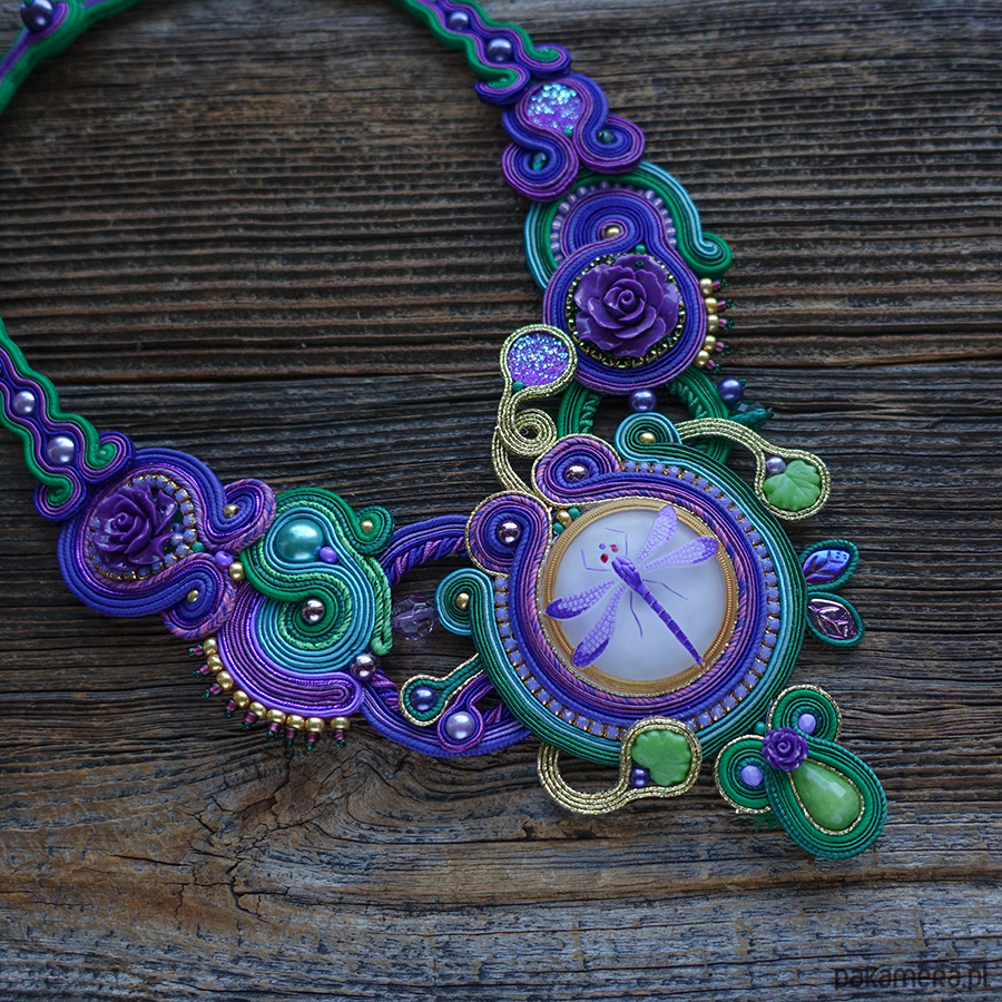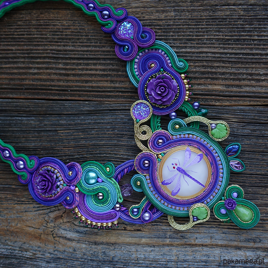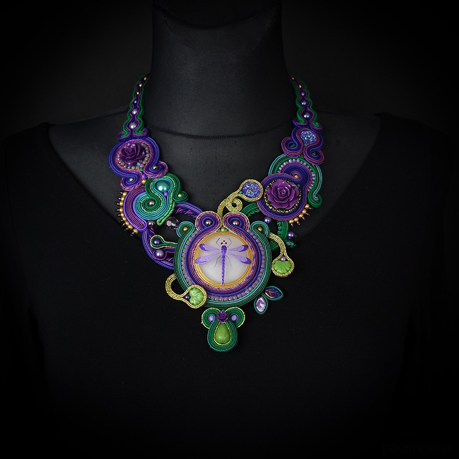 Ręcznie wykonany, bardzo pracochłonny naszyjnik w technice haftu soutache. To biżuteria, od której trudno oderwać wzrok – każdy egzemplarz jest absolutnie niepowtarzalny, nie tworzę dwóch takich samych.