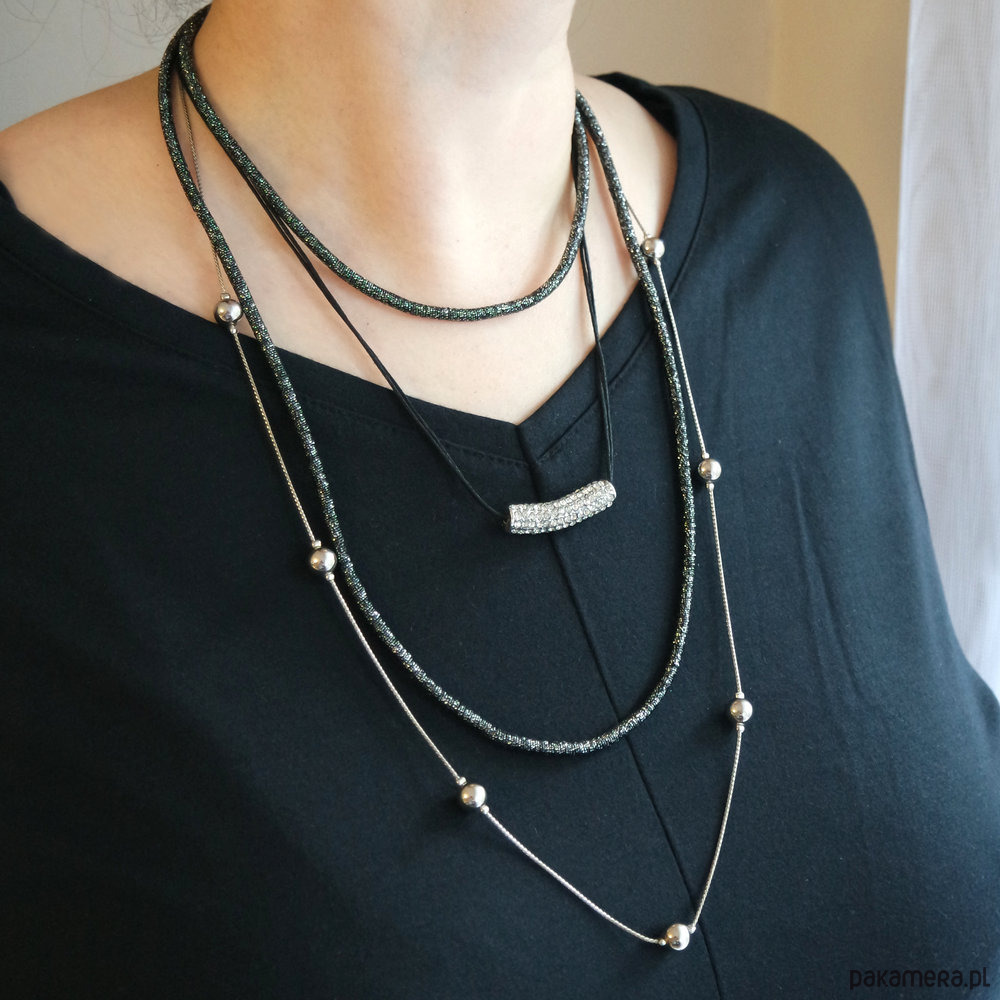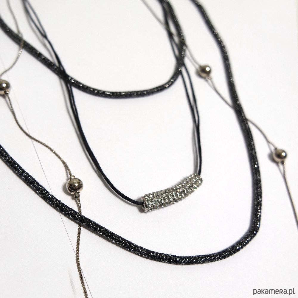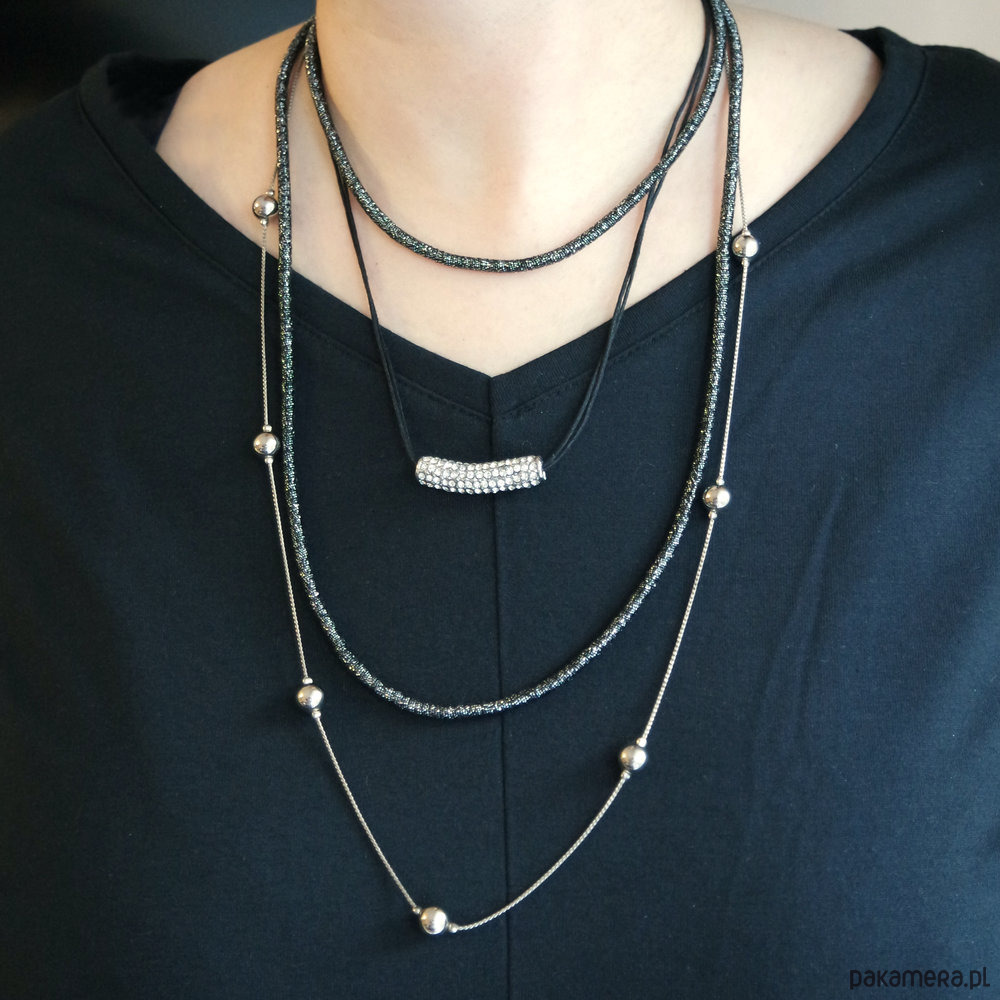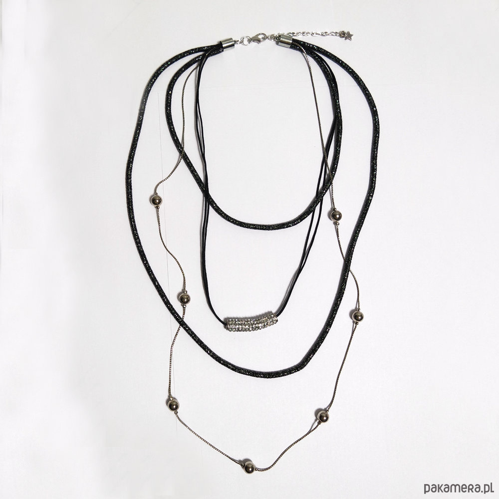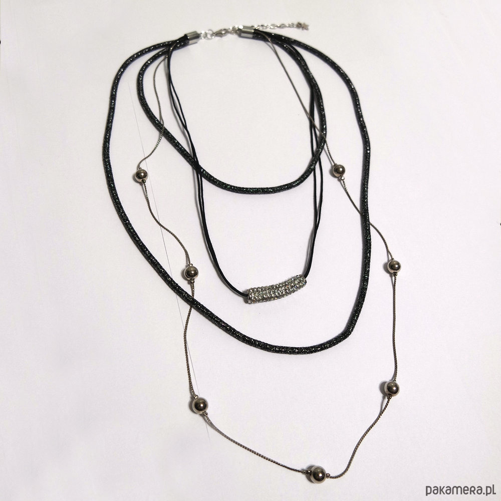 Jeden naszyjnik składający się z 4 części. Łańcuszek, łańcuszek powleczony srebrno czarną nitką oraz element z kryształkami zawieszony na woskowanym sznureczku. Wszystkie razem połączone w jeden naszyjnik.