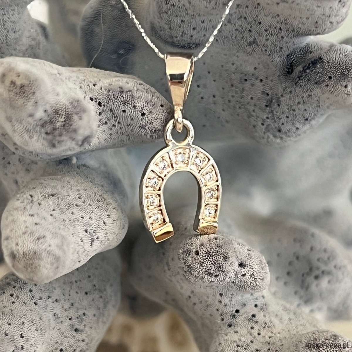 Motyw podkowy: centralny element w kształcie podkowy – klasyczny symbol szczęścia i powodzenia – ozdobiony jest licznymi cyrkoniami które dodają biżuterii błysku i elegancji i na końcach podkowy płytka ze złota próby 585.