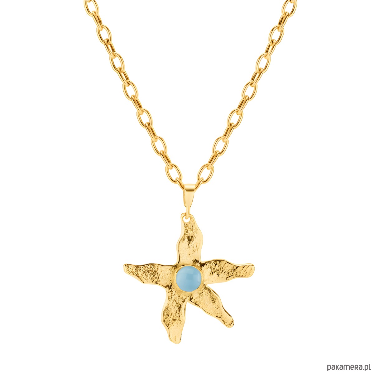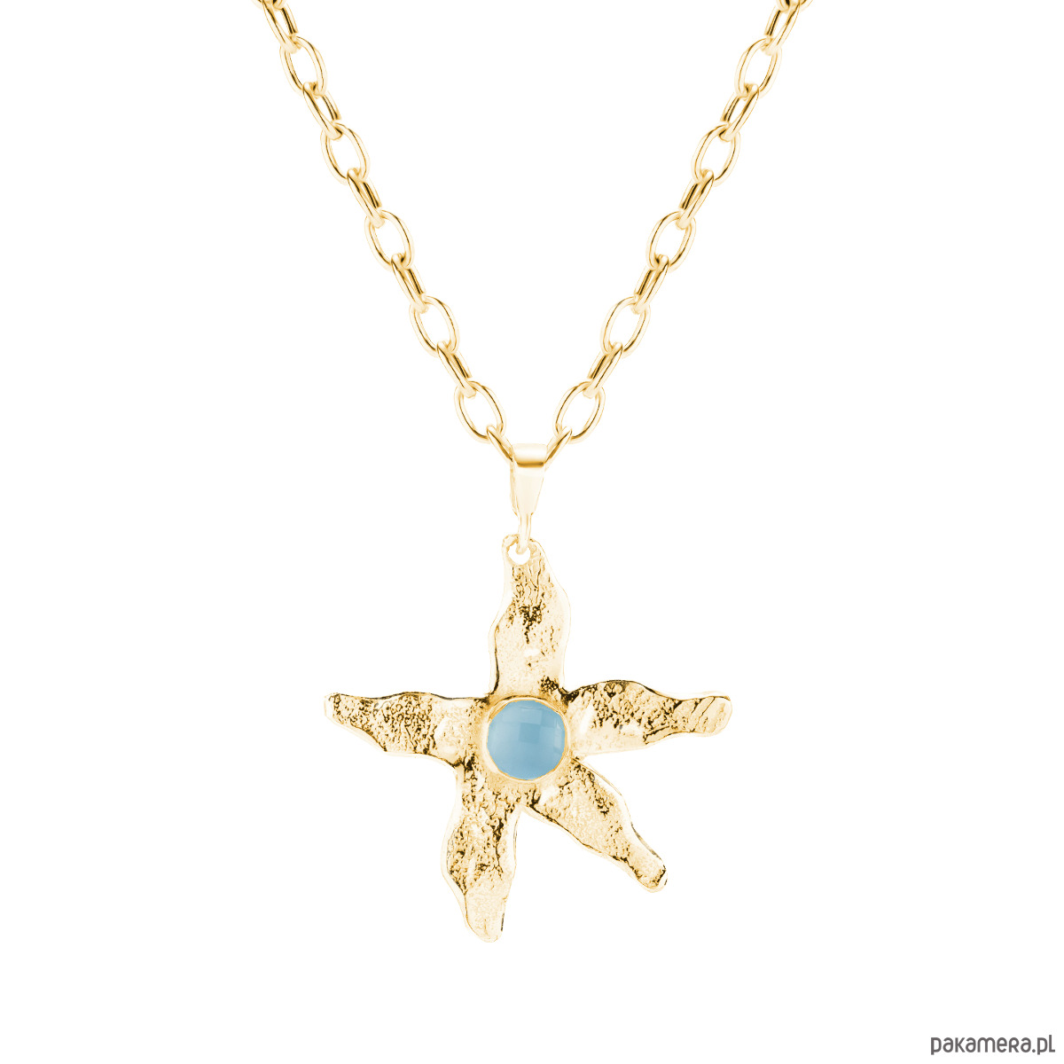 Naszyjnik srebrny pozłacany w kształcie rozgwiazdy to propozycja dla osób, które lubią połączenie delikatnego blasku z wyrazistą formą. Ręcznie wykonany ze srebra 925 i pokryty trwałą warstwą złota zachwyca nieregularnym, organicznym kształtem. W centrum niepowtarzalnej rozgwiazdy umieszczony został niebieski agat – kamień o subtelnie transparentnej barwie, który pięknie odbija światło. Regulowana długość (do 50 cm) pozwala idealnie dopasować naszyjnik do każdej stylizacji – od codziennej po bardziej elegancką.