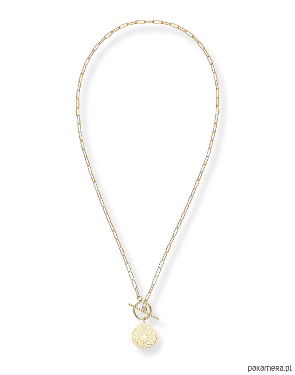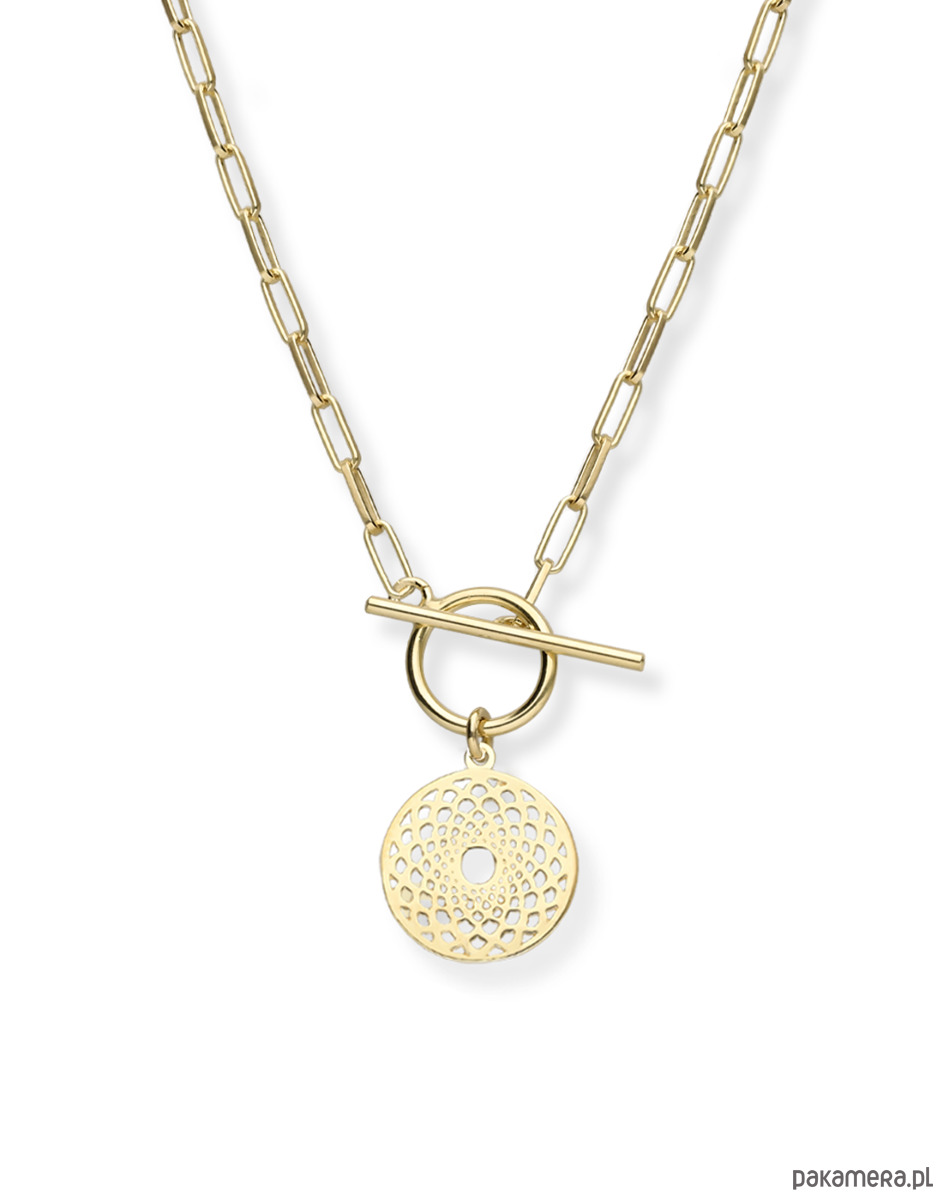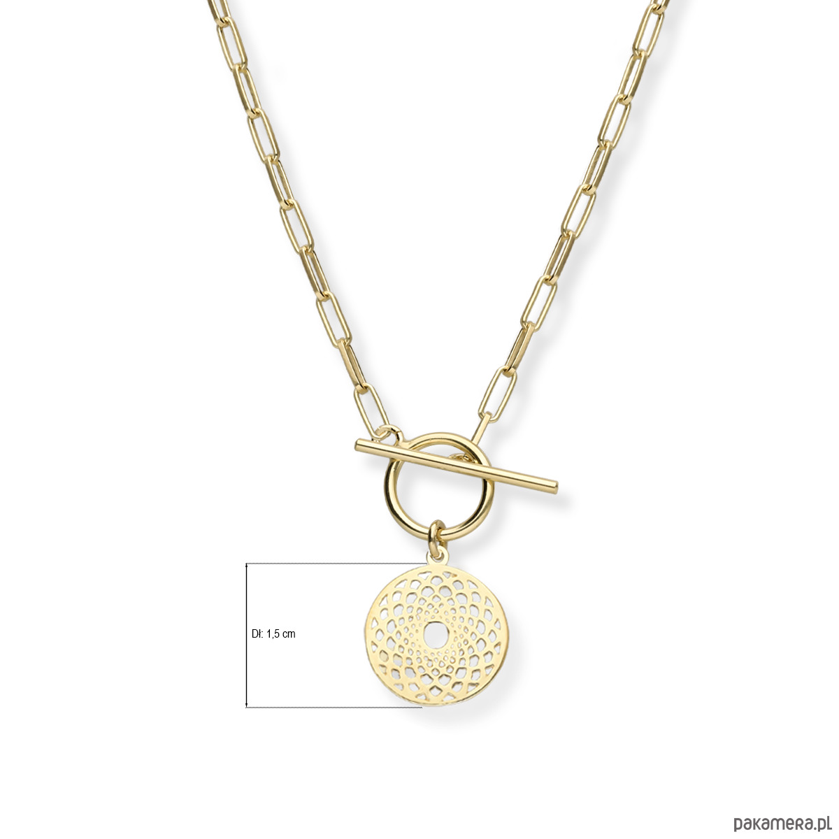 Ten wyjątkowy naszyjnik emanuje subtelnością i klasyką. Jego centralnym elementem jest misternie zdobione ażurowe kółko, które dodaje mu niepowtarzalnego uroku.