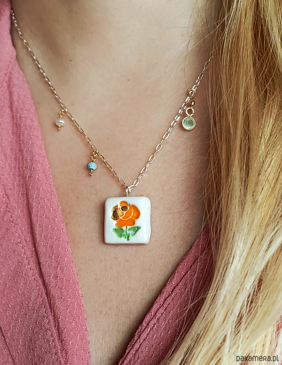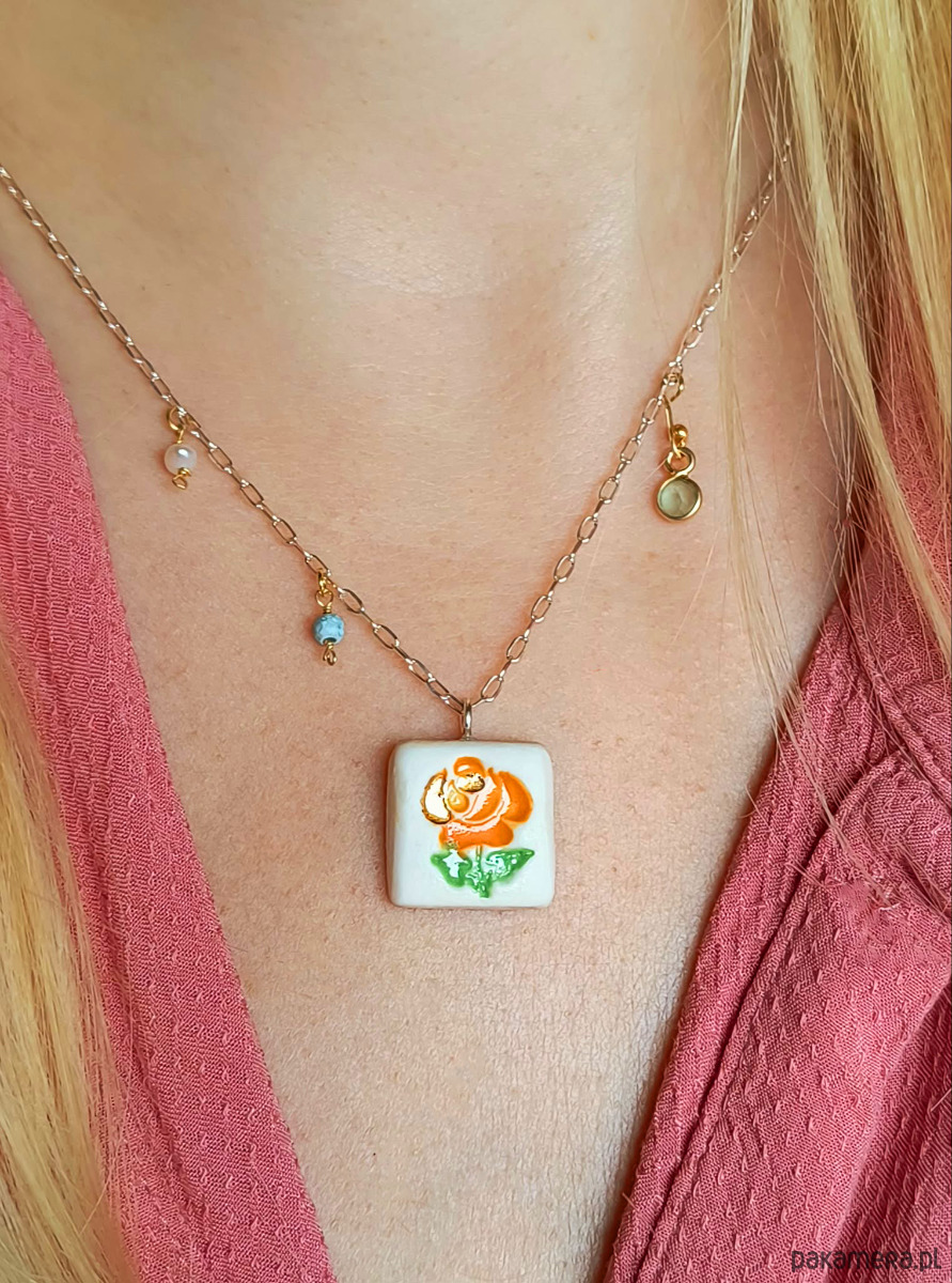 Naszyjnik wykonałam własnoręcznie ze szlachetnej porcelany, zdobiłam szkliwem oraz 24-karatowym złotem.
