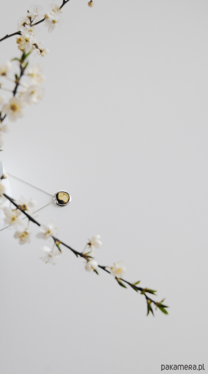 Naturalny bursztyn w minimalistycznej oprawie ze srebra próby 925 w szczotkowanym wykończeniu z jednej strony i polerowanym z drugiej. Pokryty szlachetnym rodem dzięki czemu srebro nie ciemnieje.