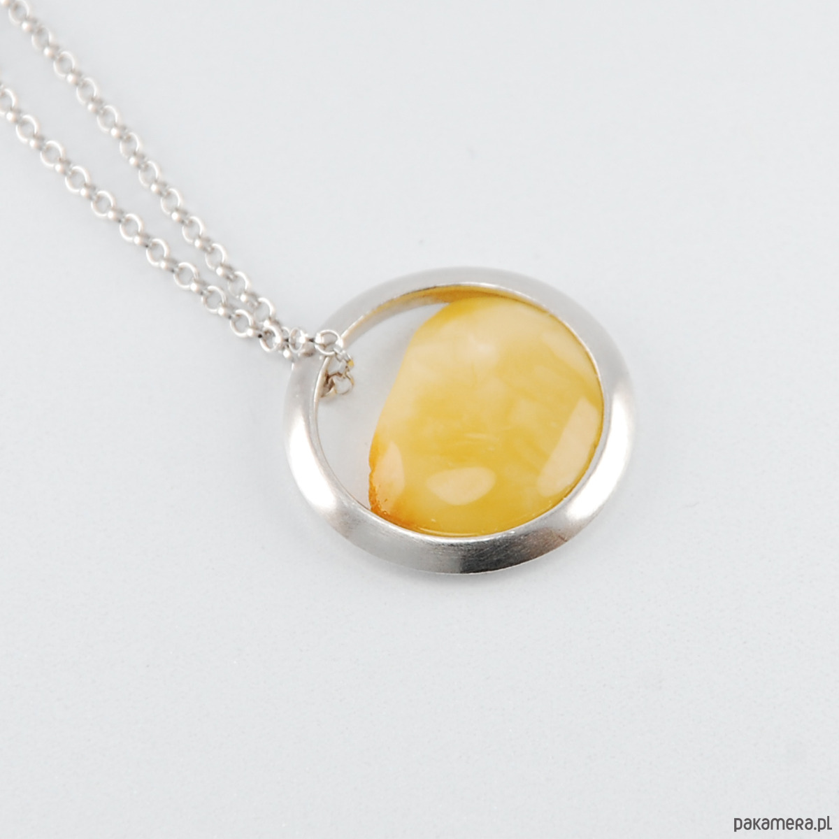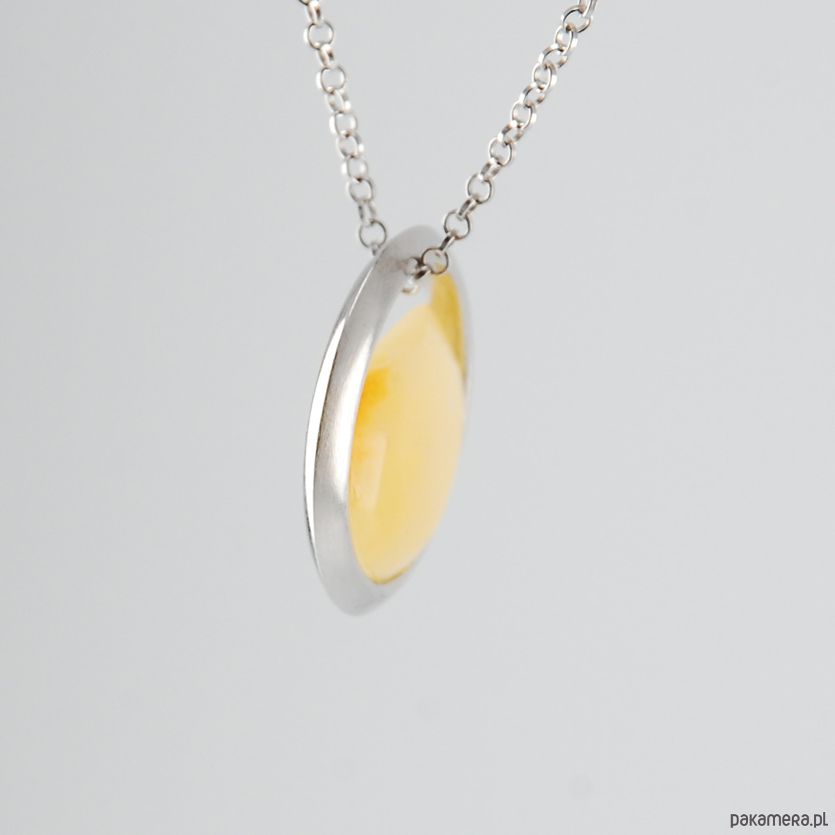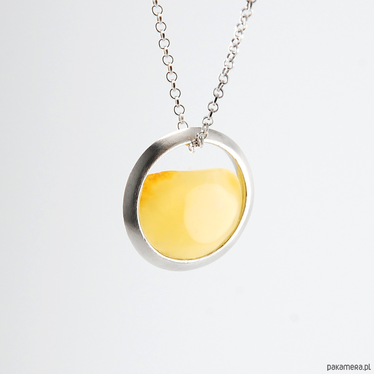 Naturalny bursztyn w minimalistycznej oprawie ze srebra próby 925 w szczotkowanym wykończeniu z jednej strony i polerowanym z drugiej. Pokryty szlachetnym rodem dzięki czemu srebro nie ciemnieje.