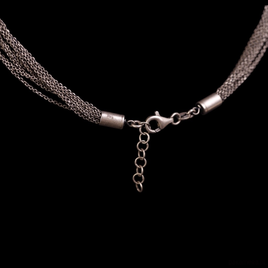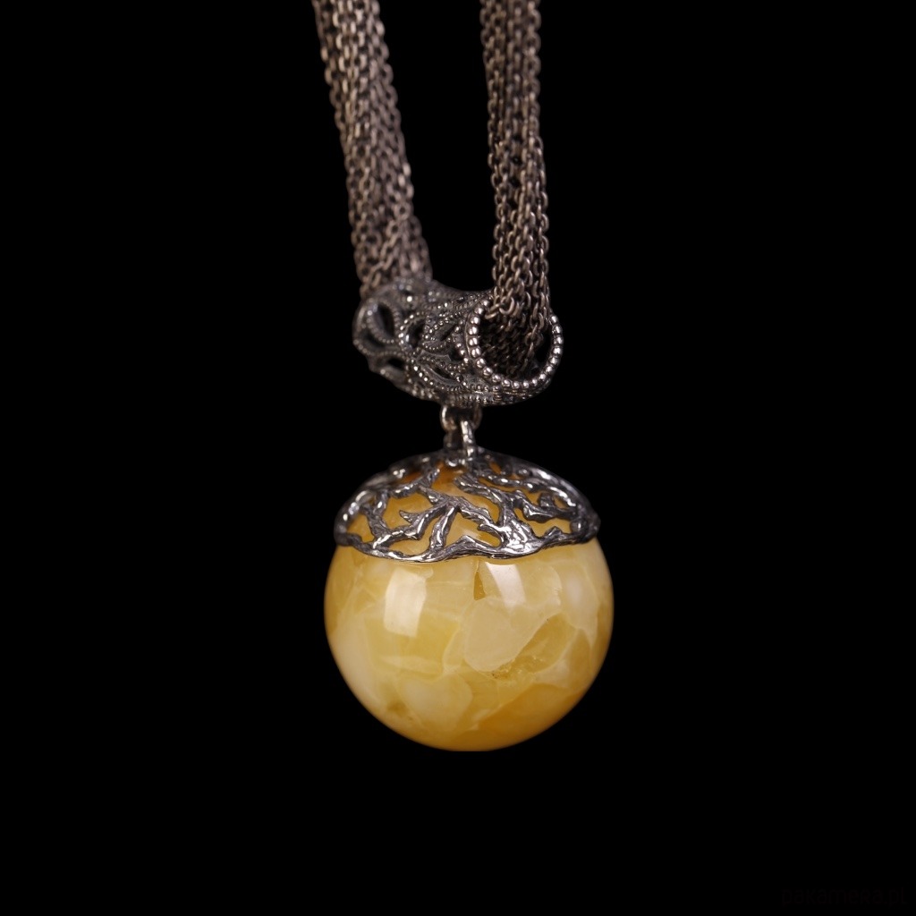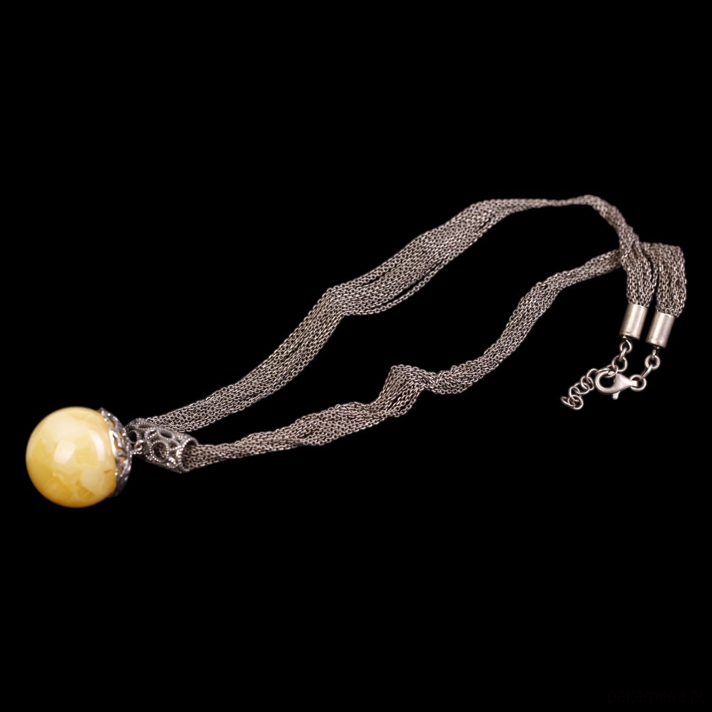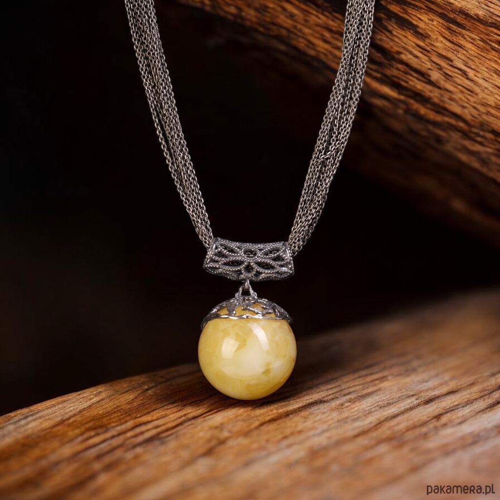 Naszyjnik z oksydowanego srebra z efektowną bursztynową kulą, która przyciąga wzrok swoim ciepłym, mlecznym odcieniem. Subtelnie przyciemnione, oksydowane srebro i dwanaście drobnych łańcuszków tworzą miękką, elegancką kaskadę na dekolcie, a wyraźny ciężar bursztynu sprawia, że naprawdę czujesz tę biżuterię na sobie. To naszyjnik dla osób, które lubią szlachetne formy z wyraźnym, artystycznym charakterem.