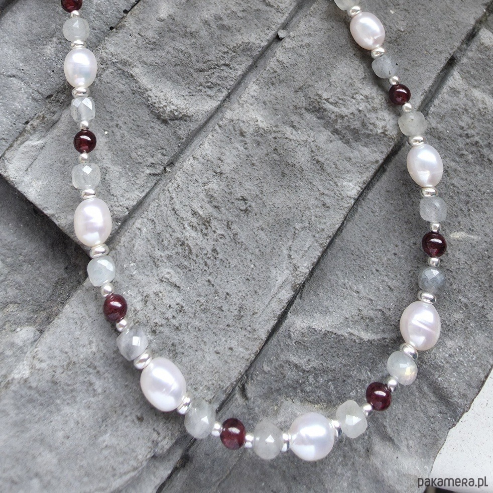 Naszyjnik srebrny z perłami, labradorytem, granatami