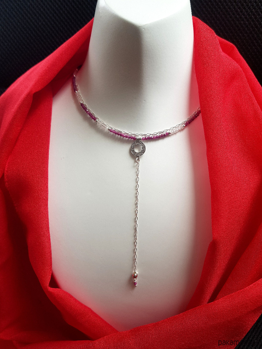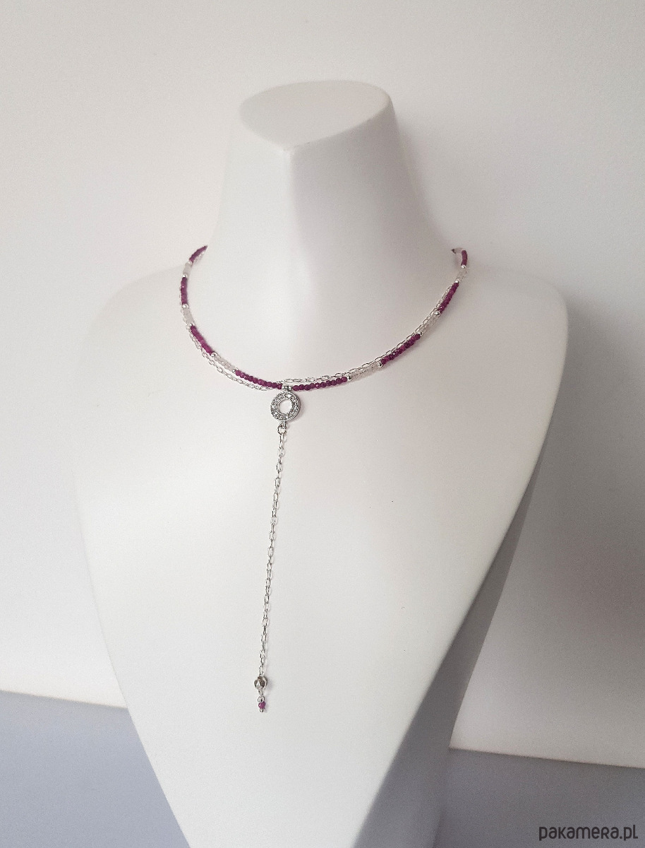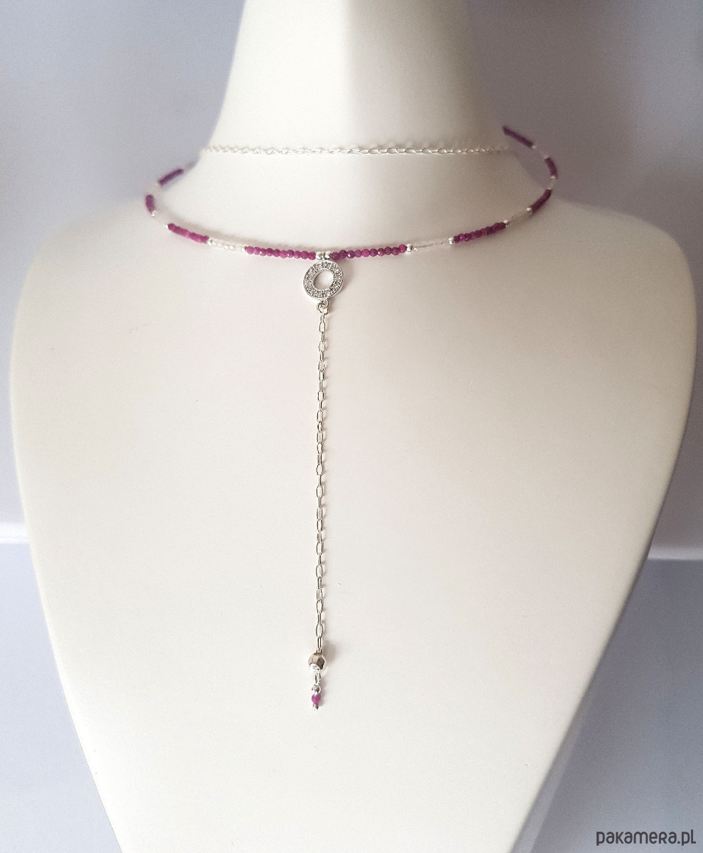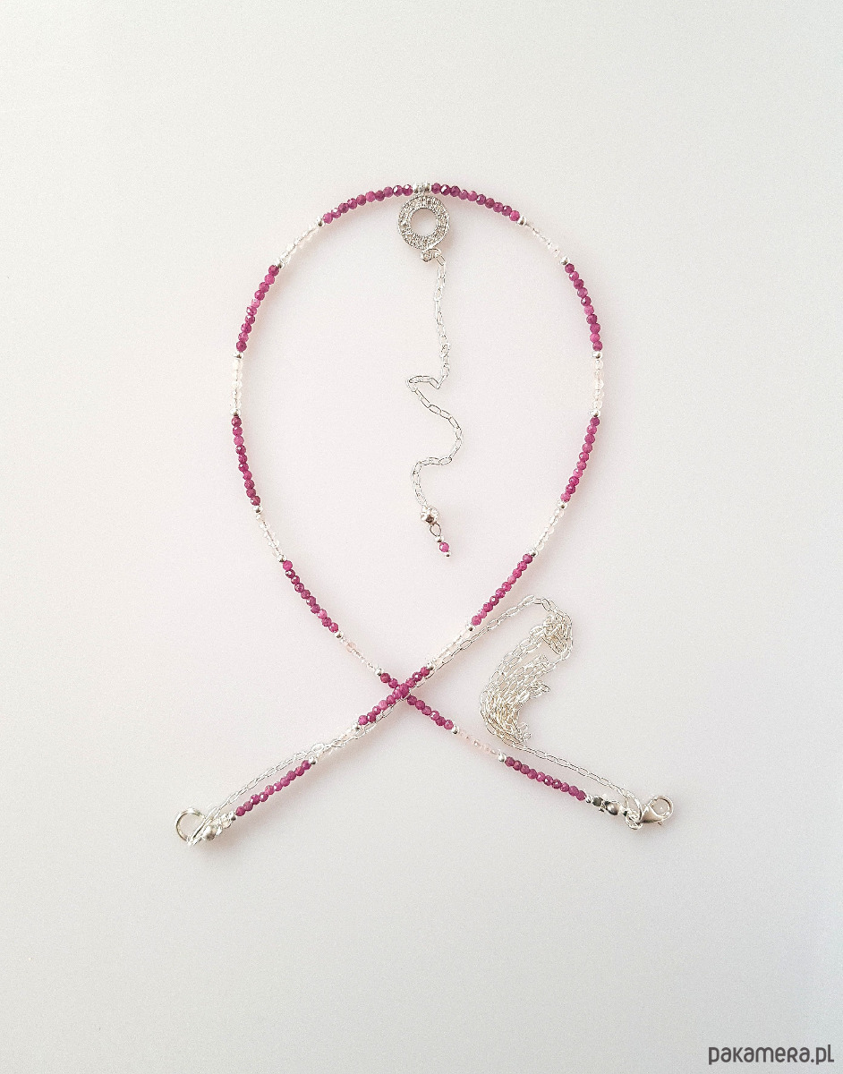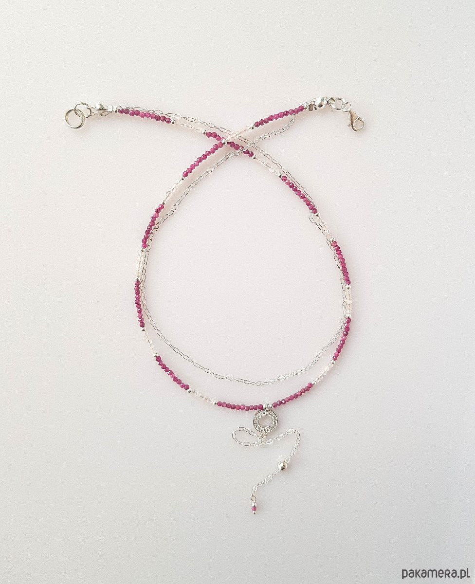 Wykonany ręcznie ze srebra próby 925 oraz drobnych fasetowanych kamieni naturalnych - rubinów w kolorze ciemnej fuksji i kwarcu różowego. Przekładki - kulki ze srebra.