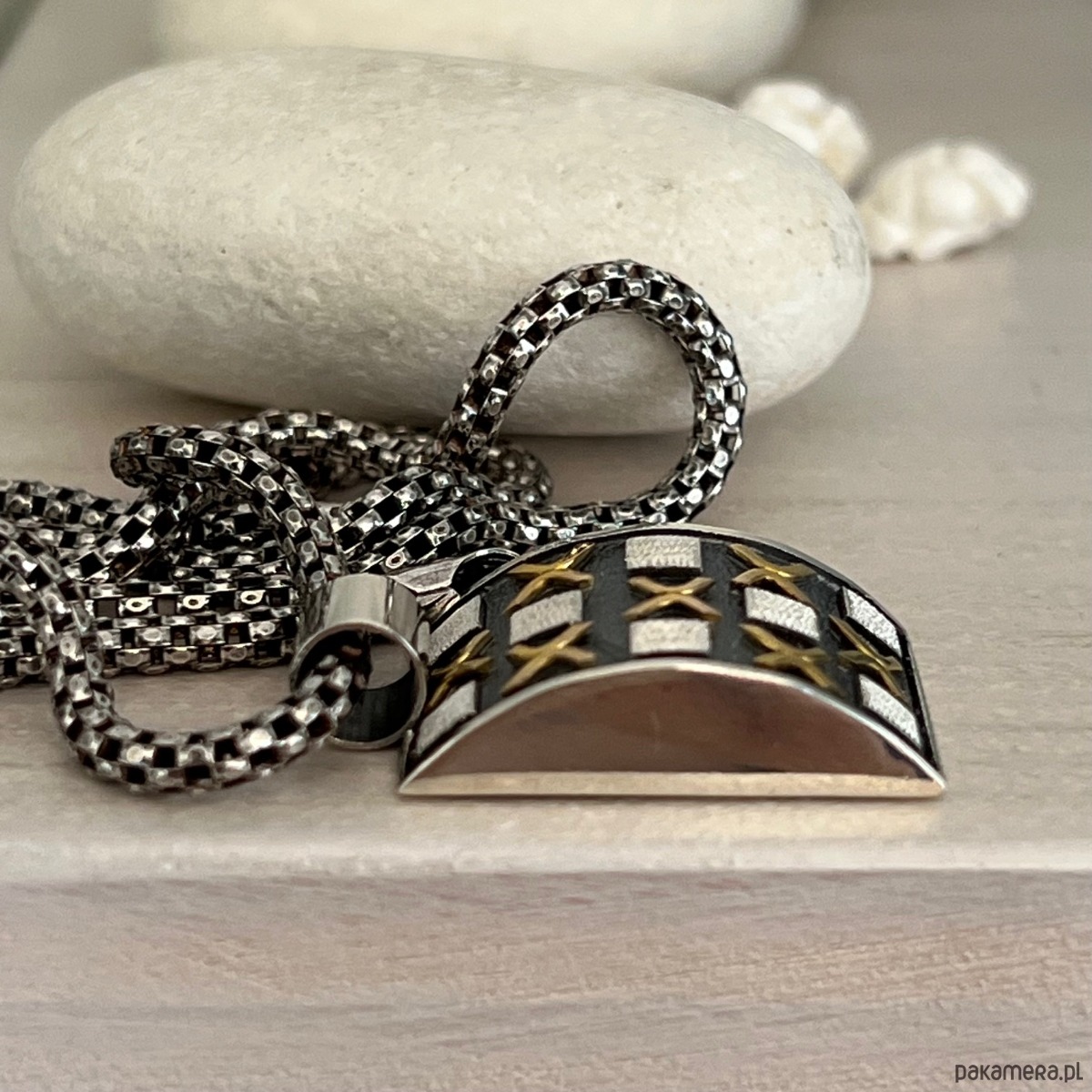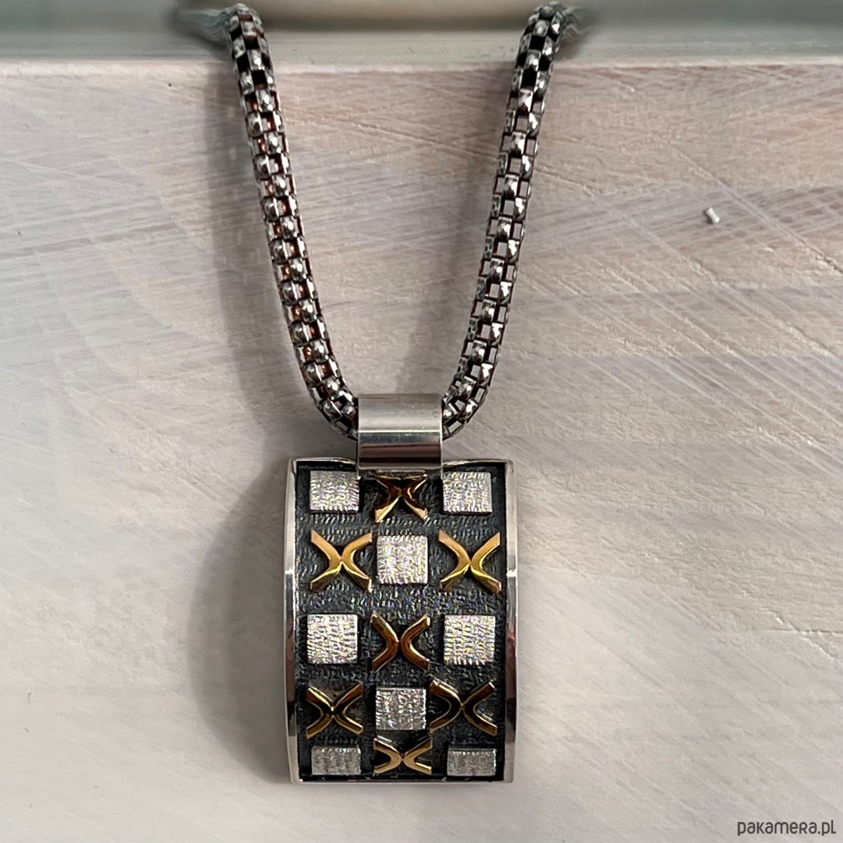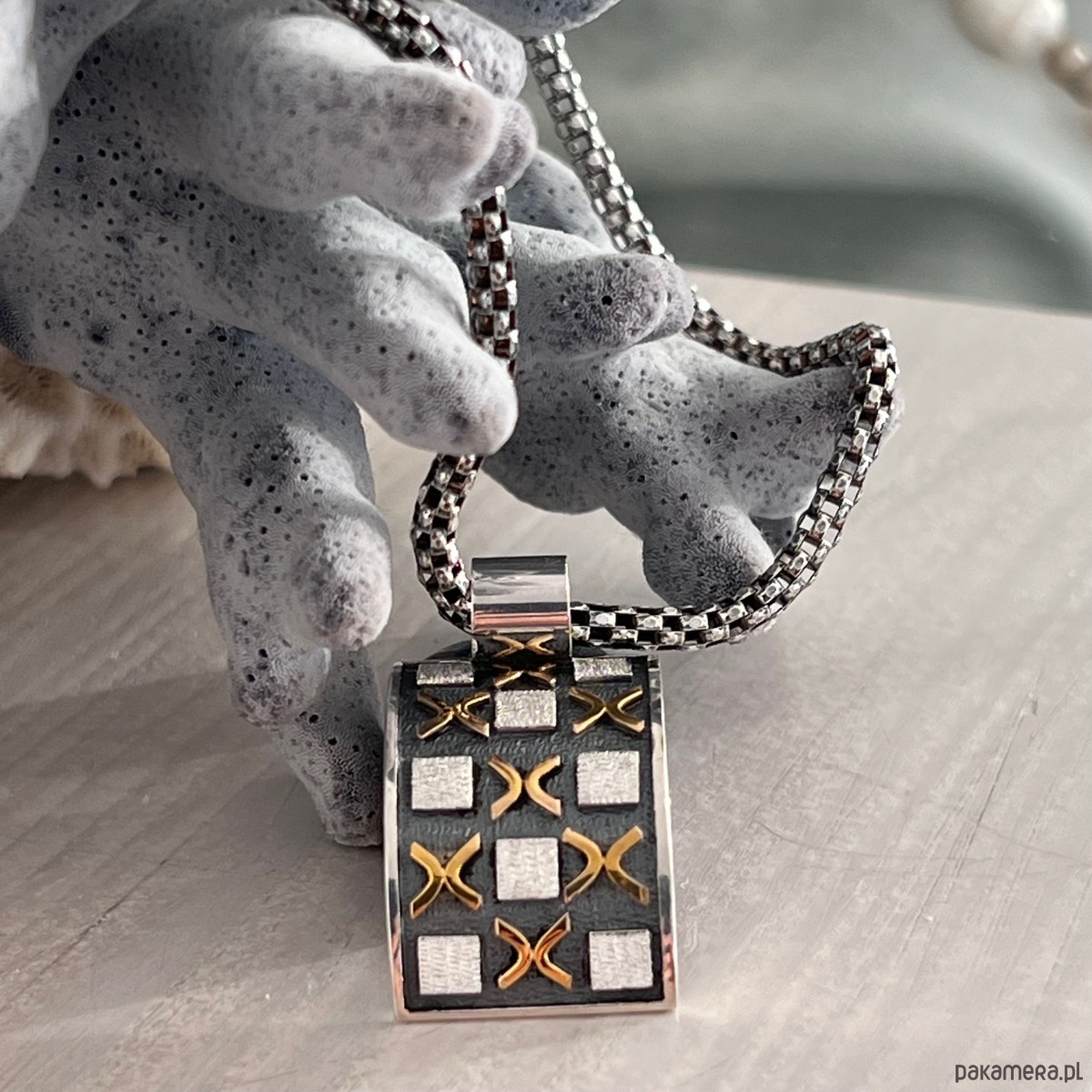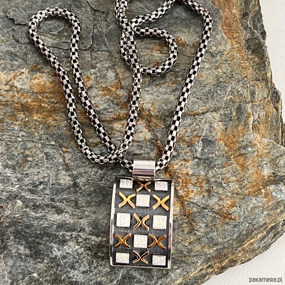 ADE ART - Autorski Unikatowy Zestaw: Zawieszka , łańcuszek dla Niej. Oryginalny, dwukolorowy wzór, który można interpretować jako geometryczną szachownicę lub układ stylizowanych liter 'X'.
