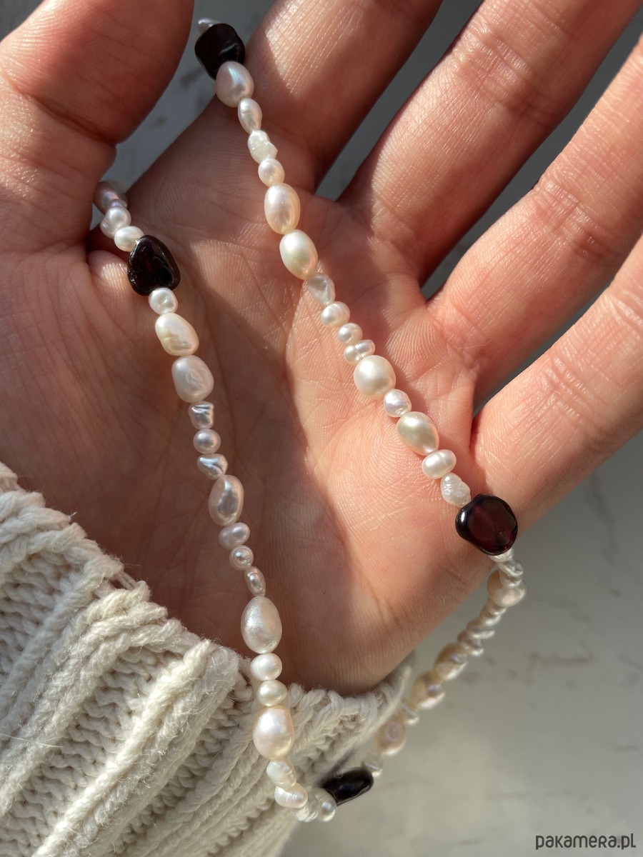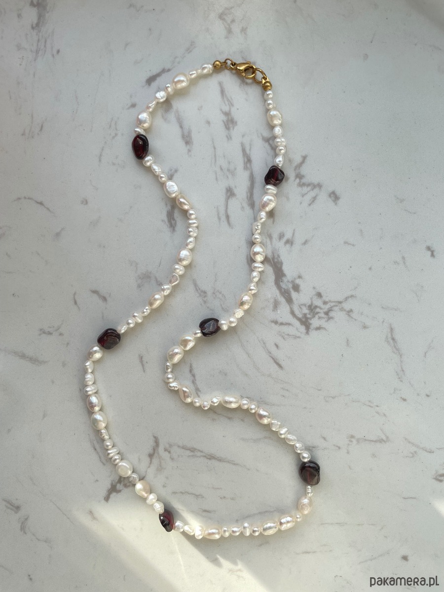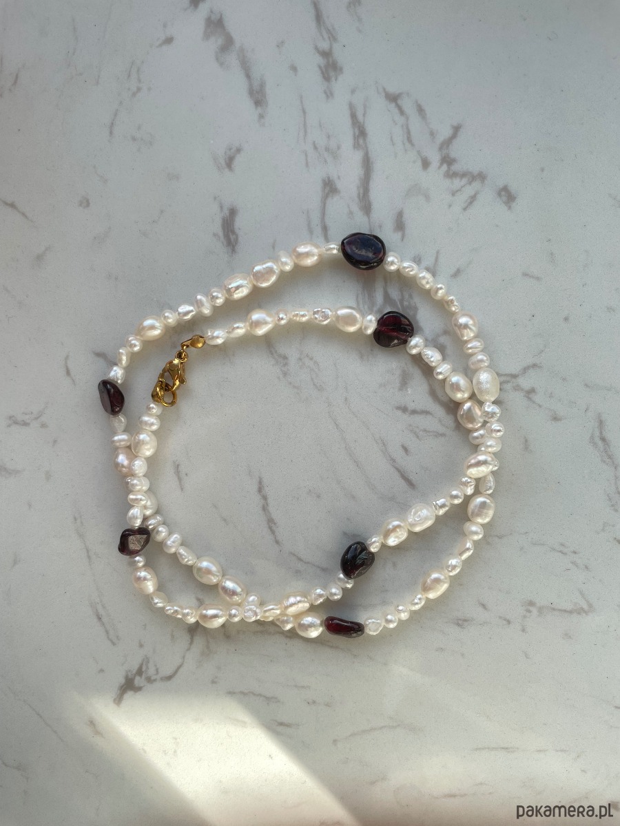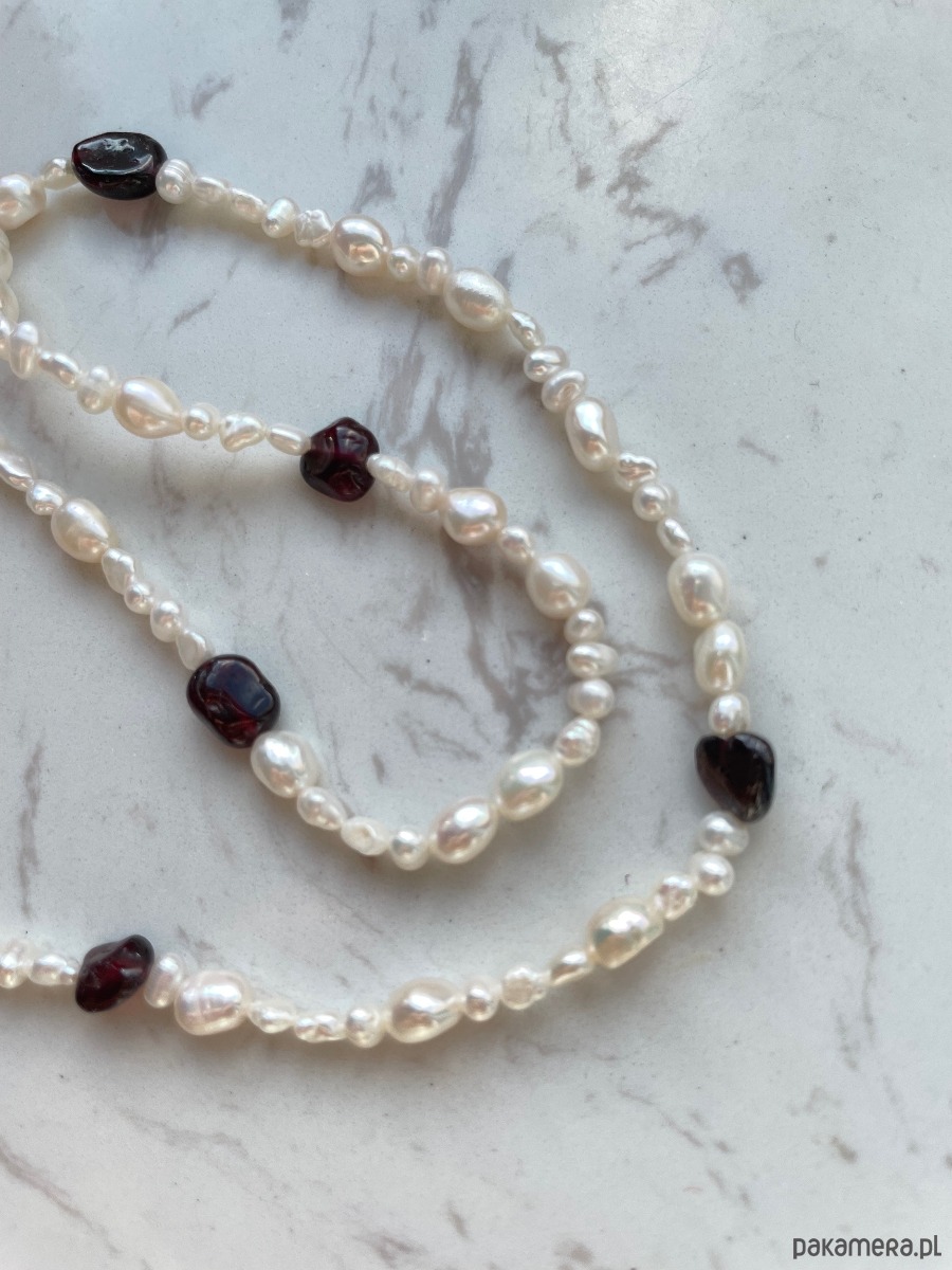 Wykonany z pereł różnej wielkości, które podkreśla nieregularna bryła kamienia granatu.