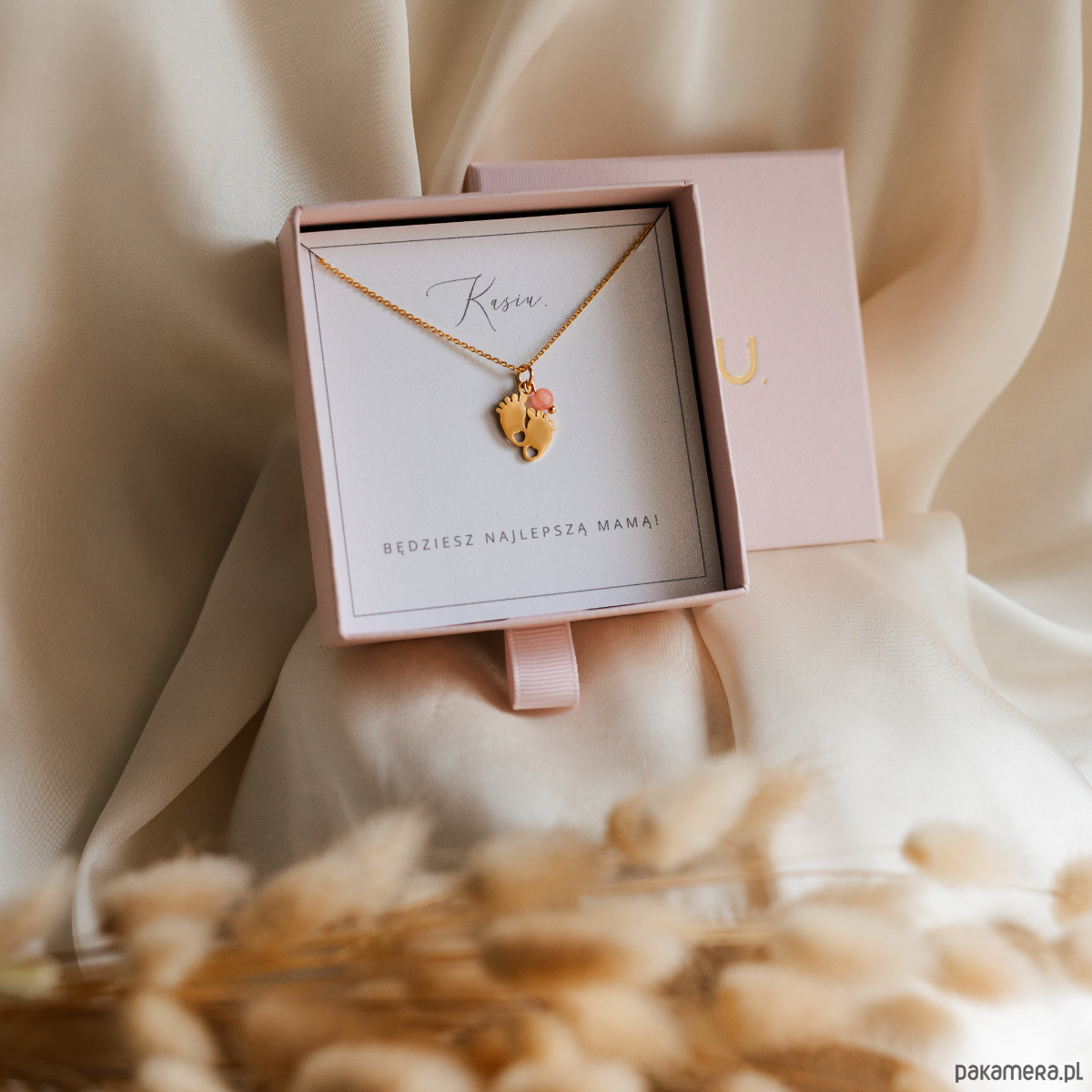 W każdym złotym śladzie stópek tkwią nie tylko pierwsze kroki dziecka, ale również pierwsze uśmiechy, pierwsze objęcia i pierwsze westchnienia. To naszyjnik, który nosi w sobie historię pełną uczuć, trosk i radości, tworząc niezatarte wspomnienie, które będzie towarzyszyć przez całe życie mamie dziecka.