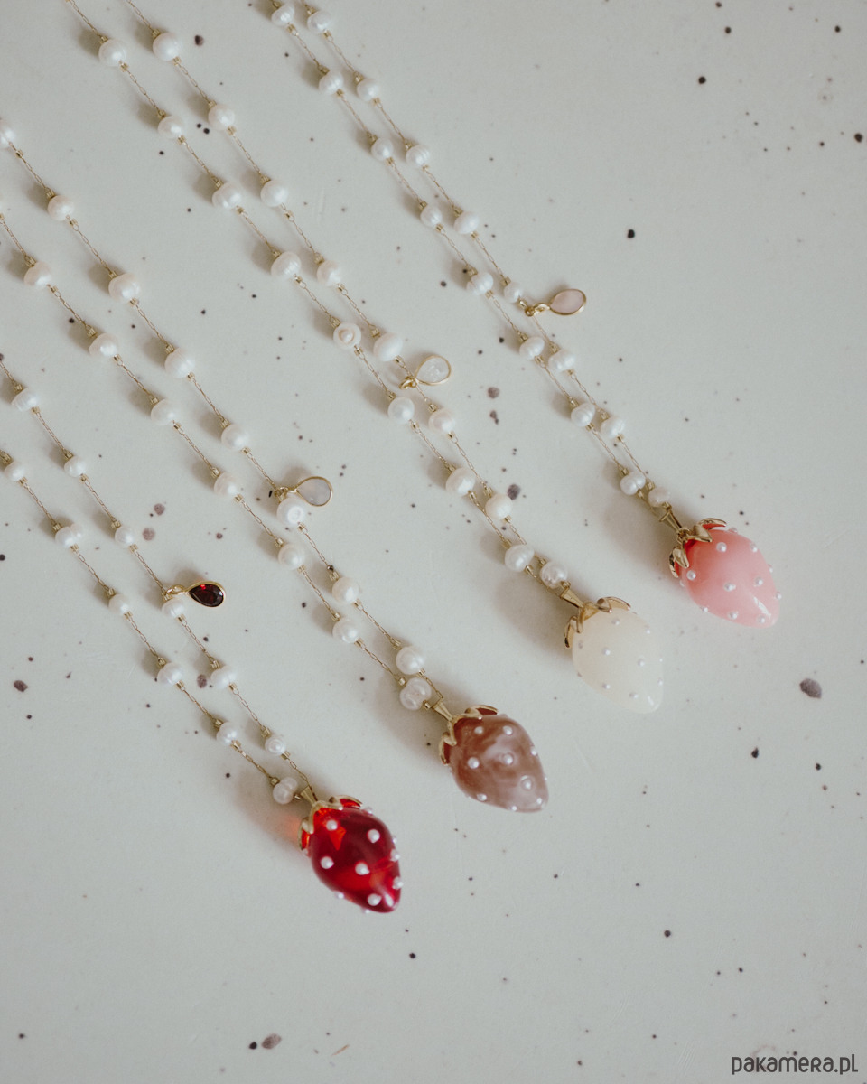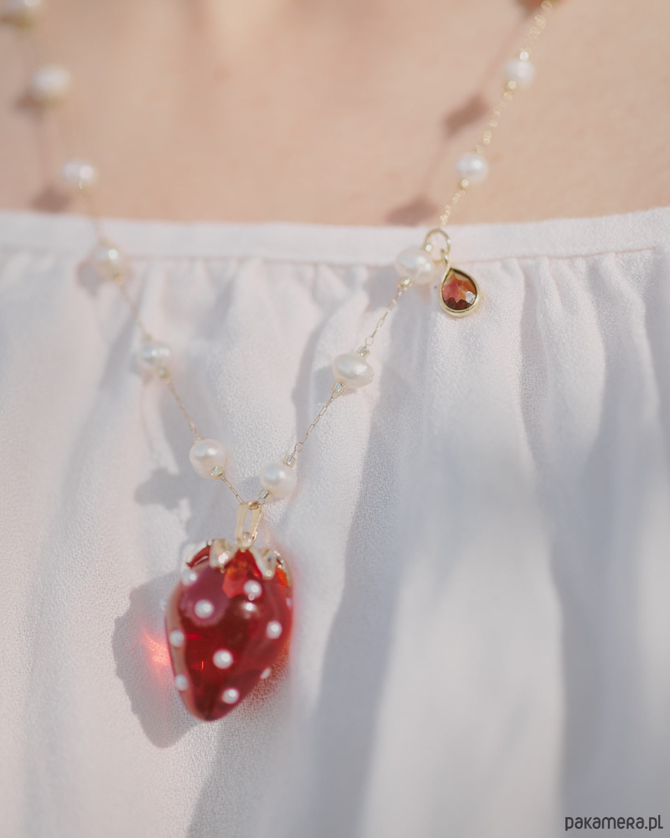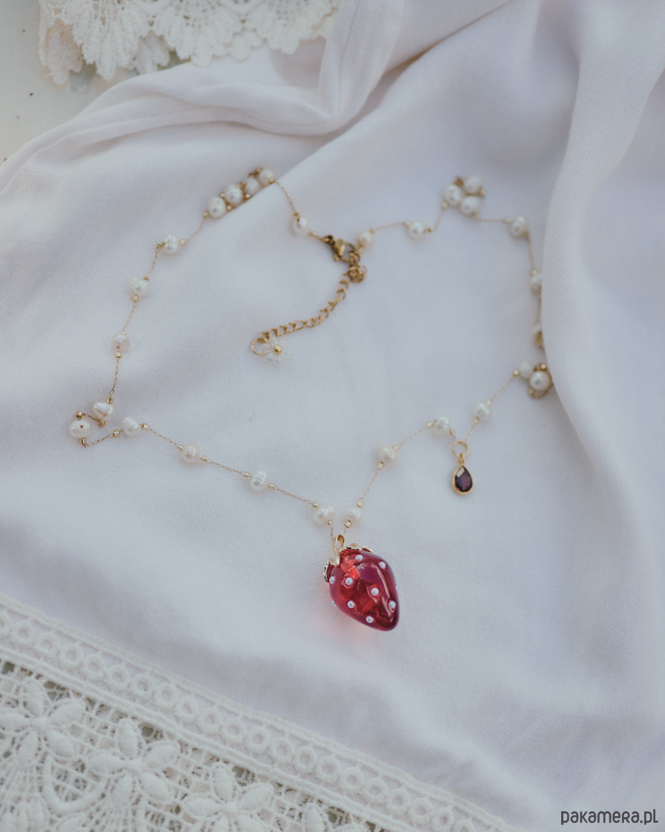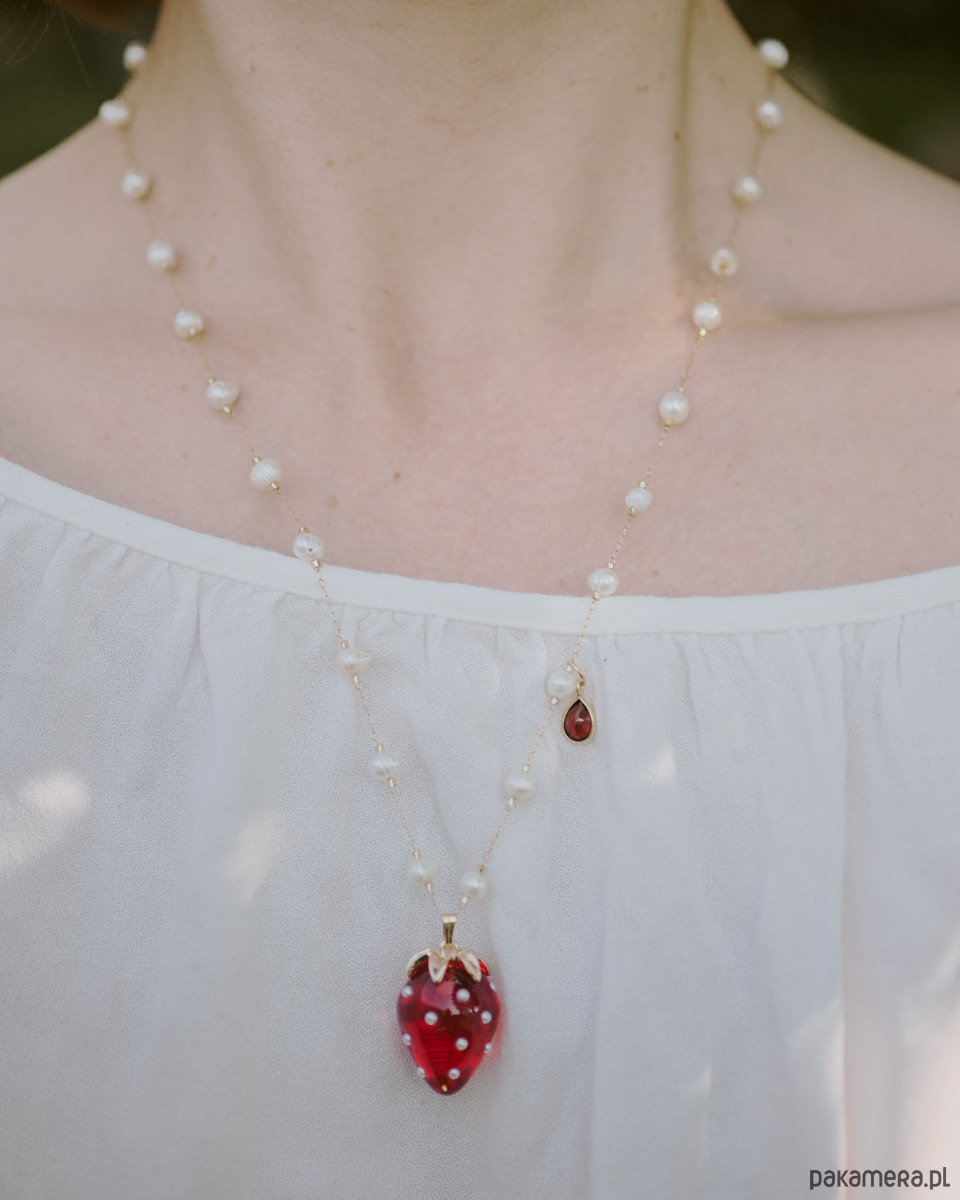 Ten delikatny łańcuszek wykonany jest z pereł naturalnych. Wykańcza go soczysta truskawka z żywicy akrylowej. Dodatkowy akcent tworzy pozłacana kropla granatu w głębokim, czerwonym kolorze nawiązującym do truskawki oraz szklany kwiatek na łańcuszku regulacyjnym.