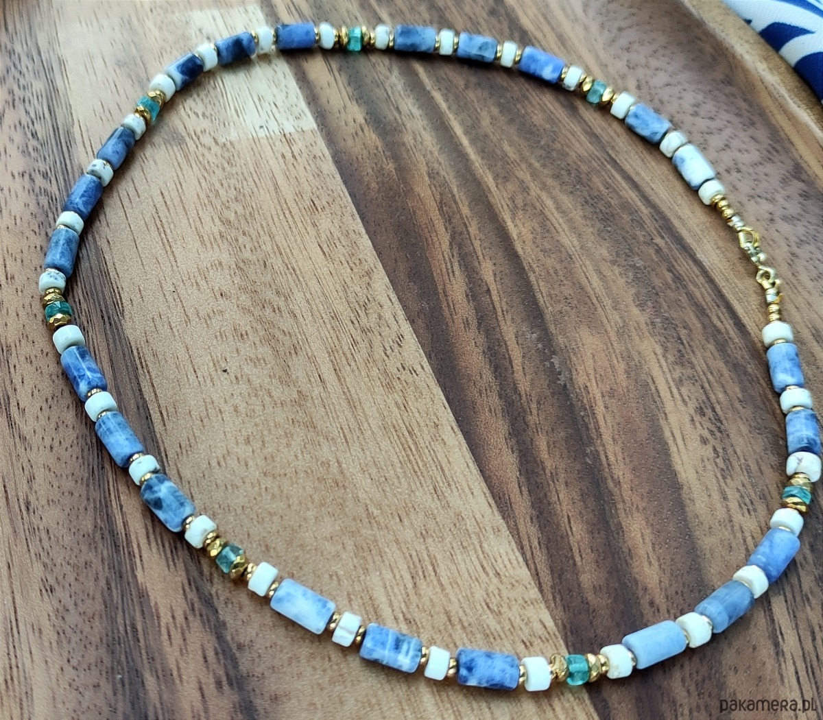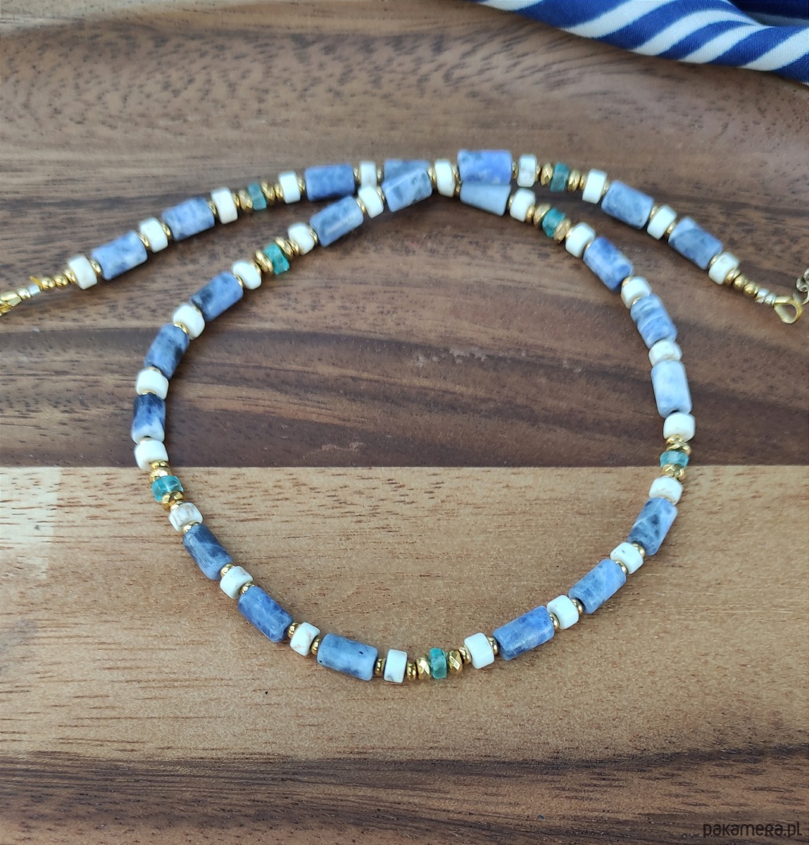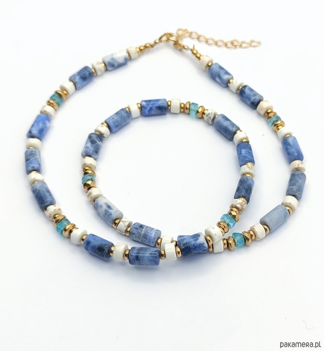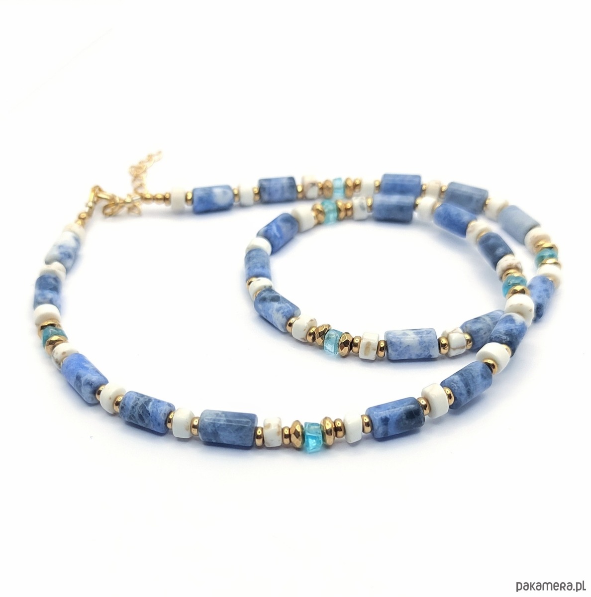 Jasny naszyjnik wykonany z kamieni sodalitu, howlitu oraz błękitnego, świetlistego apatytu. Przekładany hematytem galwanizowanym na złoto i wykończony pozłacanym srebrem. Do noszenia przy szyi, dobrze układa się. Bardzo pozytywny.