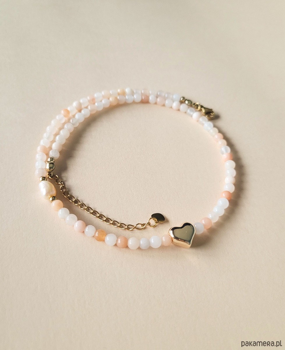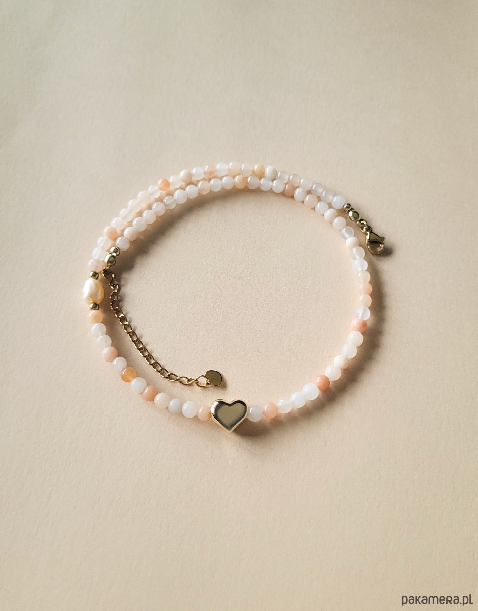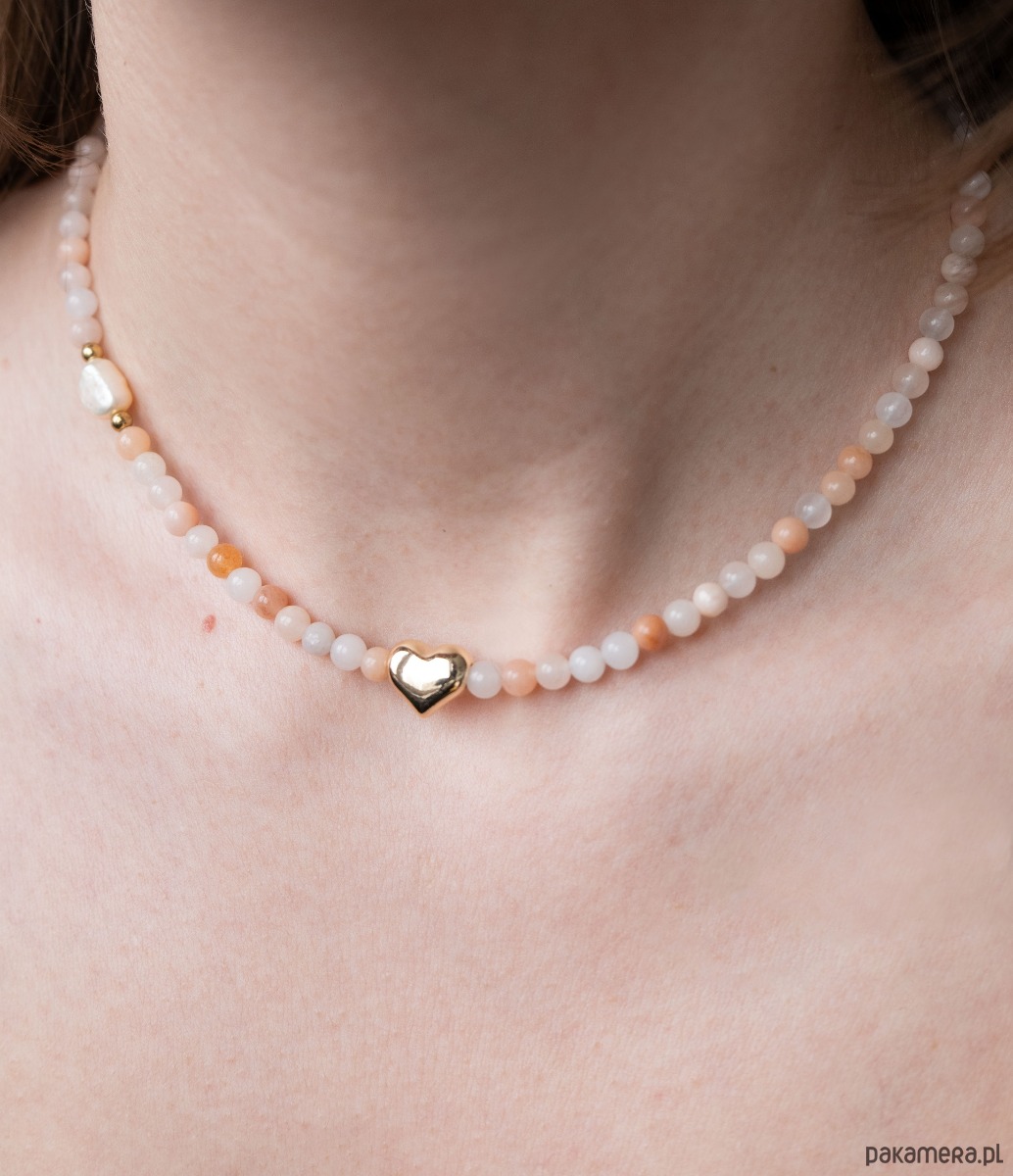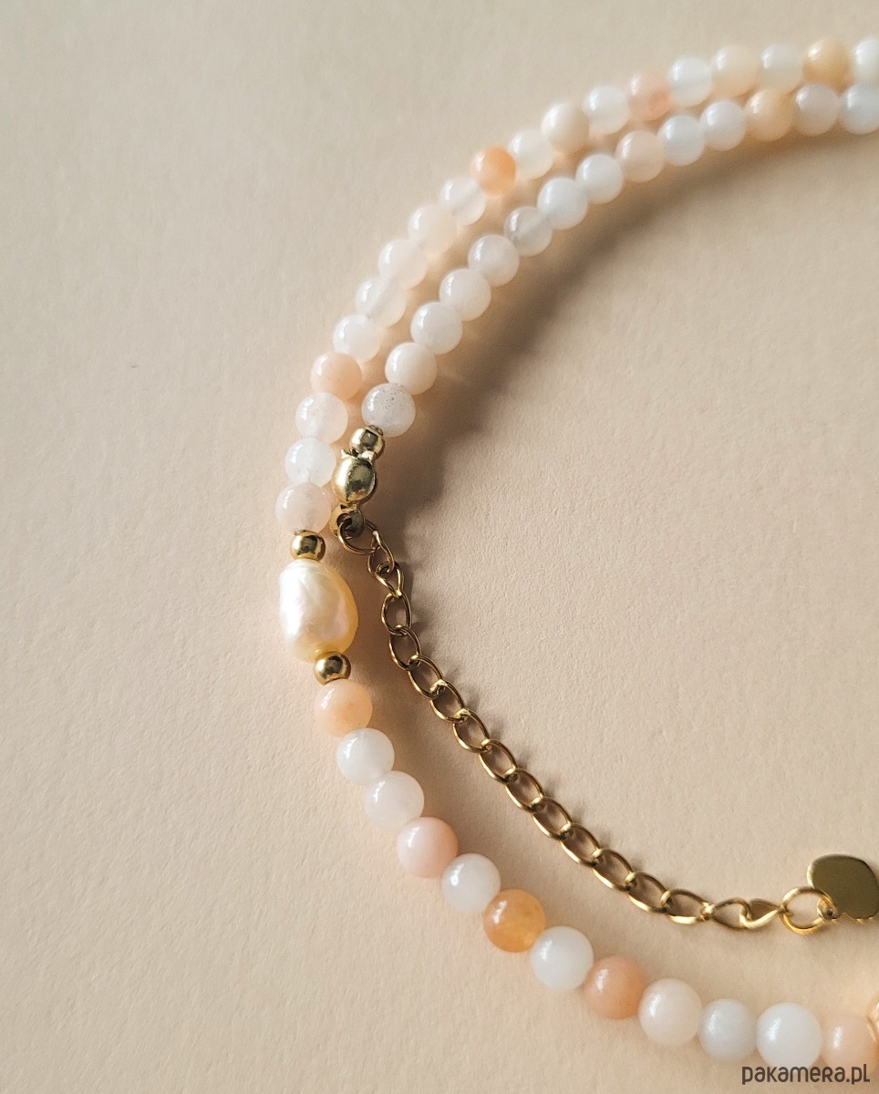 Naszyjnik został wykonany z drobnych kamieni awenturynu w odcieniach mlecznej bieli i subtelnego brzoskwiniowego różu,