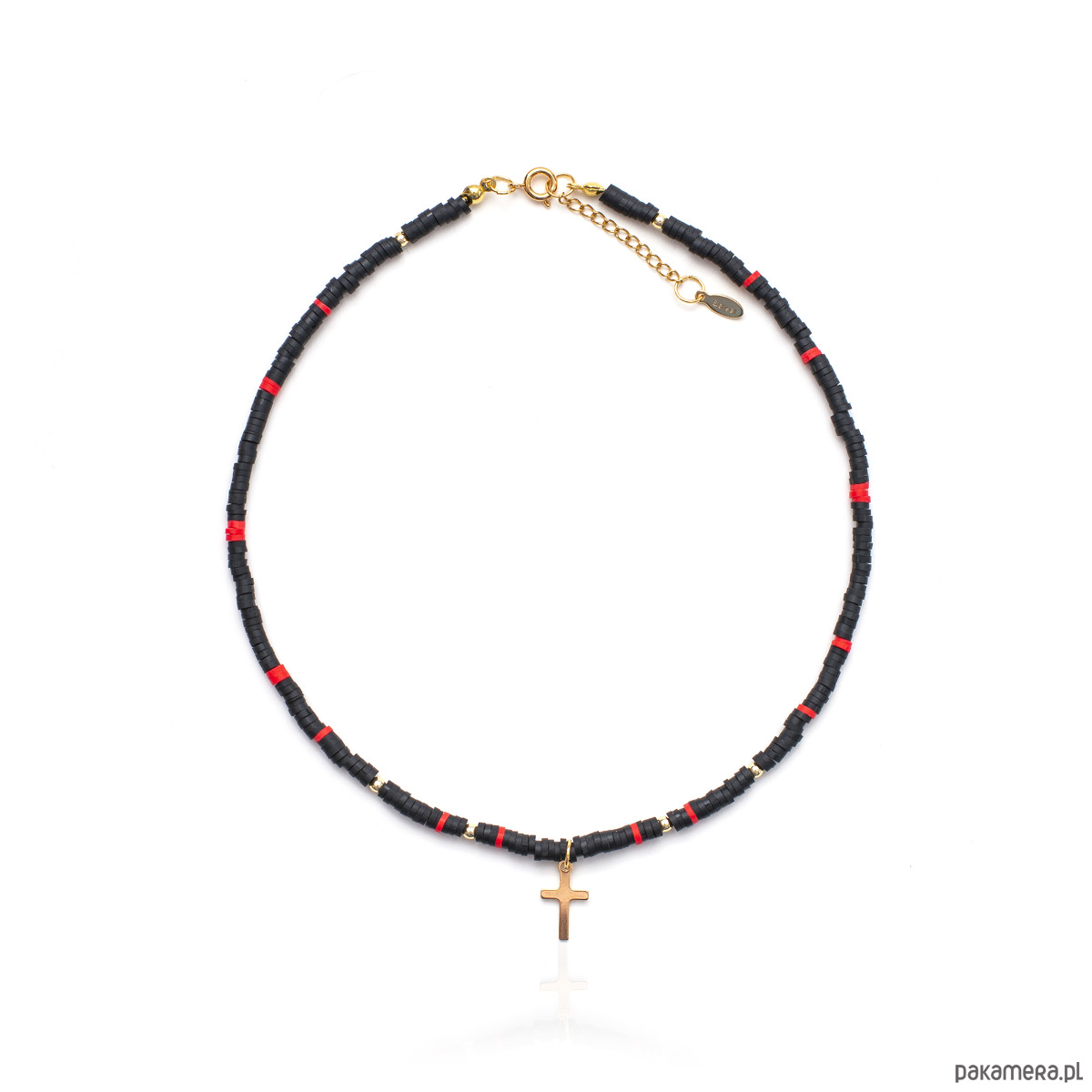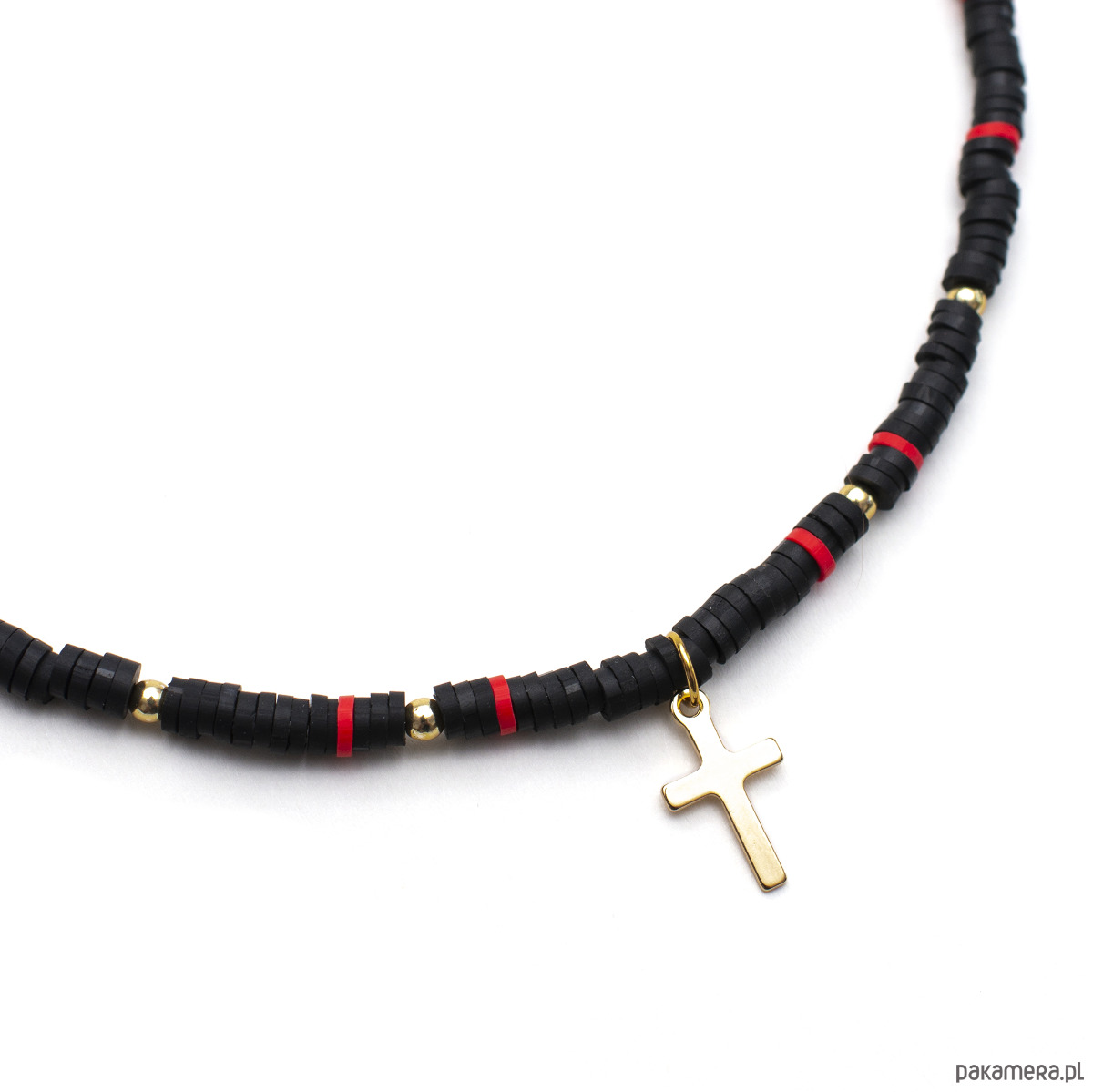 Połączenie czerni i czerwieni symbolizuje pasję i wewnętrzną siłę, która dodaje pewności Twojemu sercu. Subtelny krzyżyk nadaje całości osobistego wymiaru, sprawiając, że biżuteria staje się czymś więcej niż tylko dodatkiem – jest wyrazem Twoich wartości i niezależności. Regularny rytm kolorystyczny koralików Heishi pomaga wprowadzić porządek i wspiera jasność umysłu. Dynamika barw pobudza do działania i kreatywnego myślenia, czyniąc ten naszyjnik doskonałym towarzyszem letnich podróży i nowych wyzwań. Podstawą naszyjnika jest solidna linka jubilerska, która gwarantuje bezpieczeństwo i komfort noszenia. Wszystkie elementy metalowe, w tym zawieszka i ozdobne kuleczki, zostały wykonane ze stali nierdzewnej, co zapewnia trwałość koloru i odporność na letnie warunki.