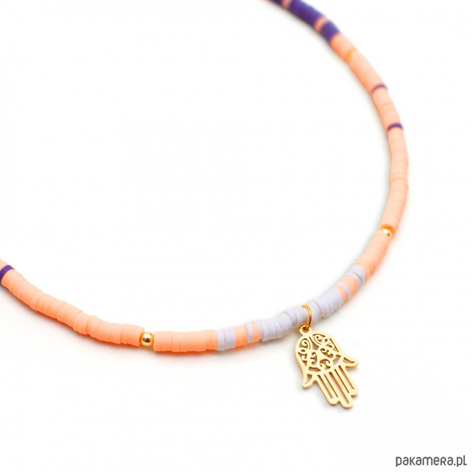Ażurowa ręka Fatimy, zwana Hamsą, jest uznawana za symbol, który przyciąga dobro i chroni przed negatywnymi wibracjami. W połączeniu z ciepłymi odcieniami brzoskwini, naszyjnik ten buduje poczucie wewnętrznego spokoju i optymizmu, przypominając o słońcu nawet w pochmurne dni. Noszenie symbolu Hamsy sprzyja koncentracji na pozytywnych aspektach życia i wzmacnia jasność umysłu. Pastelowa kolorystyka koralików pozwala na chwilę wytchnienia i kreatywną zabawę modą, zachęcając do wyrażania swojej unikalnej osobowości poprzez warstwowe zestawienia biżuterii. Naszyjnik został wykonany na wytrzymałej lince jubilerskiej, co gwarantuje jego trwałość podczas letnich aktywności. Złote elementy, w tym misterna zawieszka, wykonane są ze stali nierdzewnej, co zapewnia odporność na ciemnienie i jest przyjazne dla skóry, pozwalając Ci cieszyć się blaskiem przez całe lato.