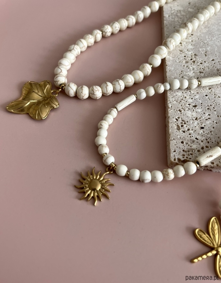 Naszyjnik Sun to subtelny i kobiecy naszyjnik wykonany z naturalnego kamienia – howlitu w kolorze ecru.  Całość dopełniają elementy oraz zapięcie ze stali chirurgicznej, która jest odporna na korozję, nie uczula i zachowuje blask przez długi czas.