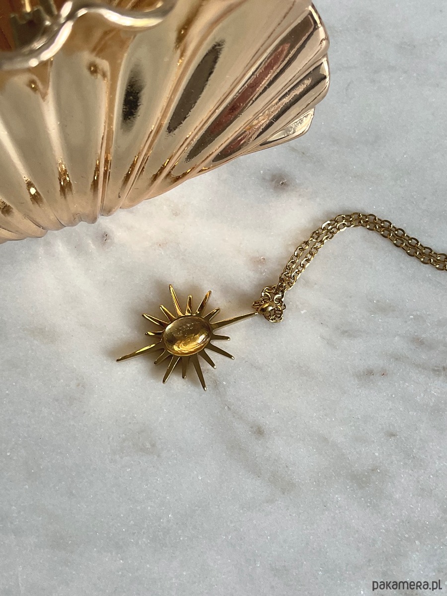 Naszyjnik kobiecy na delikatnym łańcuszku z zawieszką z motywem słońca z kryształem górskim w centrum. Całość wykonana jest ze stali szlachetnej.