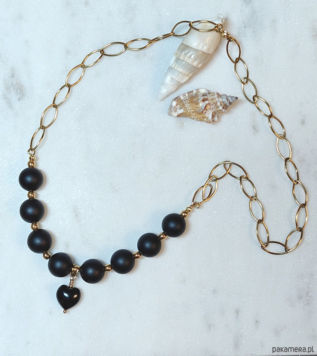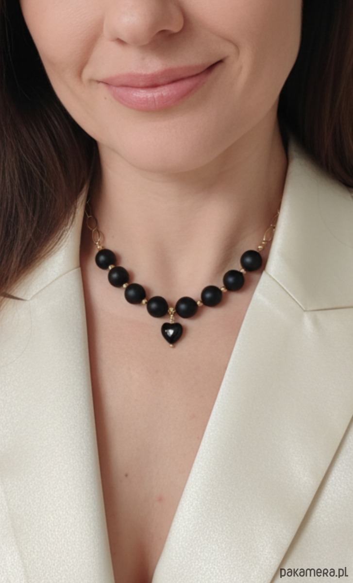 Stylowy i wyrazisty naszyjnik, idealny do wielu stylizacji. Z efektownymi, dużymi kulami matowego onyksu. Kamienie są zawieszone na łańcuchu, dzięki czemu mimo dużego rozmiaru naszyjnik nie jest ciężki, a w przedłużonej wersji zgrabnie się prezentuje. Zawieszka to serduszko z polerowanego onyksu,kształtne, pełne, urokliwe.