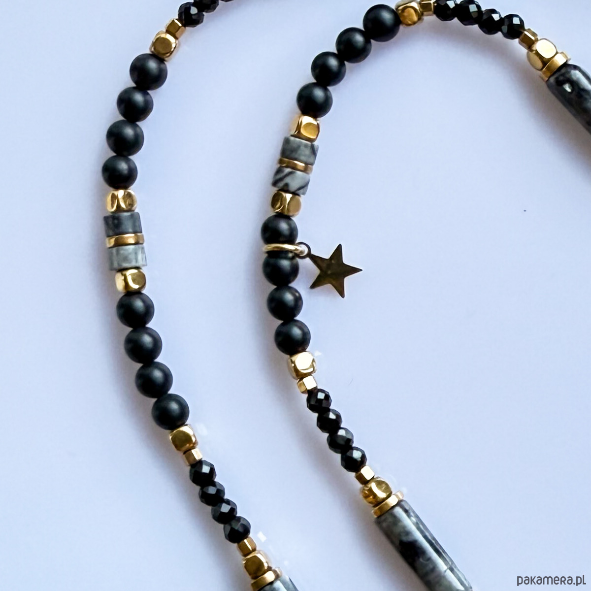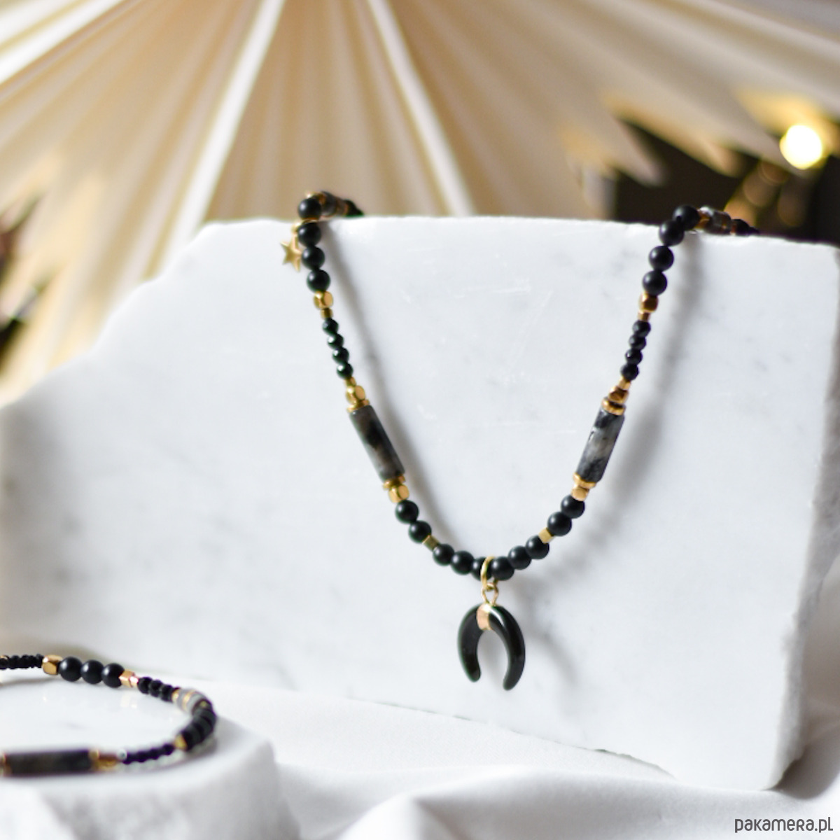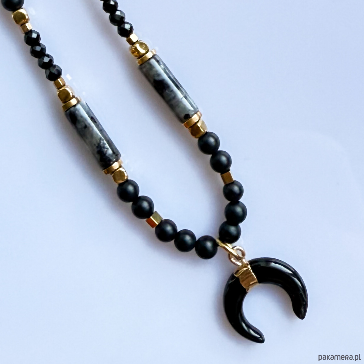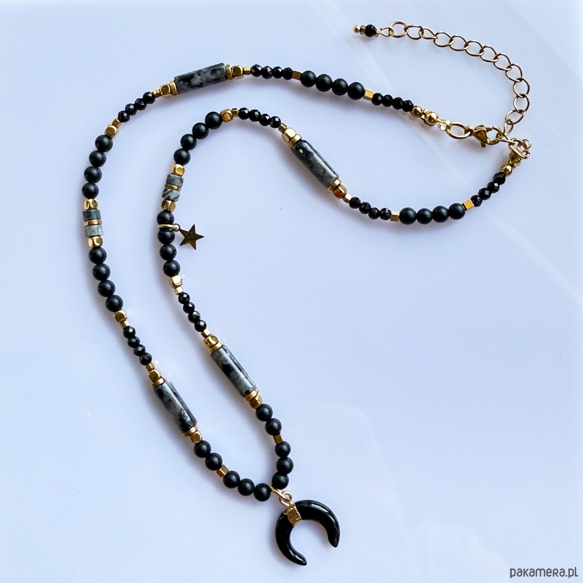 Unikatowy, ręcznie wykonany naszyjnik stworzony z naturalnych kamieni o głębokiej, eleganckiej kolorystyce. Połączenie onyksu, turmalinu, szarego jaspisu i larvikitu zostało wzbogacone złotymi hematytami, które dodają całości subtelnego blasku. Całość dopełniają delikatne zawieszki w kształcie księżyca i gwiazdki, nadające biżuterii magiczny, kosmiczny charakter.