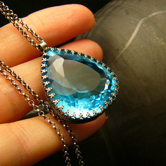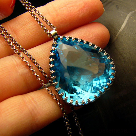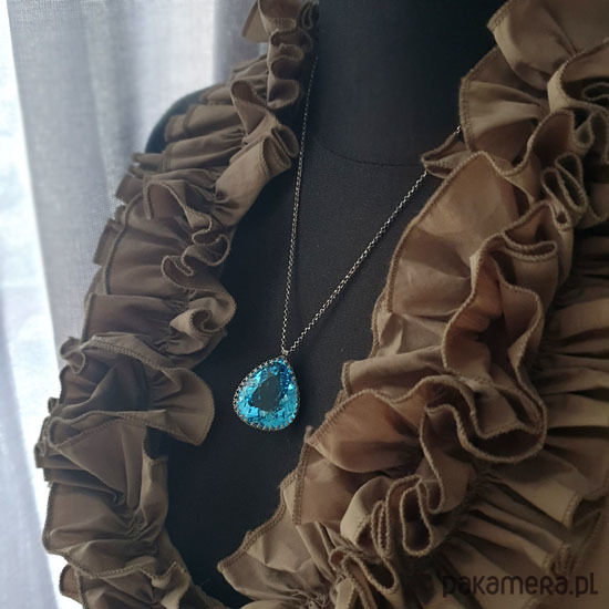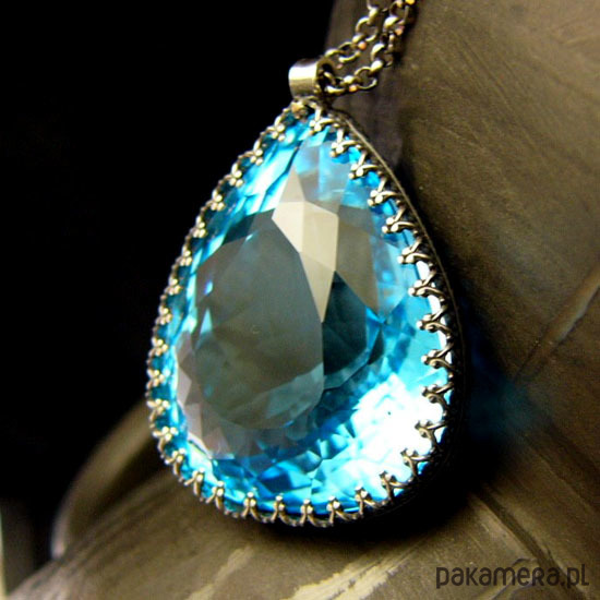 Naszyjnik którego sercem jest przepięknej urody ogromny Topaz w kolorze Swiss Blue o niesamowitym szlifie otulony w srebrne koronki w wadze 65 ct - karat. Wisior jest dwustronny. Całość wykonana ręcznie na srebrze próby 925, oksydowana przetarta i wypolerowana na wysoki połysk. Długość całkowita wisiora 3 cm, szerokość 2,3 cm. Łańcuszek o długości 70 cm w tym 5 cm regulacji. Topaz jest kamieniem umysłu ma zdolność dodawania siły swojemu posiadaczowi. Unikat. Zdjęcie wykonane na manekinie o rzeczywistych ludzkich rozmiarach.