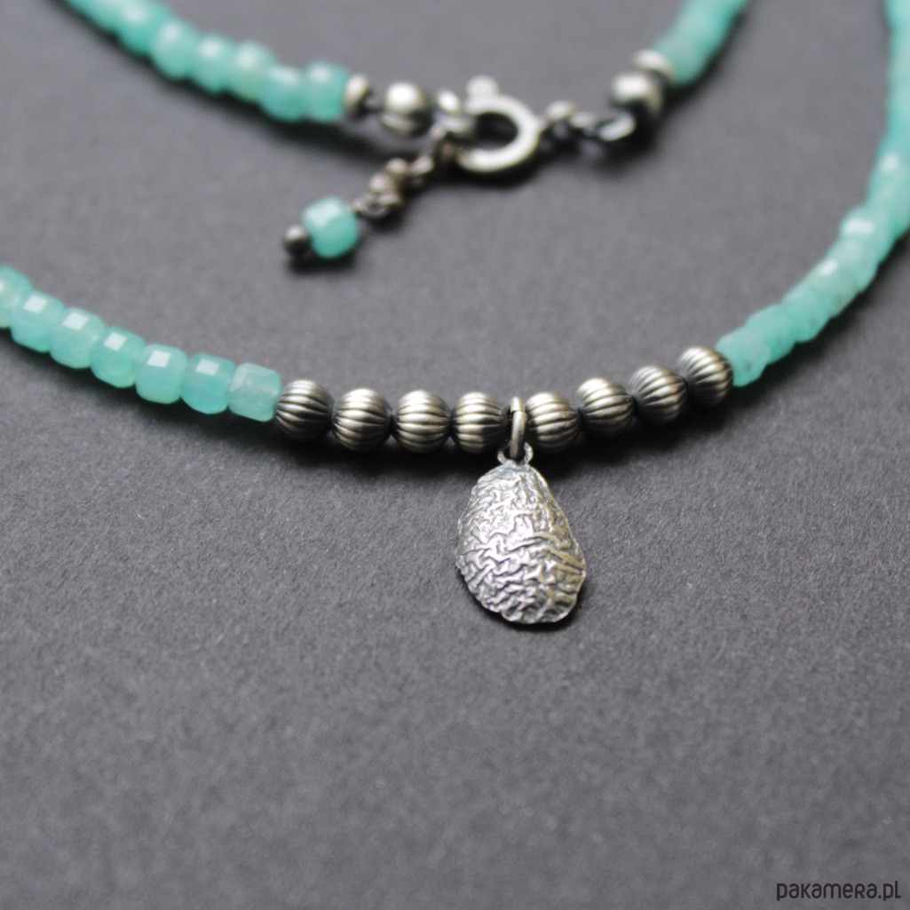 Naszyjnik zostały wykonany z oksydowanego srebra próby 925 oraz przepięknych fasetowanych kosteczek amazonitów wielkości 0,3x0,3 cm.