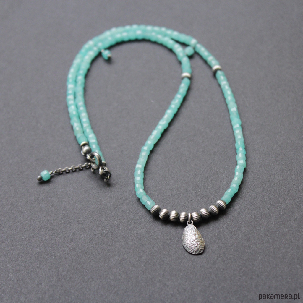 Naszyjnik zostały wykonany z oksydowanego srebra próby 925 oraz przepięknych fasetowanych kosteczek amazonitów wielkości 0,3x0,3 cm.