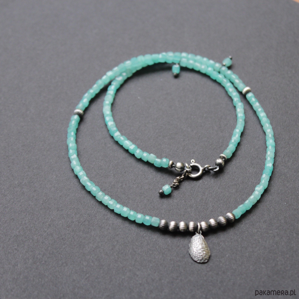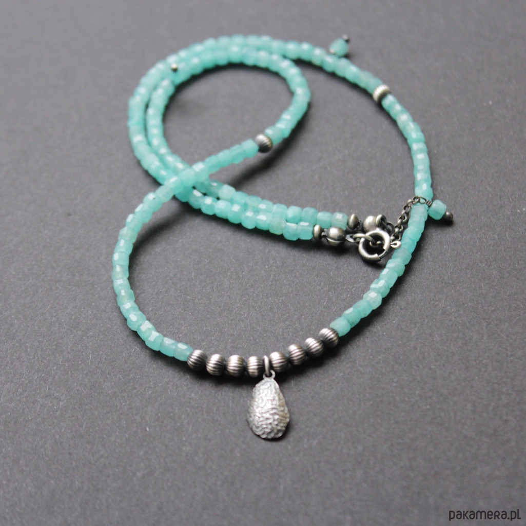 Naszyjnik zostały wykonany z oksydowanego srebra próby 925 oraz przepięknych fasetowanych kosteczek amazonitów wielkości 0,3x0,3 cm.