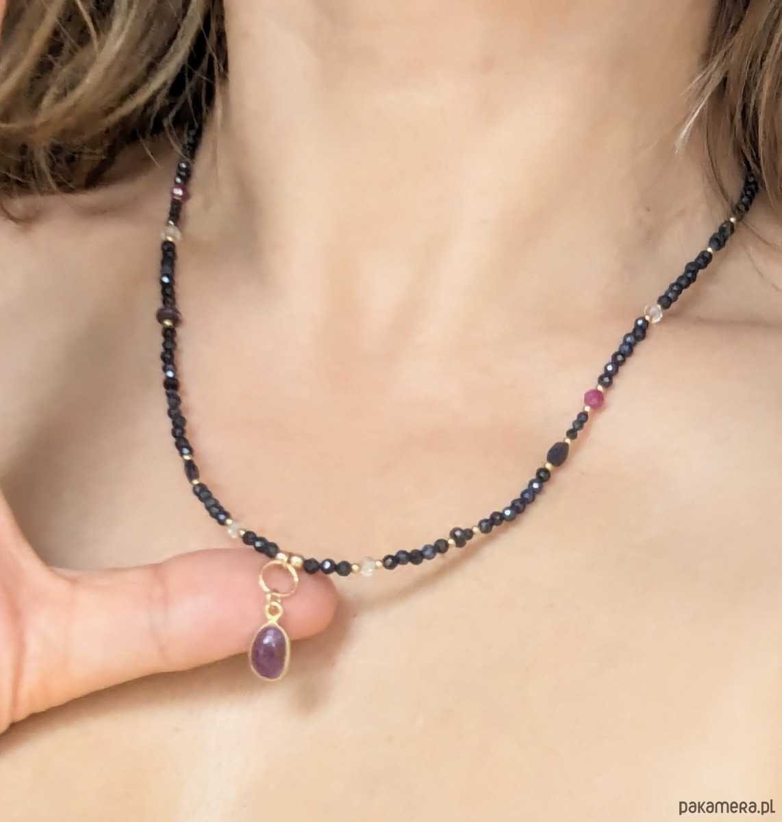 Delikatny i efektowny naszyjnik z bardzo ciemnego szafiru z akcentami innych kamieni: rubinu, kryształu górskiego i ciemnych opali etiopskich. Poszczególne elementy zostały wplecione asymetrycznie. Przy każdym ruchu i w każdym świetle któryś z minerałów ożywa, dzięki temu całość jest dynamiczna i unikalna. Stonowana kolorystyka wprowadza harmonię, zapewnia dobre dopasowanie biżuterii do różnych stylizacji. Ciemny szafir jest doskonałym towarzyszem gdyż nie podkreśla cieni (jak np. czarny kolor). Ten kamień szlachetny pięknie lśni oraz idealnie komponuje się z dodatkami wykonanymi ze złota gold filled.