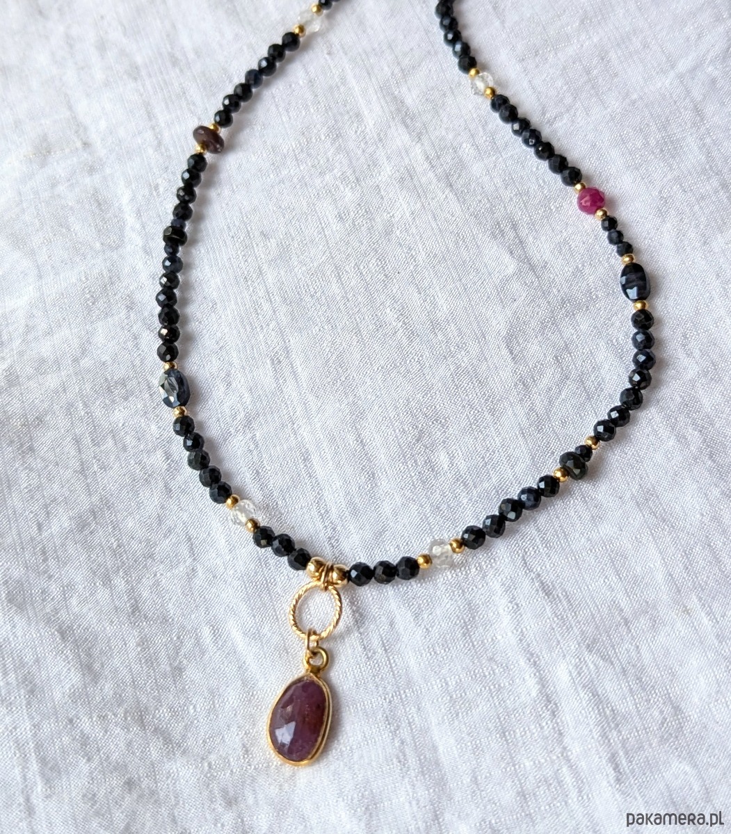 Delikatny i efektowny naszyjnik z bardzo ciemnego szafiru z akcentami innych kamieni: rubinu, kryształu górskiego i ciemnych opali etiopskich. Poszczególne elementy zostały wplecione asymetrycznie. Przy każdym ruchu i w każdym świetle któryś z minerałów ożywa, dzięki temu całość jest dynamiczna i unikalna. Stonowana kolorystyka wprowadza harmonię, zapewnia dobre dopasowanie biżuterii do różnych stylizacji. Ciemny szafir jest doskonałym towarzyszem gdyż nie podkreśla cieni (jak np. czarny kolor). Ten kamień szlachetny pięknie lśni oraz idealnie komponuje się z dodatkami wykonanymi ze złota gold filled.