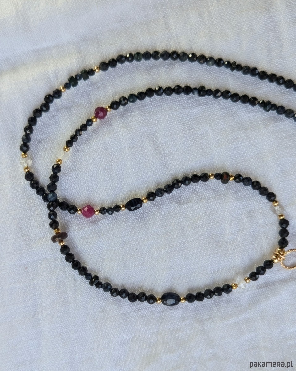 Delikatny i efektowny naszyjnik z bardzo ciemnego szafiru z akcentami innych kamieni: rubinu, kryształu górskiego i ciemnych opali etiopskich. Poszczególne elementy zostały wplecione asymetrycznie. Przy każdym ruchu i w każdym świetle któryś z minerałów ożywa, dzięki temu całość jest dynamiczna i unikalna. Stonowana kolorystyka wprowadza harmonię, zapewnia dobre dopasowanie biżuterii do różnych stylizacji. Ciemny szafir jest doskonałym towarzyszem gdyż nie podkreśla cieni (jak np. czarny kolor). Ten kamień szlachetny pięknie lśni oraz idealnie komponuje się z dodatkami wykonanymi ze złota gold filled.