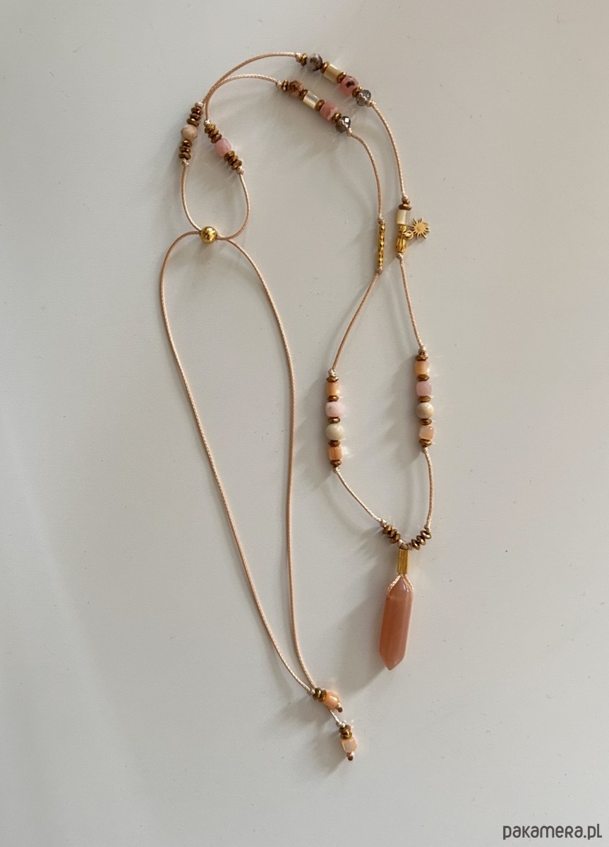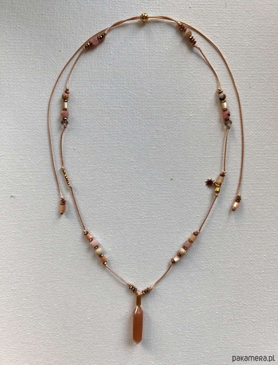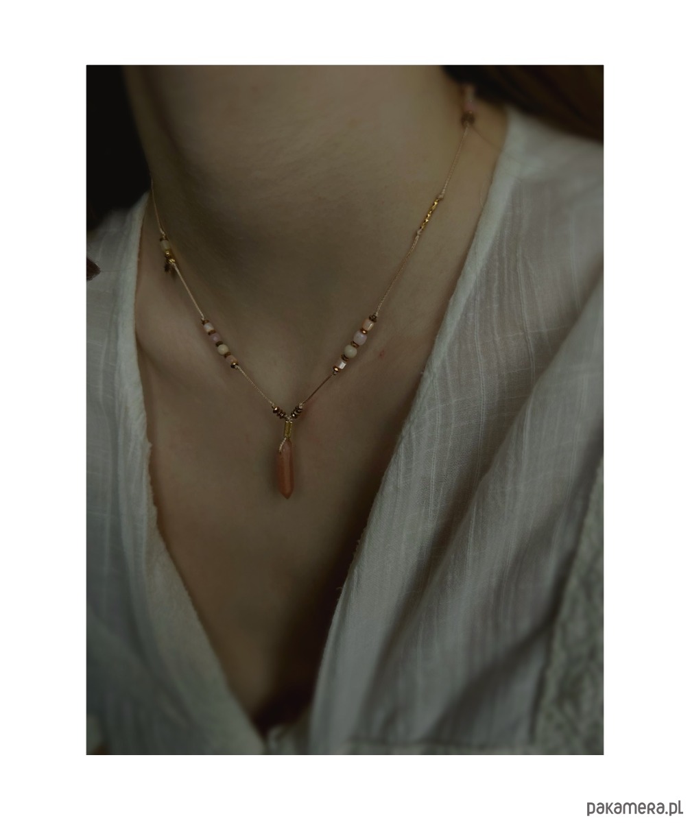 Regulowany naszyjnik z kwarcem dymnym, kamieniem słonecznym i rzecznym oraz masą perłową.Opal różowy wspiera czułość i miłość. Ożywia siłę twórczą, dodaje subtelności temu nad czym pracujemy. Łagodzi emocje. Uspokaja, równoważy energię i neutralizuje kłopoty. Poprawia nastrój i przywraca optymizm. Masa perłowa pomaga odnaleźć miłość i tworzyć piękne relacje, ma w sobie energię kobiecości i wrażliwości na piękno otaczającego świata. Kamień słoneczny przywraca pogodę ducha, rozwiewa wszelkie smutki, wnosi do życia pozytywną energię.