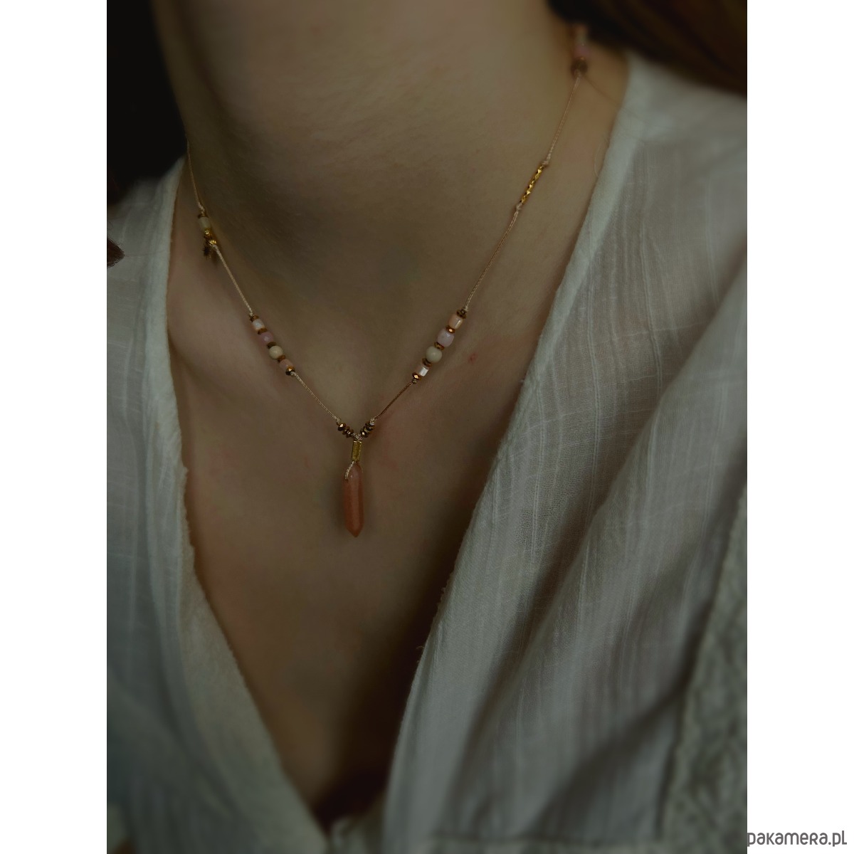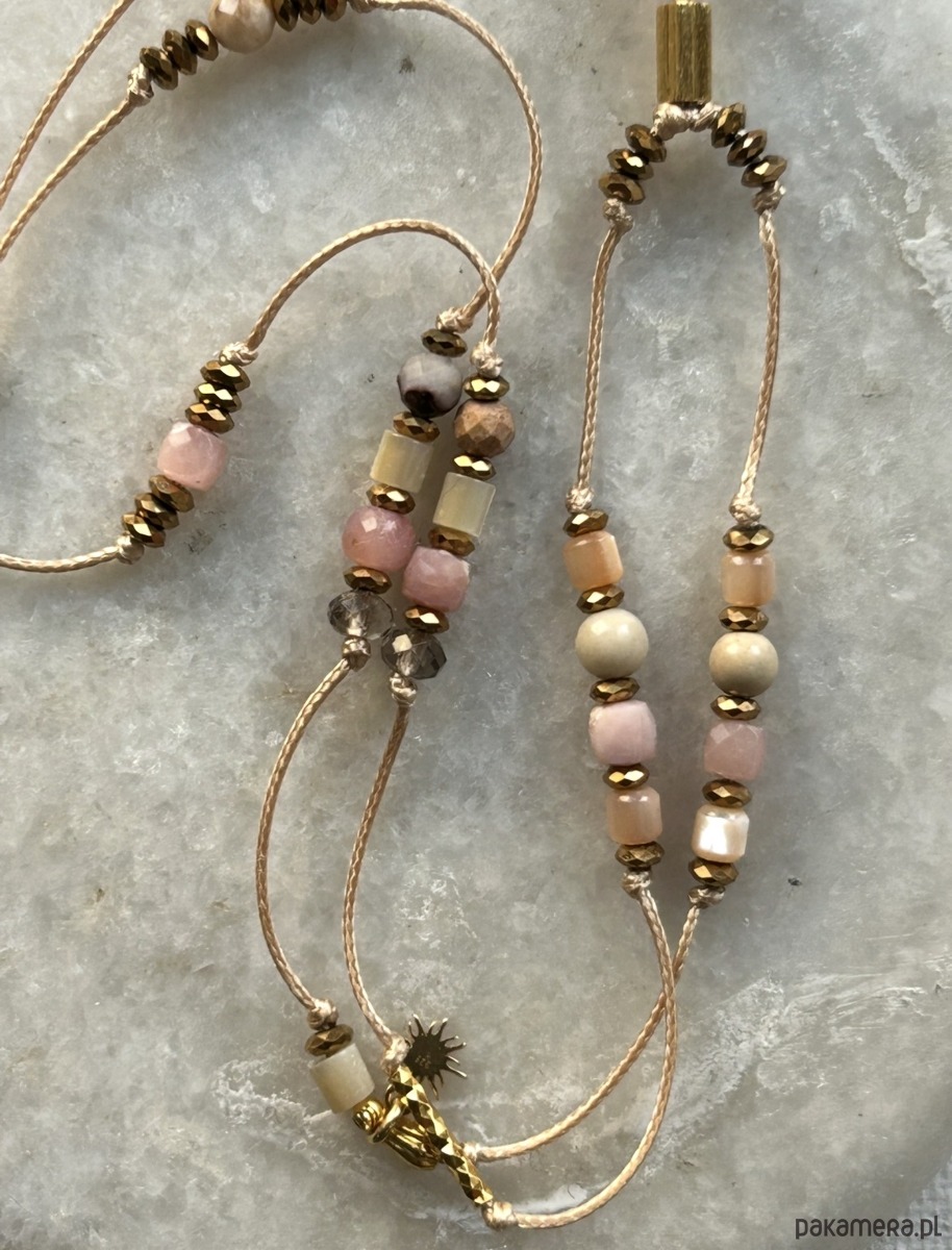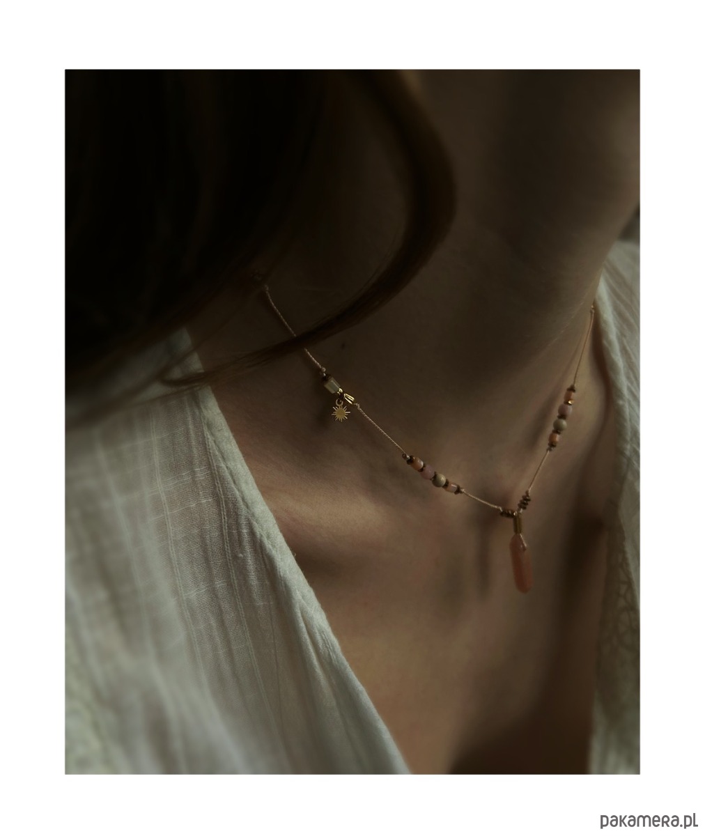 Regulowany naszyjnik z kwarcem dymnym, kamieniem słonecznym i rzecznym oraz masą perłową.Opal różowy wspiera czułość i miłość. Ożywia siłę twórczą, dodaje subtelności temu nad czym pracujemy. Łagodzi emocje. Uspokaja, równoważy energię i neutralizuje kłopoty. Poprawia nastrój i przywraca optymizm. Masa perłowa pomaga odnaleźć miłość i tworzyć piękne relacje, ma w sobie energię kobiecości i wrażliwości na piękno otaczającego świata. Kamień słoneczny przywraca pogodę ducha, rozwiewa wszelkie smutki, wnosi do życia pozytywną energię.