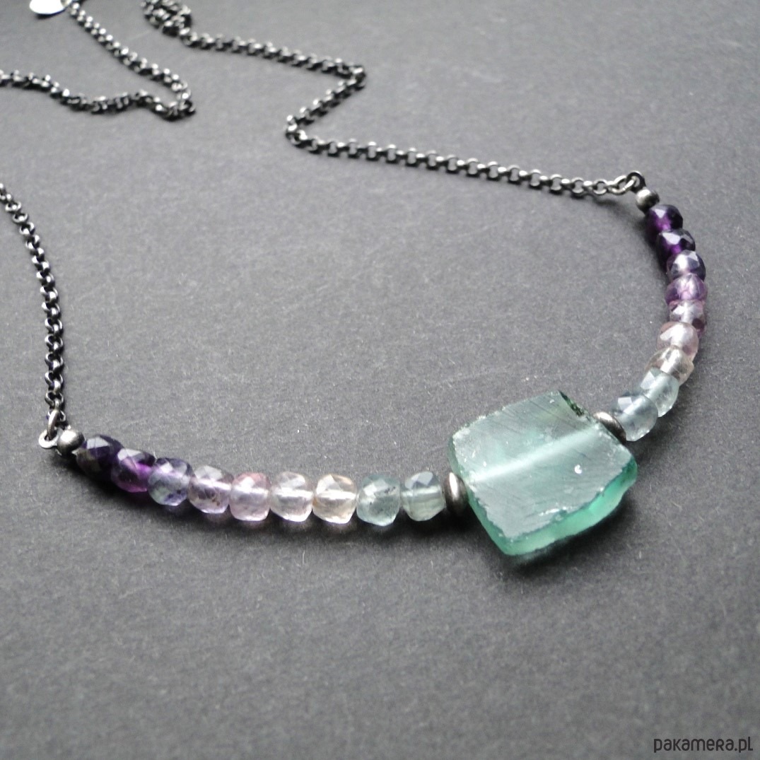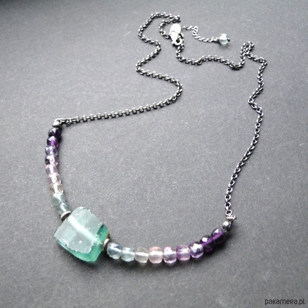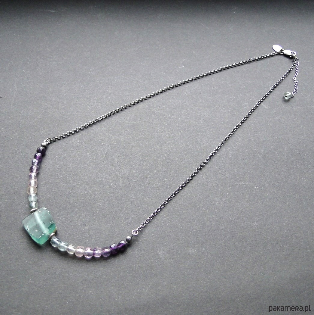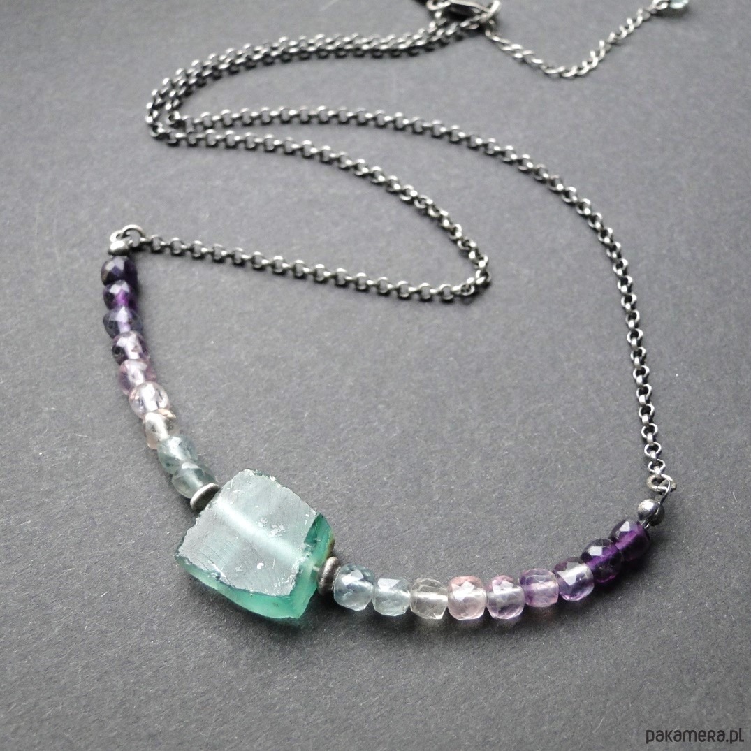 Surowy, krótki naszyjnik wykonany ze srebra 930,oksydowany i szorowany. Starożytne szkło afgańskie w kolorze miętowym, szer.17mm. Szkło pochodzi z wykopalisk w Afganistanie i jest formą starożytnych rzymskich korali, wszelkie wżery są wynikiem działania czasu. Piękne pastelowe fluoryty o wym.4x4 mm, umieszczone na lince stalowej co daje nam giętki naszyjnik. Obwód 49 cm plus 4,5 cm przedłużka. Polecam kolczyki do zestawu z fluorytem (pojedynczy egzemplarz). Naszyjnik dość delikatny,najlepiej trzymać osobno w szkatułce w woreczku.