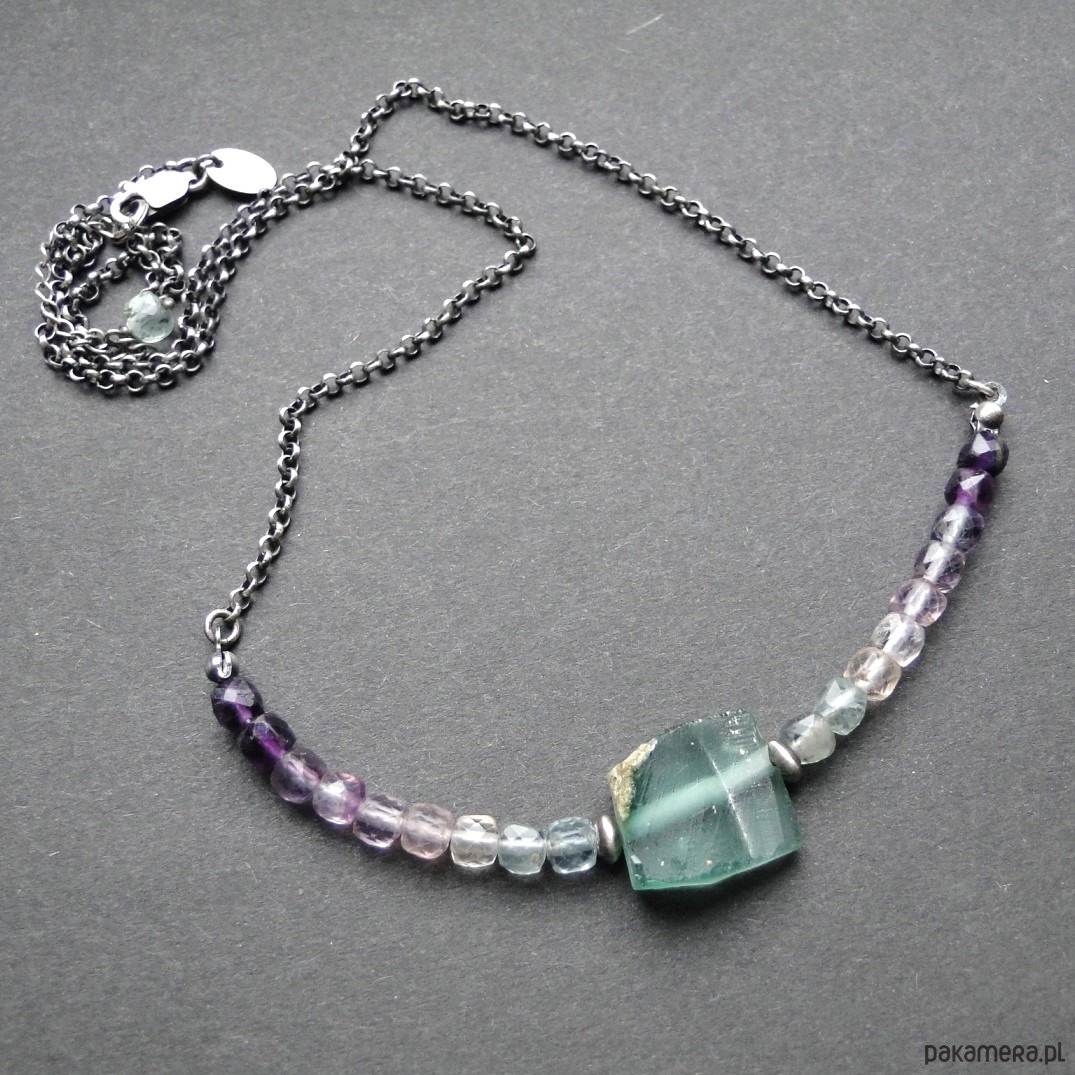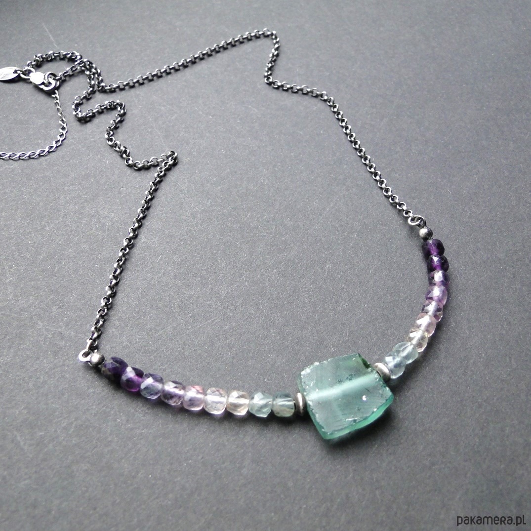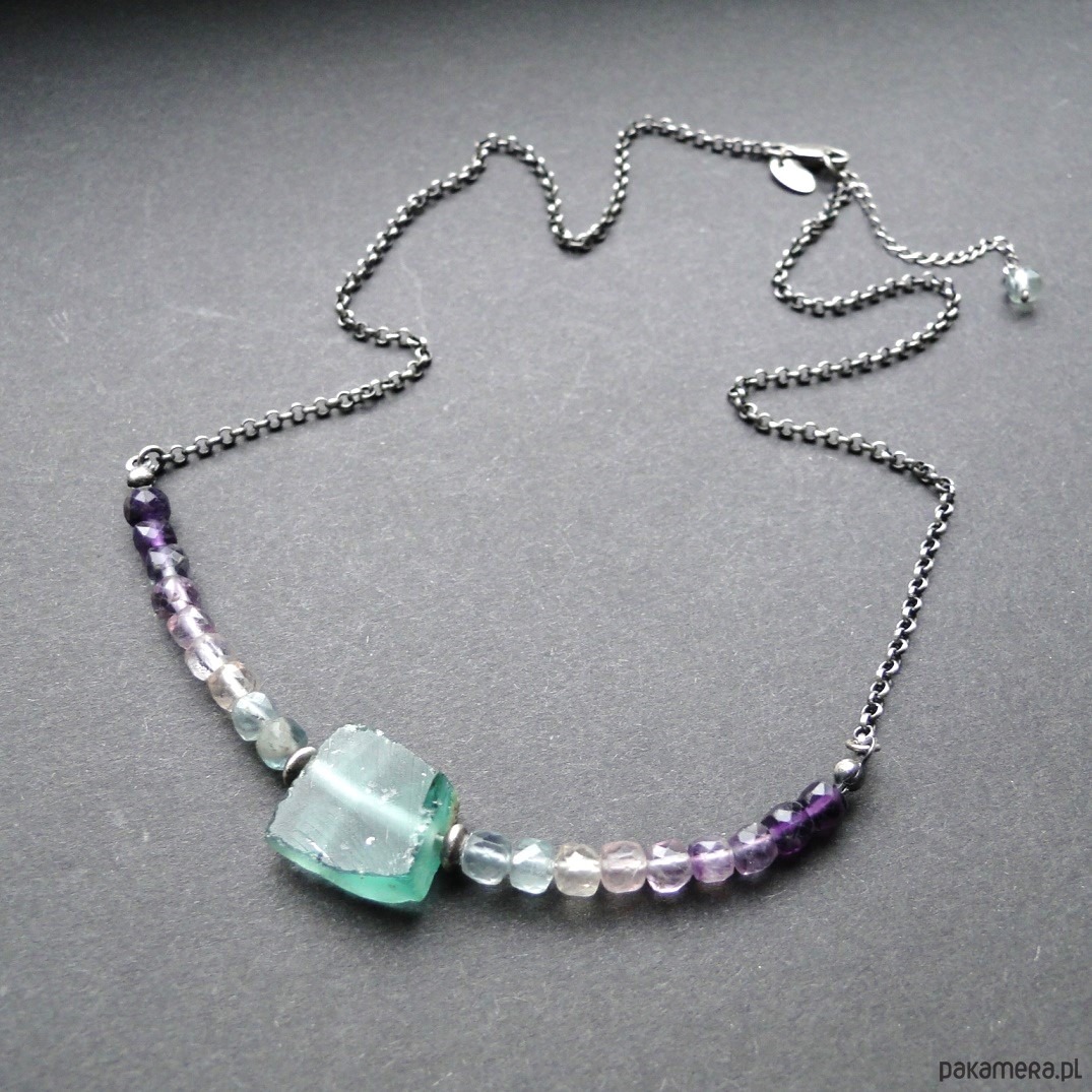 Surowy, krótki naszyjnik wykonany ze srebra 930,oksydowany i szorowany. Starożytne szkło afgańskie w kolorze miętowym, szer.17mm. Szkło pochodzi z wykopalisk w Afganistanie i jest formą starożytnych rzymskich korali, wszelkie wżery są wynikiem działania czasu. Piękne pastelowe fluoryty o wym.4x4 mm, umieszczone na lince stalowej co daje nam giętki naszyjnik. Obwód 49 cm plus 4,5 cm przedłużka. Polecam kolczyki do zestawu z fluorytem (pojedynczy egzemplarz). Naszyjnik dość delikatny,najlepiej trzymać osobno w szkatułce w woreczku.