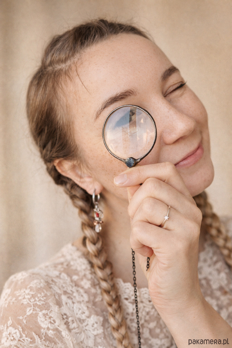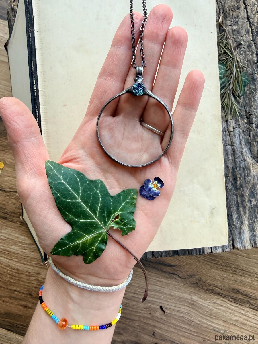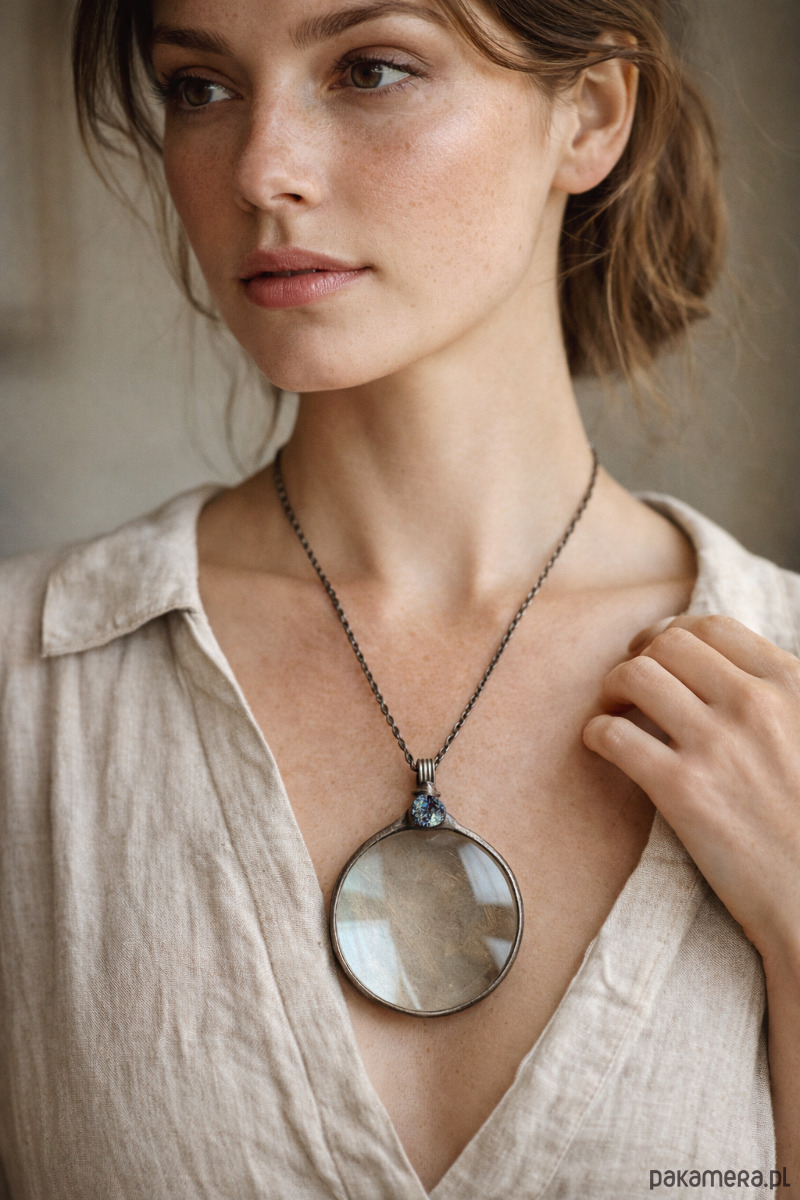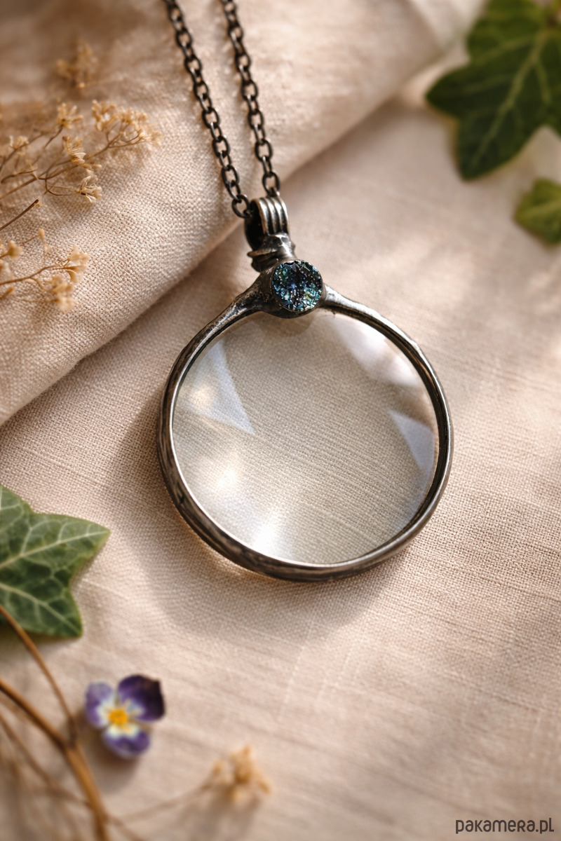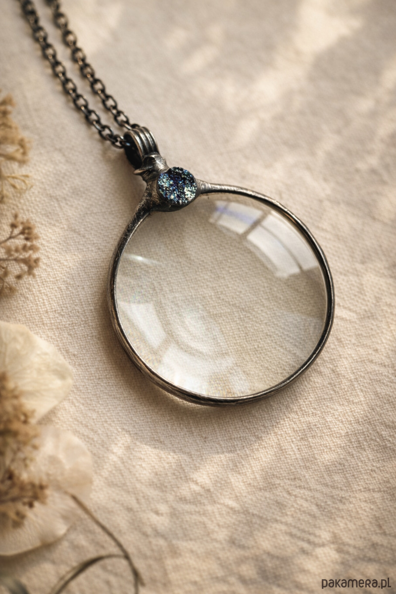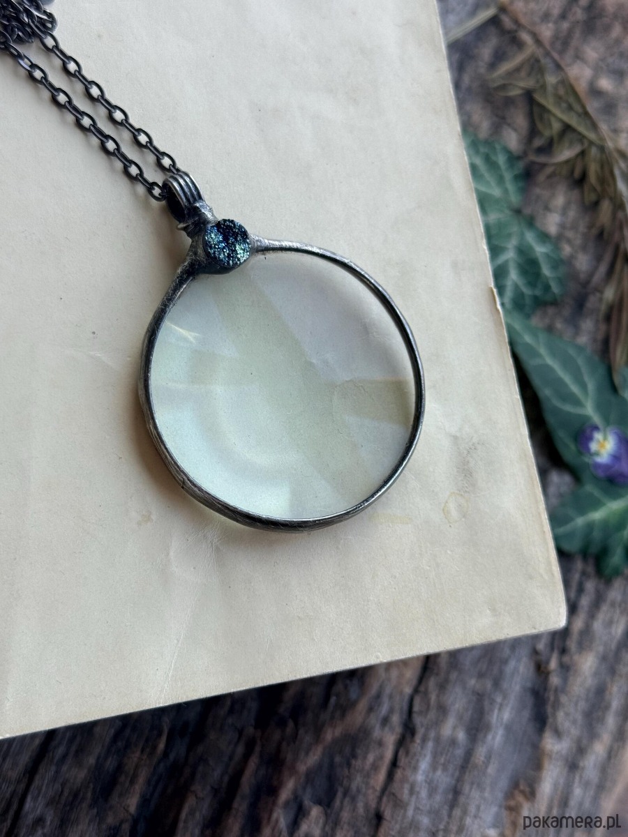 Ten naszyjnik to biżuteria z prawdziwą lupą ze szkła. Jest przeznaczony do powiększania tekstu, czytania menu, etykiet i drobnego druku.