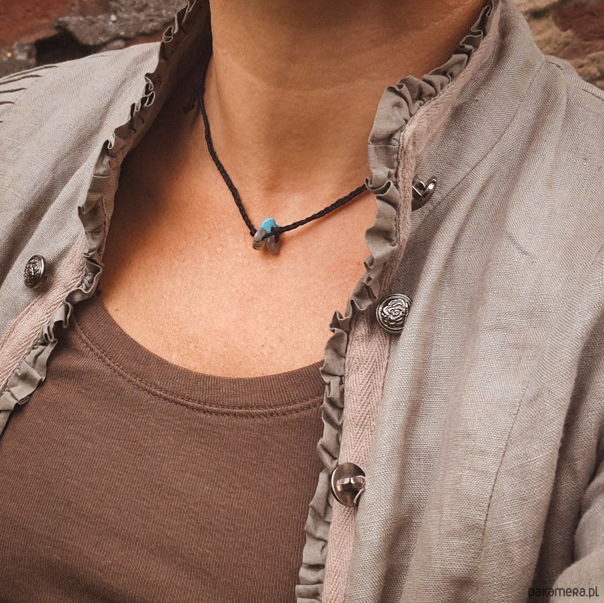Jego ozdobą są 3 nieregularne kamienie: 2 labradoryty i jeden howlit turkusowy.